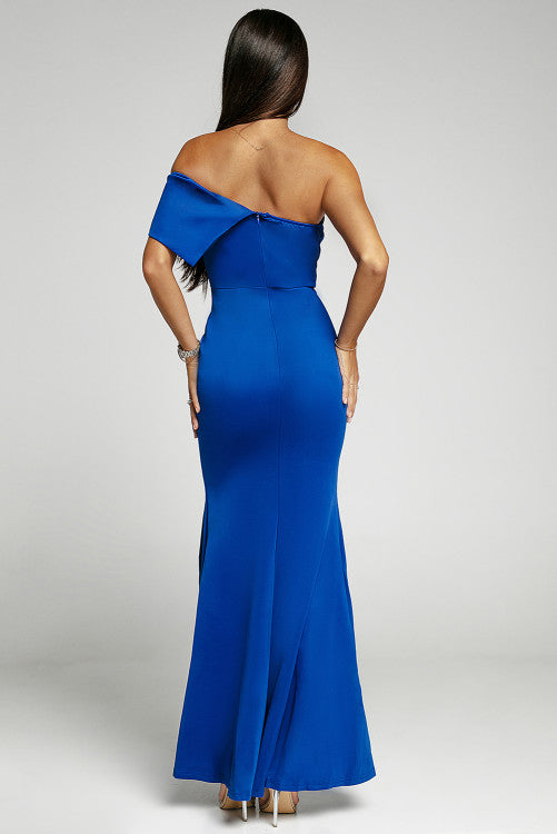 Blue Off The Shoulder One Sleeve Slit Maxi Prom Dress Moo