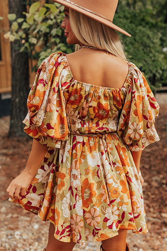 Green Ruffled Puff Short Sleeve Floral Dress