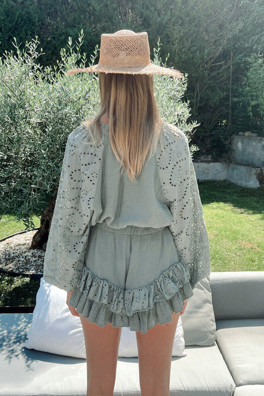 Mist Green Crinkled Eyelet Raglan Sleeve Top Ruffled Shorts Set