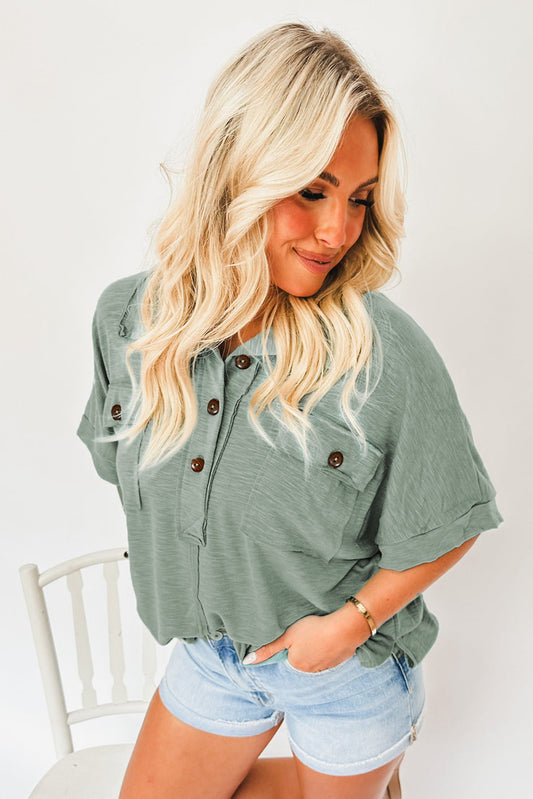Moonlight Jade Chest Pockets Half Buttoned Collared Blouse