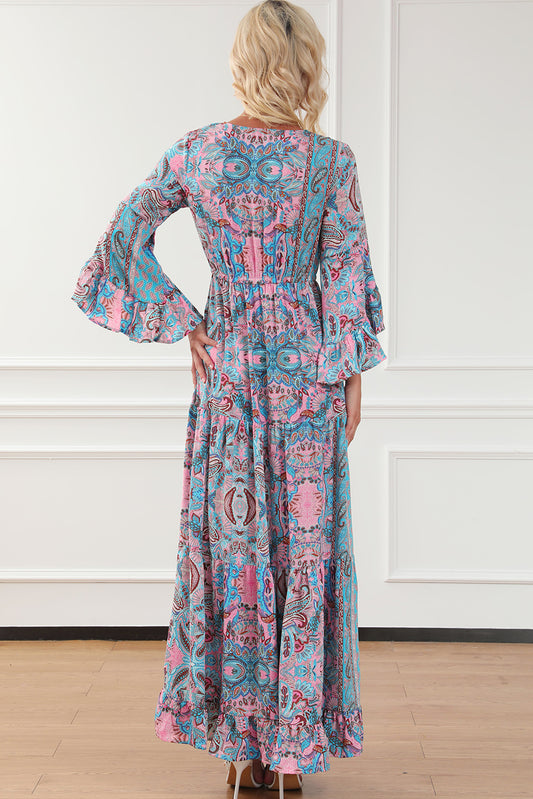 Paisley Printed Ruffle Trim Elegant Maxi Dress