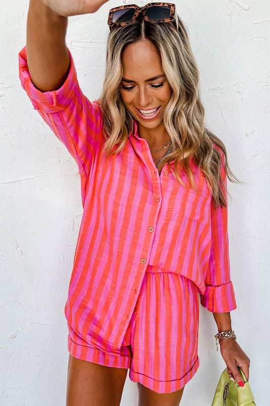 Orange Striped Print Collared Neck Shirt and Shorts Set