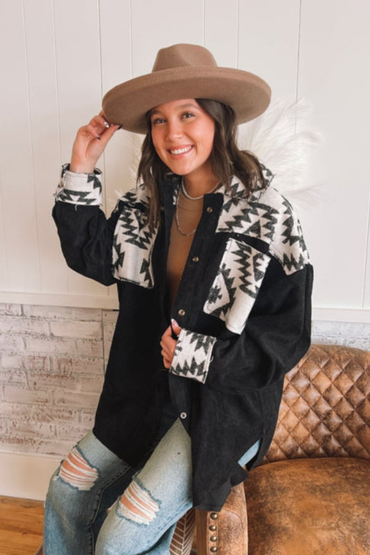 Black Aztec Patchwork Buttoned Corduroy Shacket