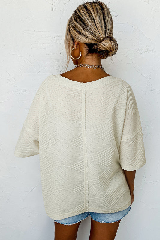 Beige Ribbed Drop Shoulder Henley Top Wide Leg Pants Set