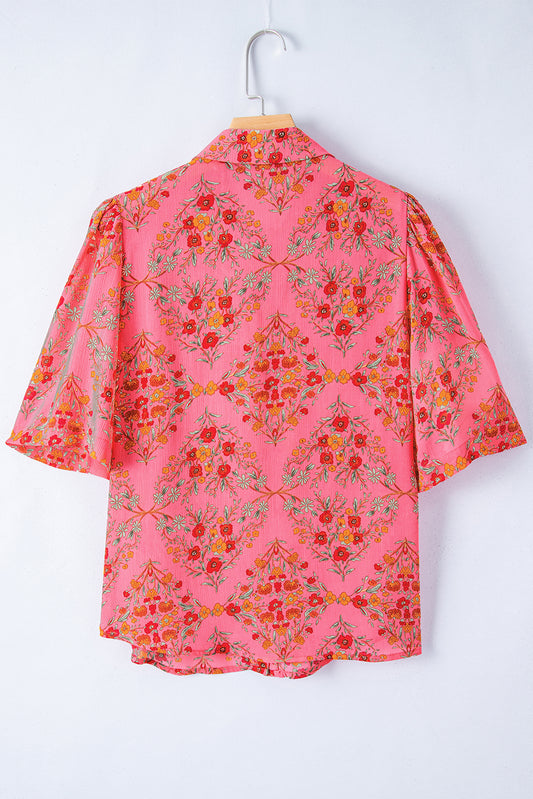 Rose Red Floral Print Wide Short Sleeve Loose Shirt