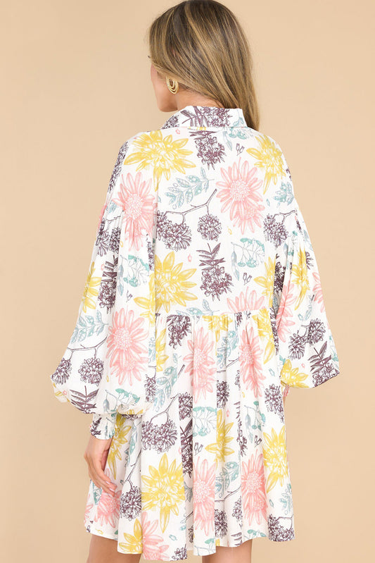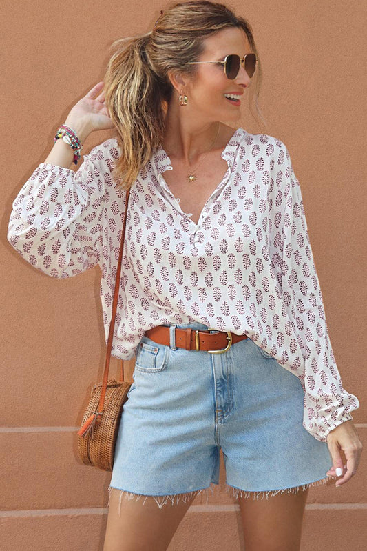 White Floral Long Sleeve Henley Top and Drawstring Shorts Set