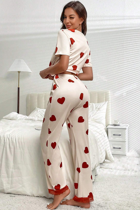 White Valentines Heart Print Lace Hem Tee Pants Pajama Set