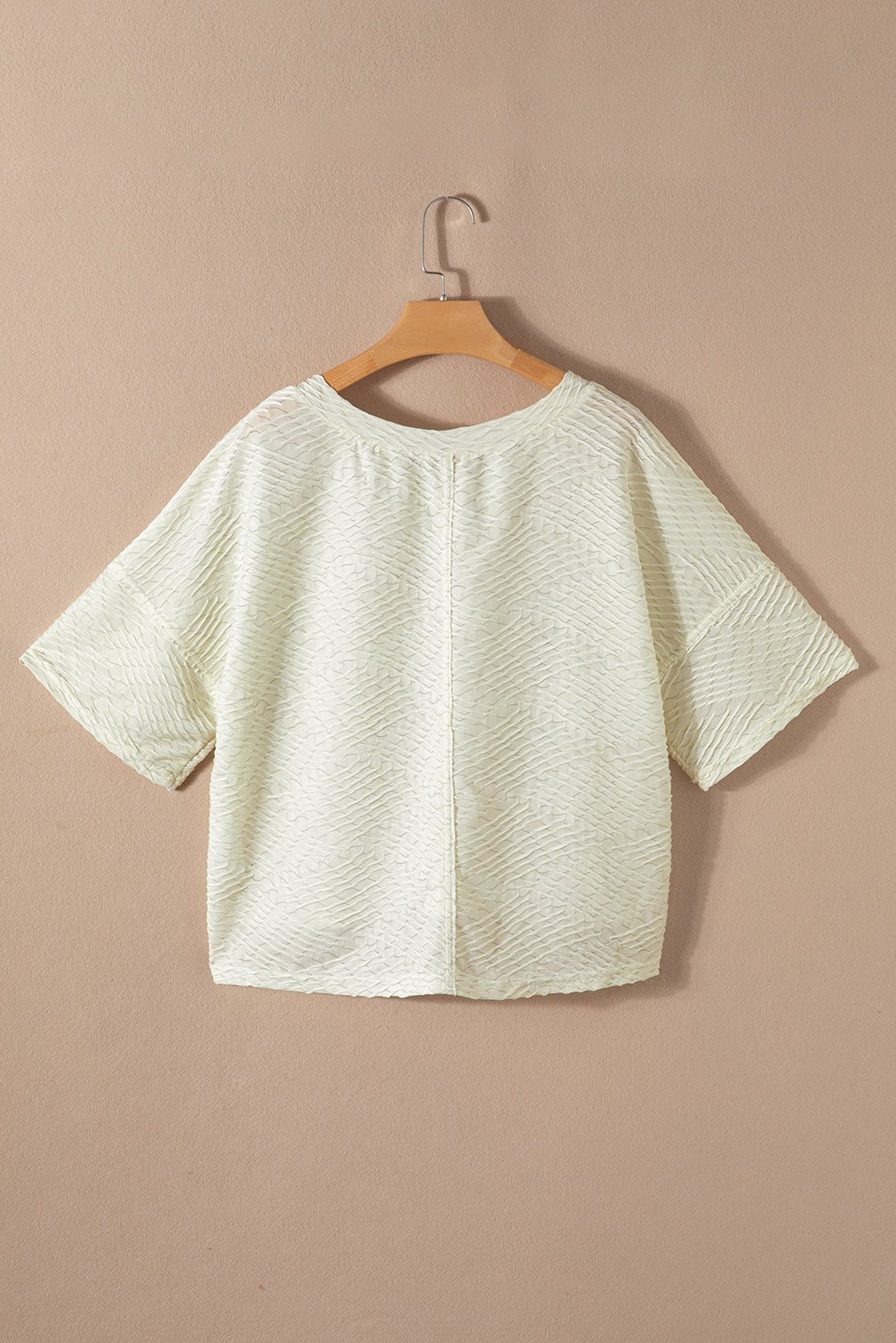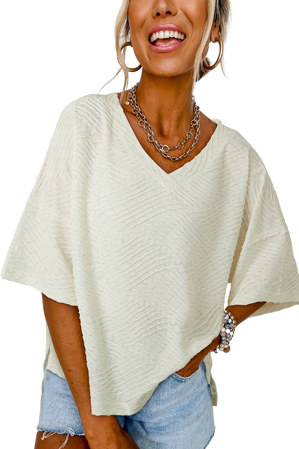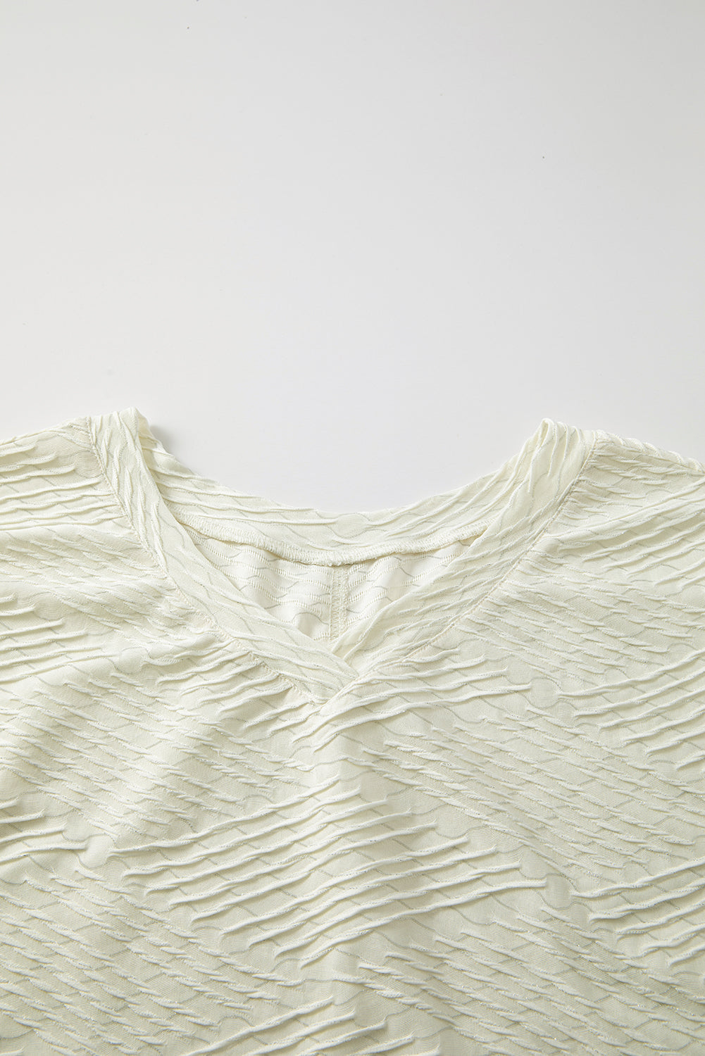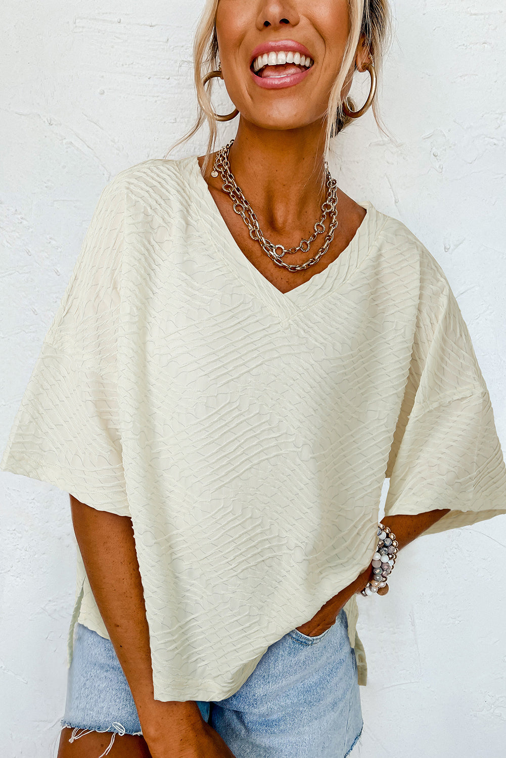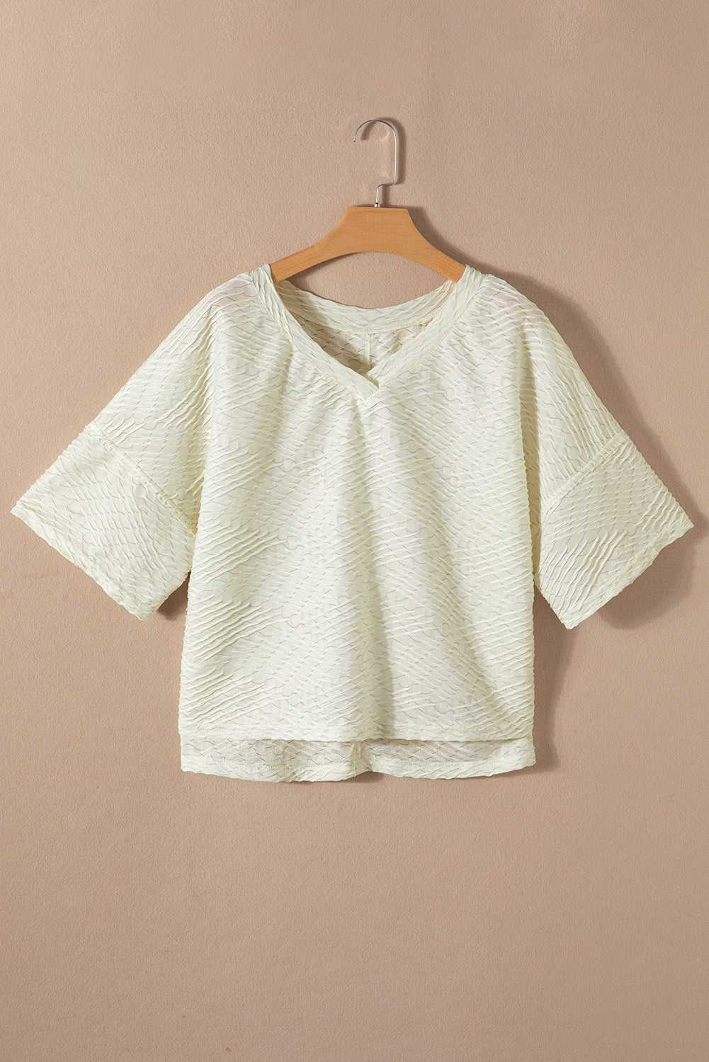 Beige V Neck Textured Split Hem Oversized Top