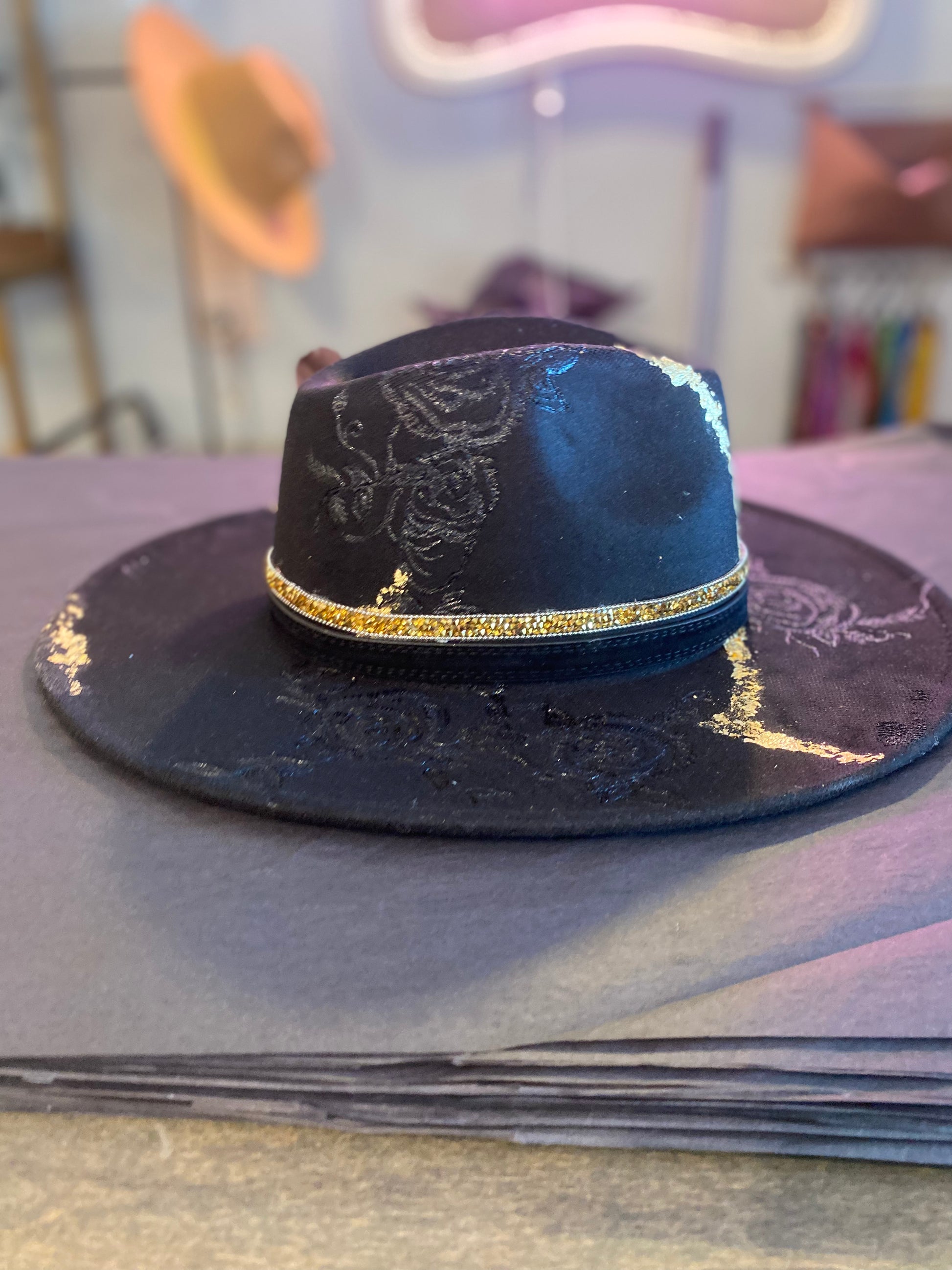 Heat engraved roses with gold flakes