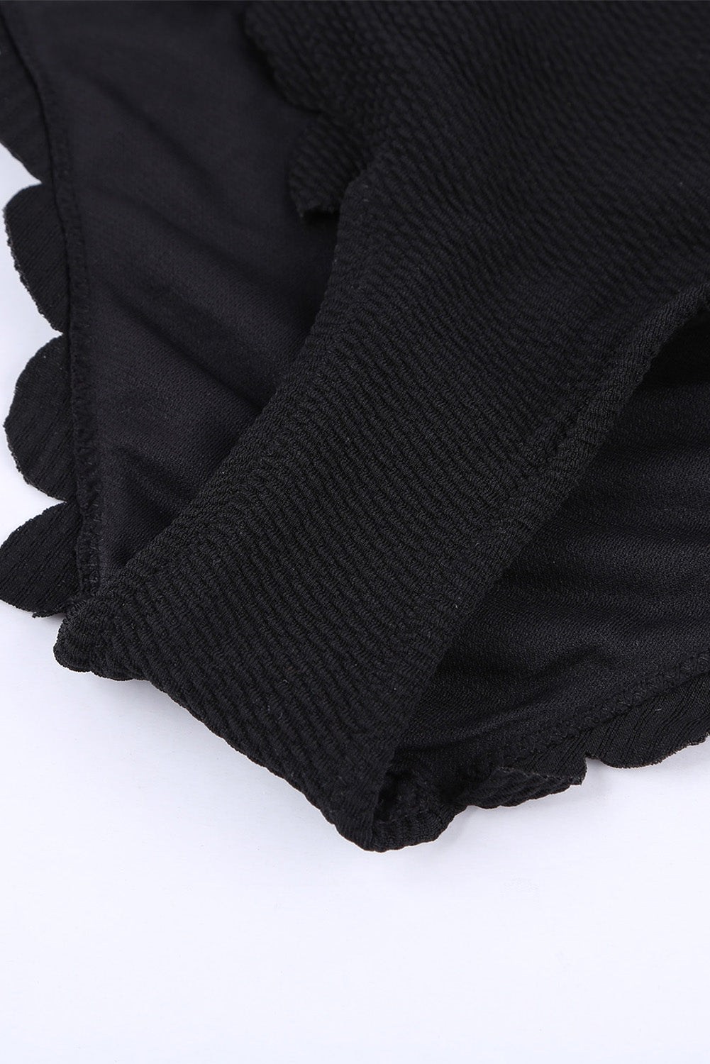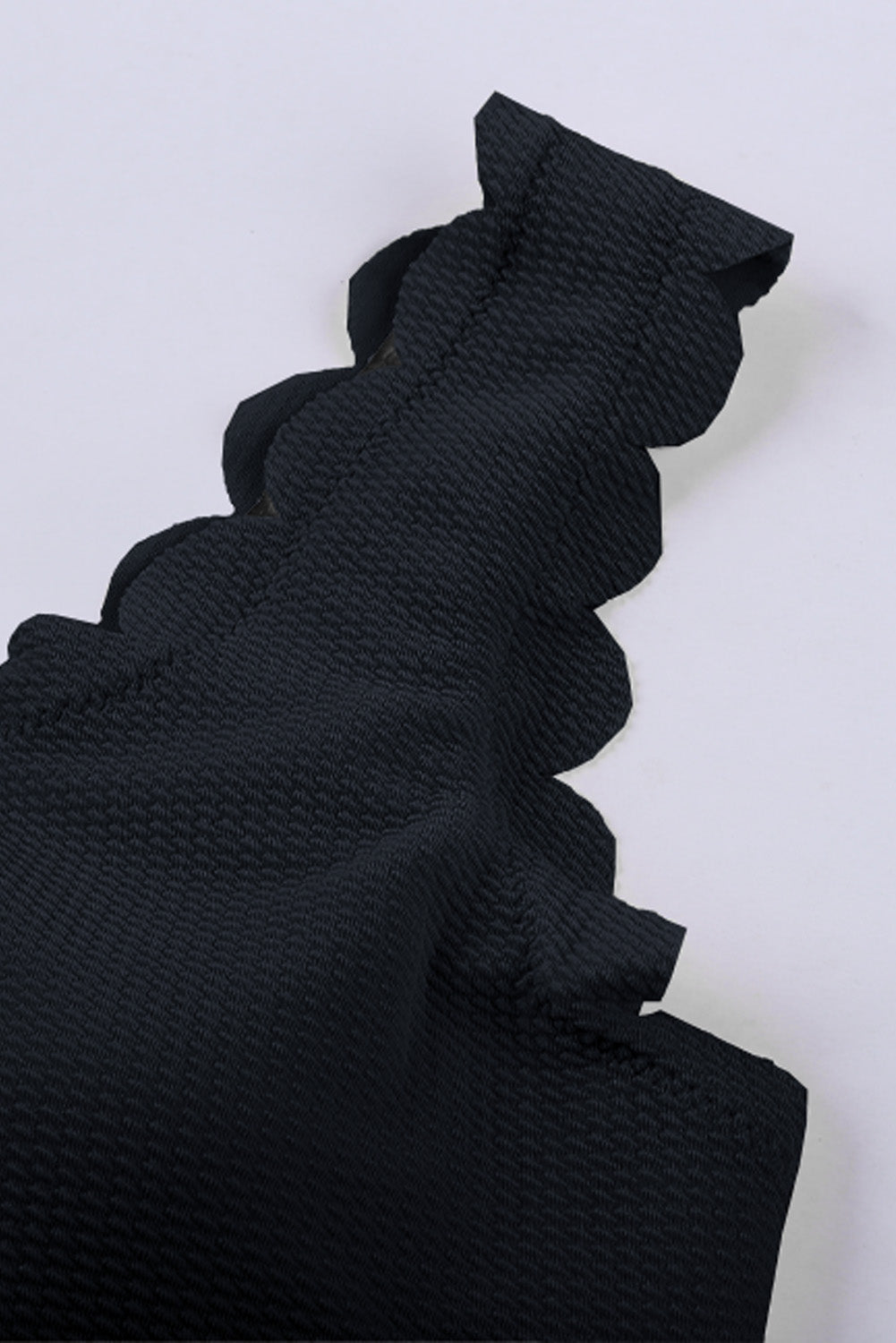 - The one-shoulder design with scalloped edges adds a trendy touch to this classic bikini style