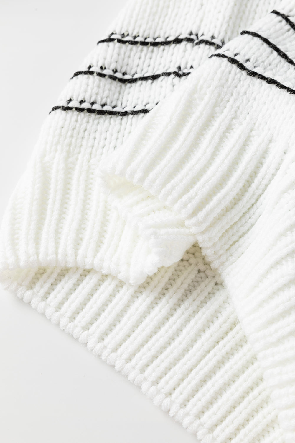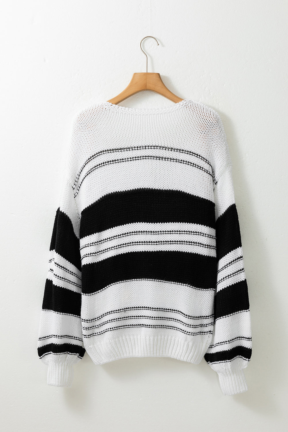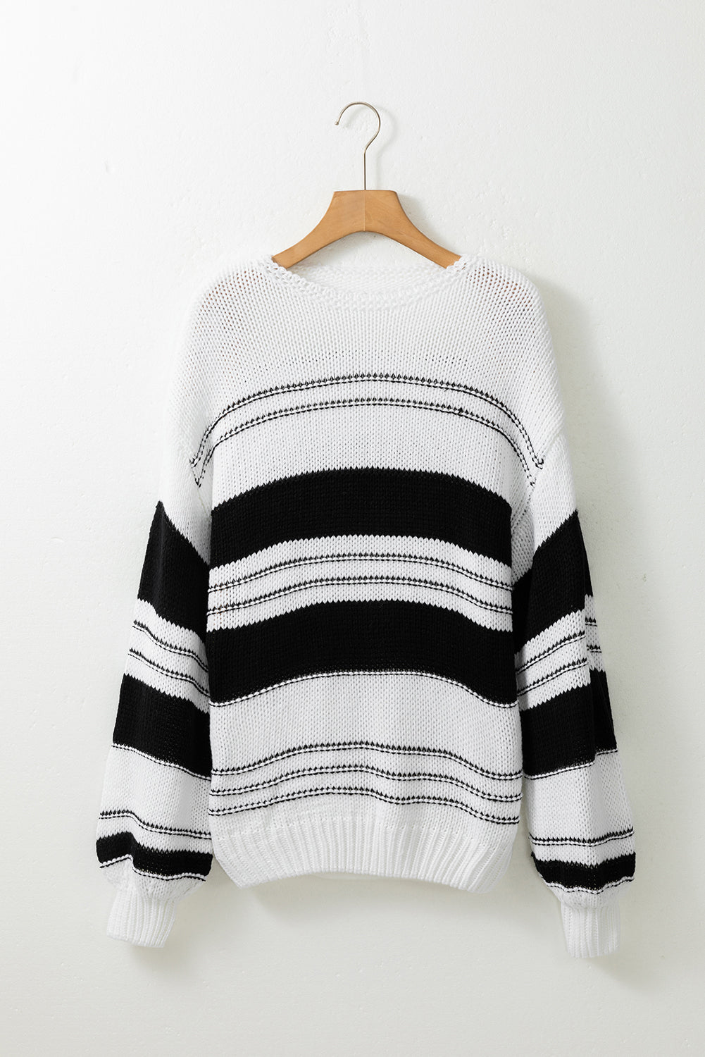 Black Stripe Striped Knit Puff Sleeve Casual Sweater