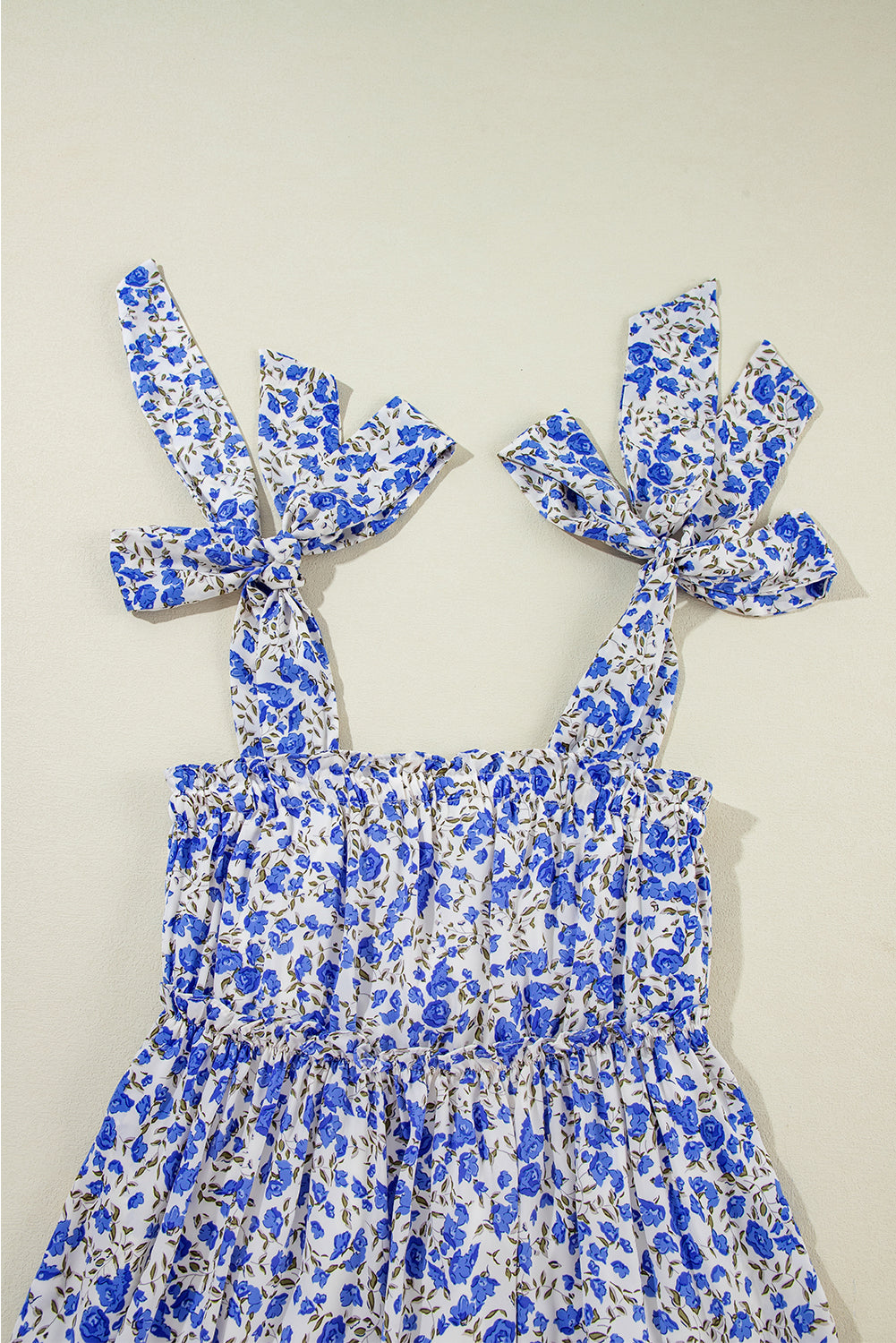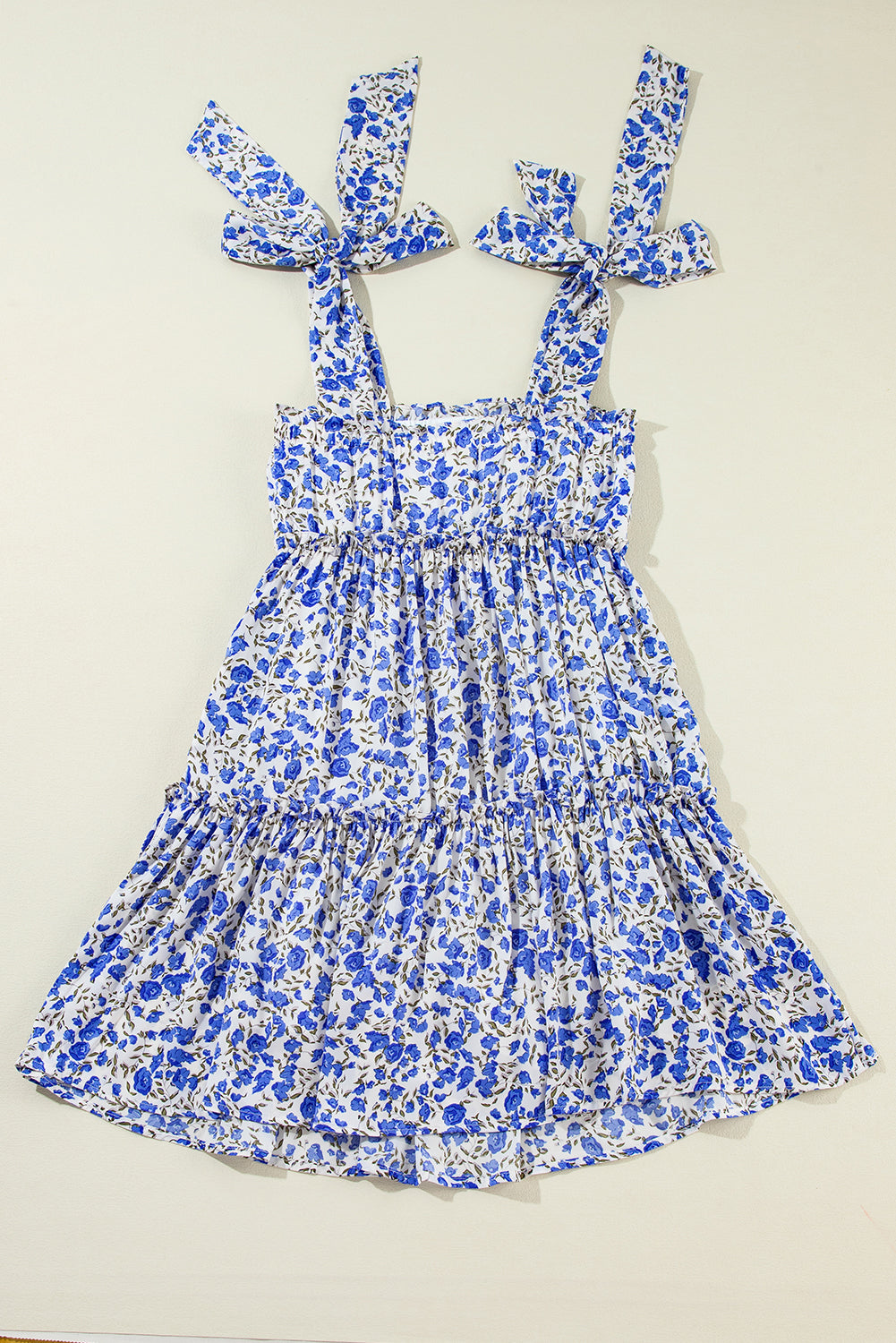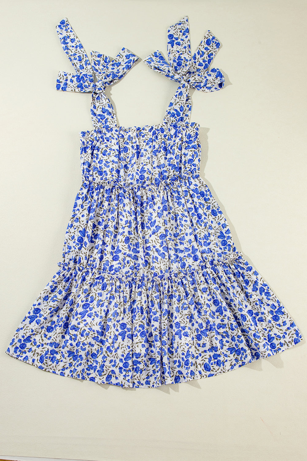 Blue Floral Knotted Straps Tiered Babydoll Dress