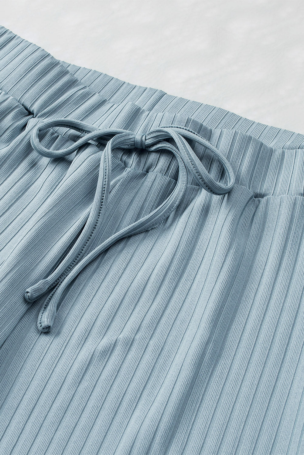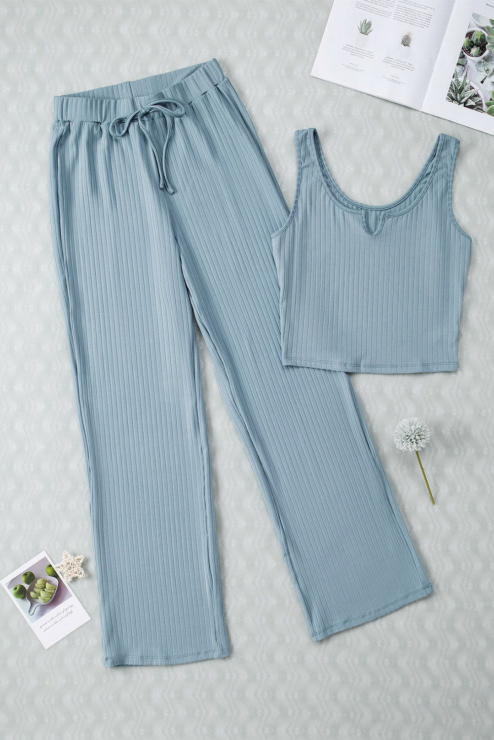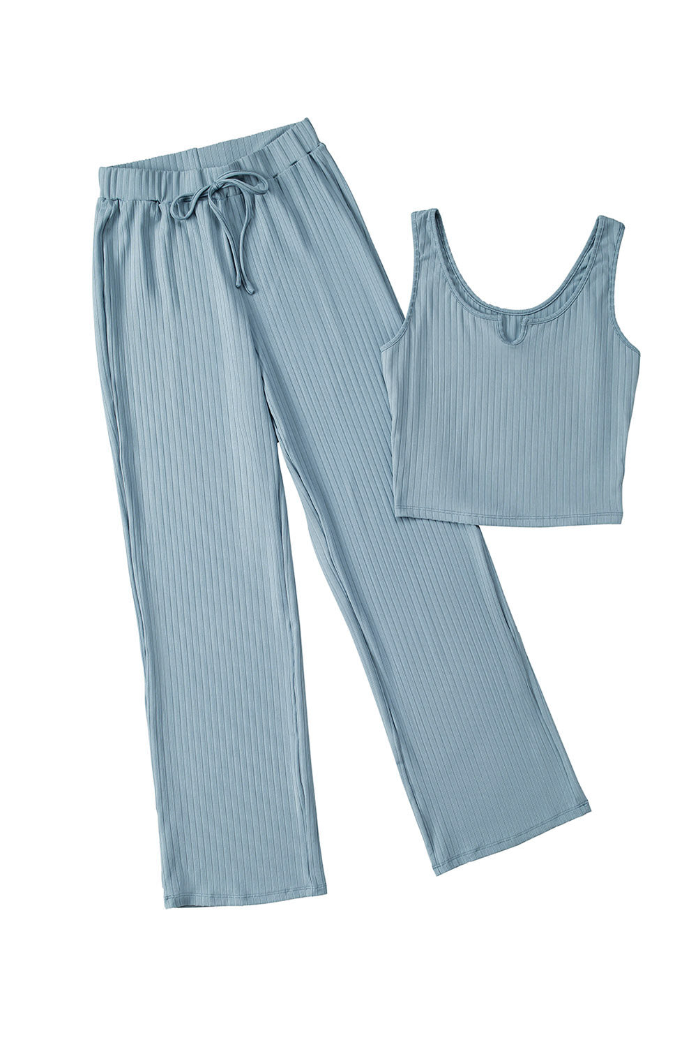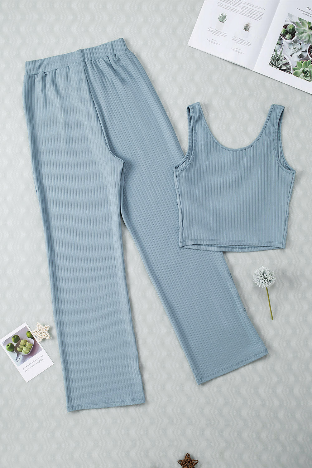 Blue Ribbed Crop Tank Drawstring Lounge Pants Set