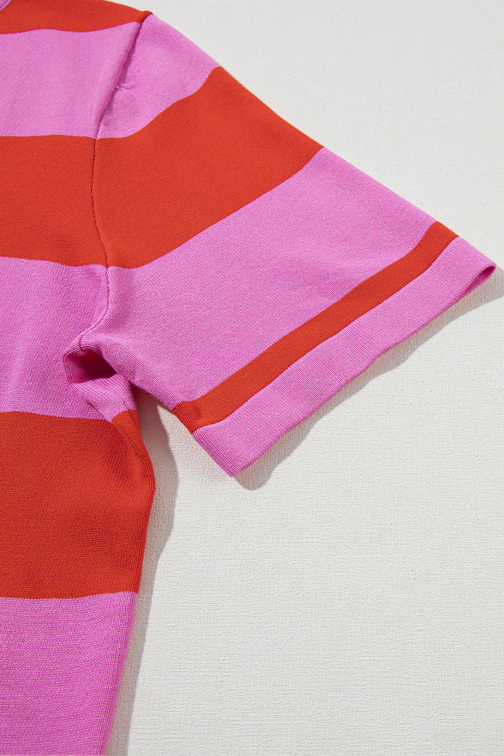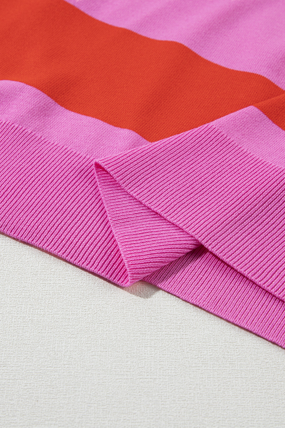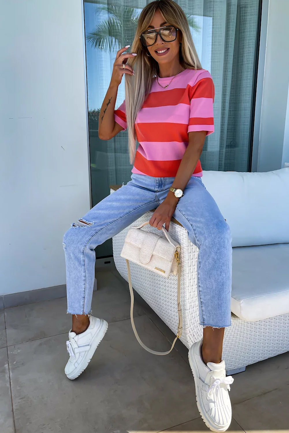 This sweater tee is eye-catching with a colorblock striped silhouette