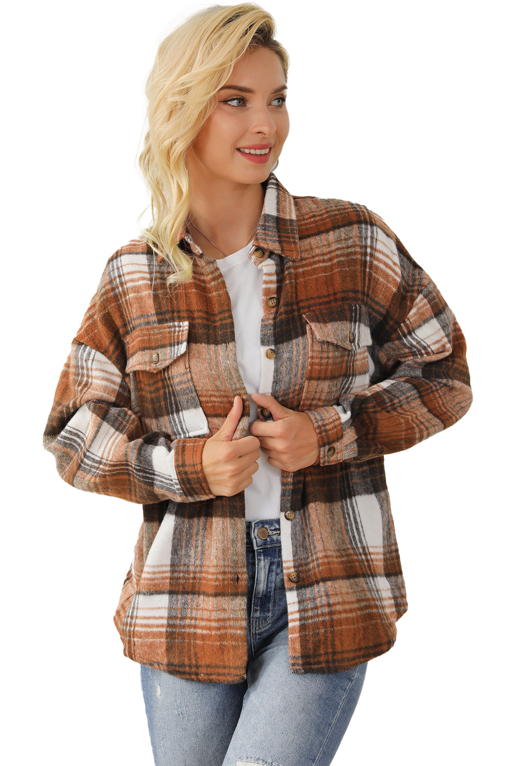 - An allover plaid print, front chest pockets, and tortoise buttons create a chic style