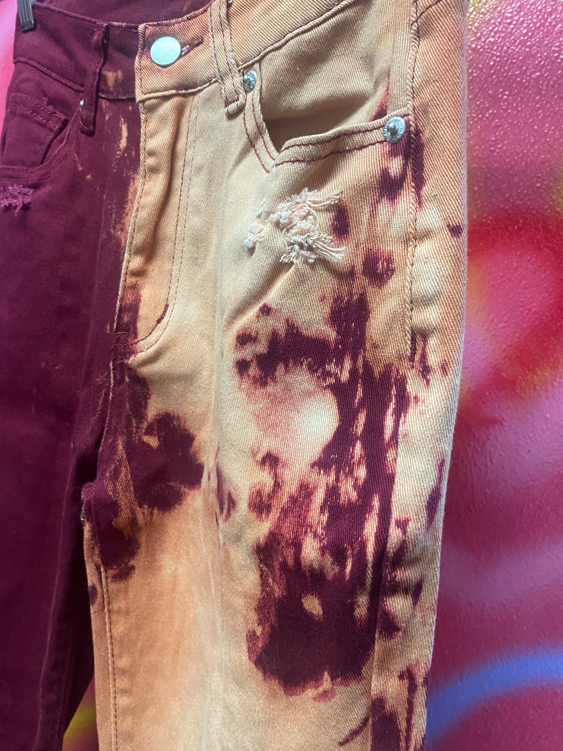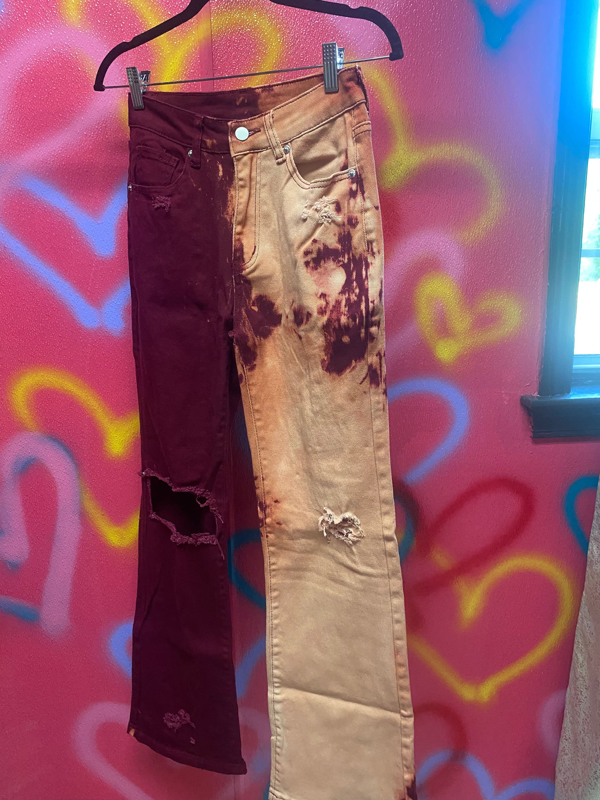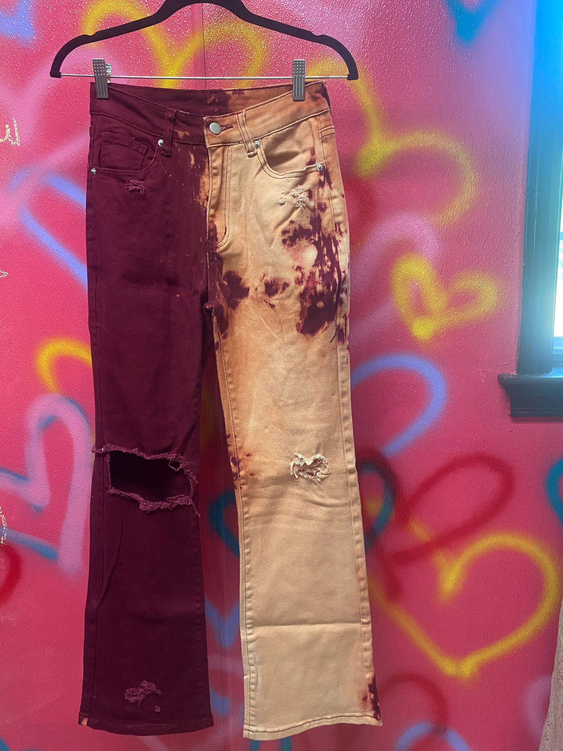 - LEFT PANT LEG IS BLEACHED OUT AND BOTH PAINT LEGS ARE DISTRESSED
