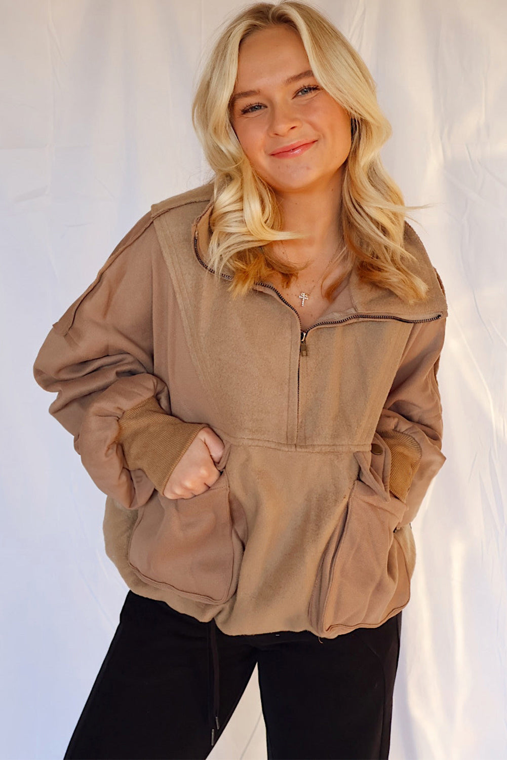 Camel Exposed Seam Side Pockets Half Zipper Baggy Sweatshirt