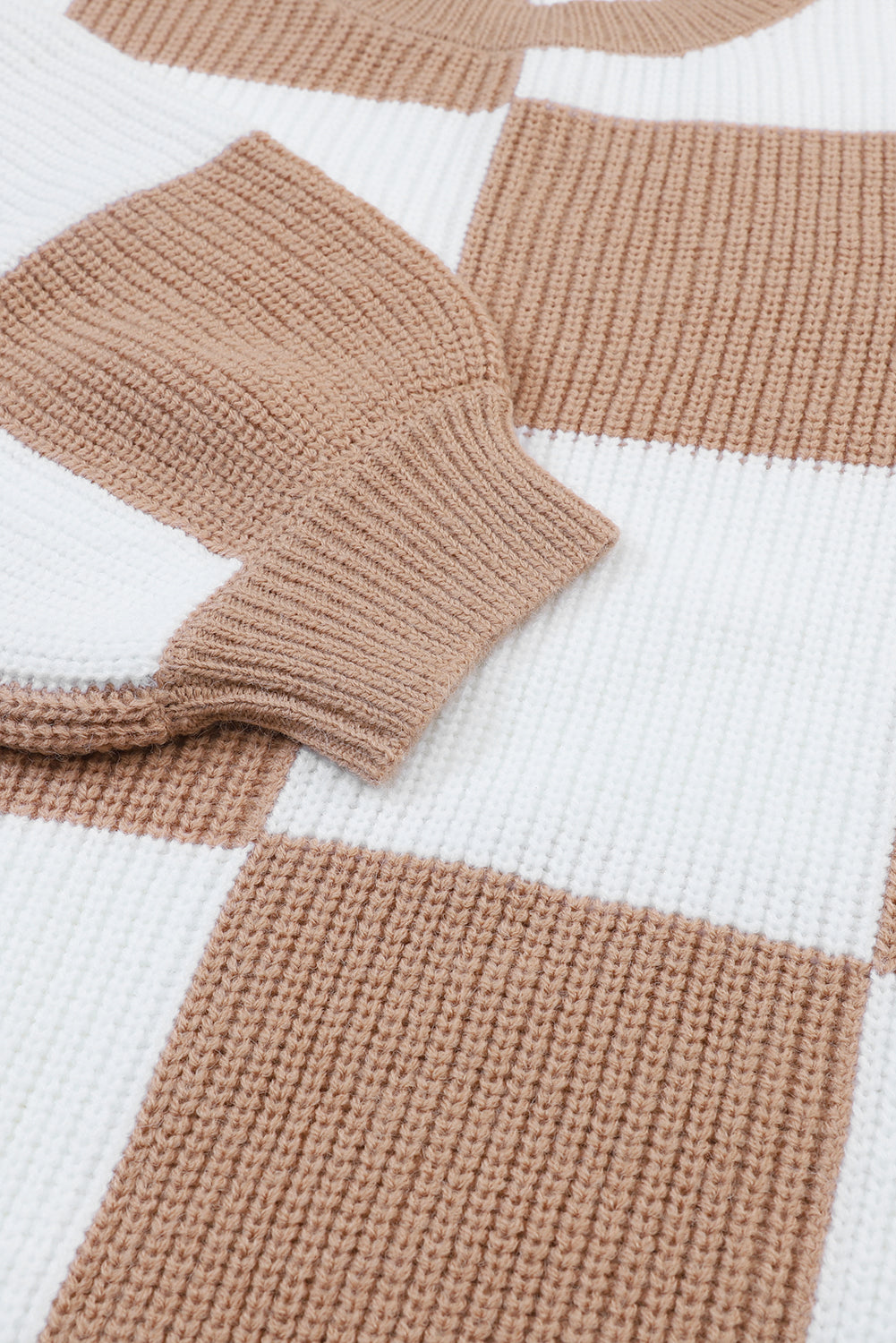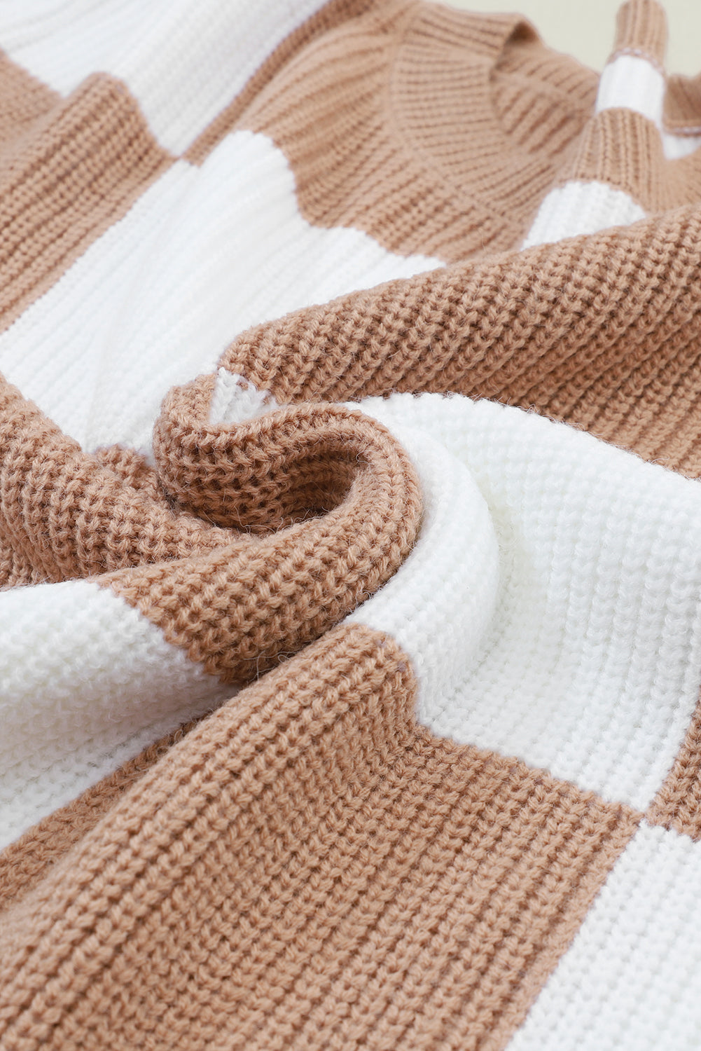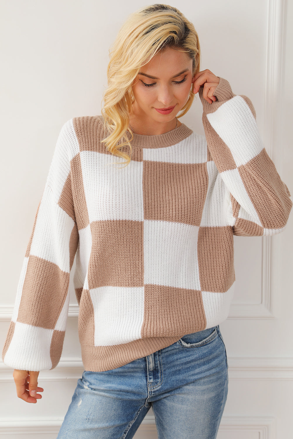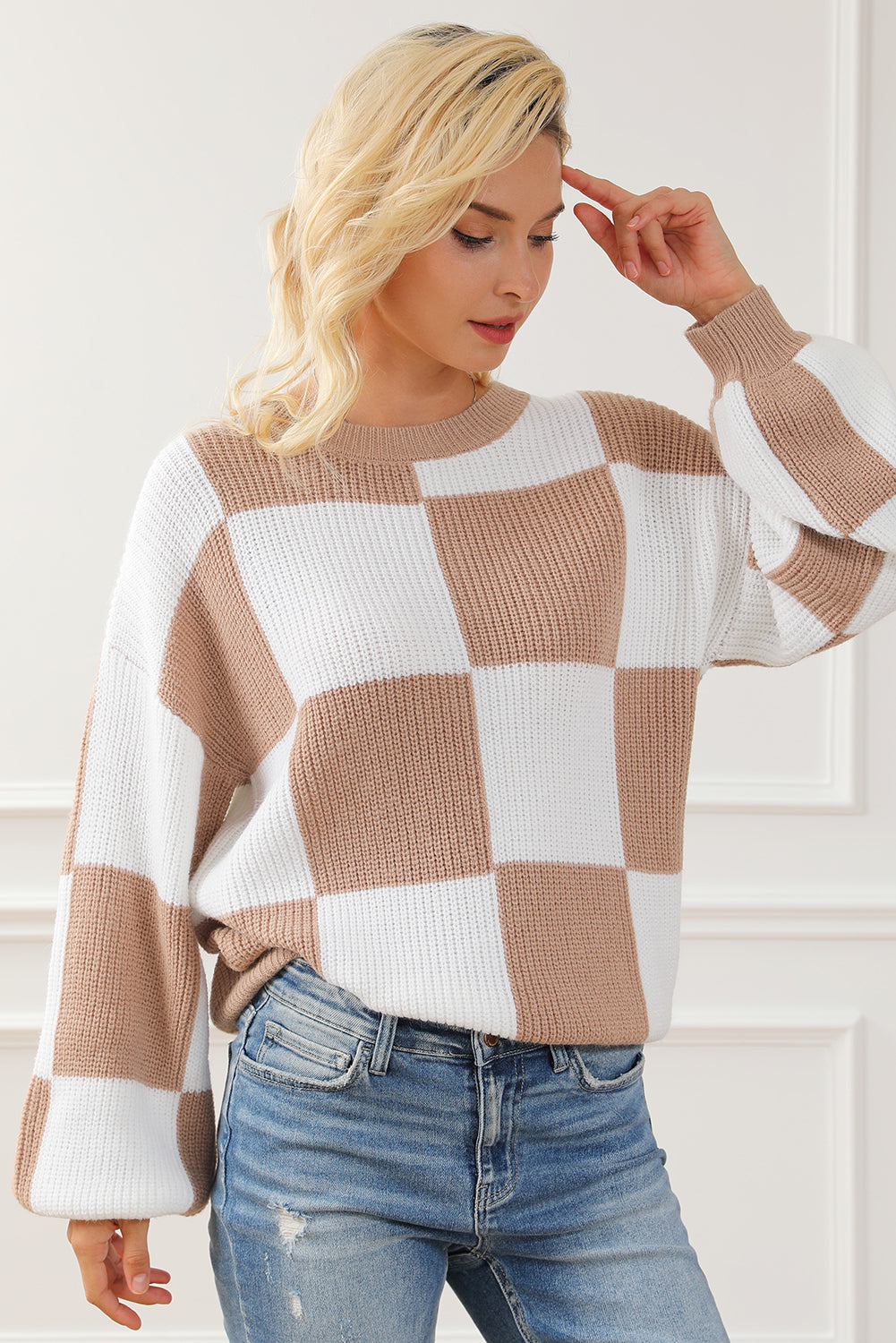Checkered Ribbed Knit Puff Sleeve Sweater