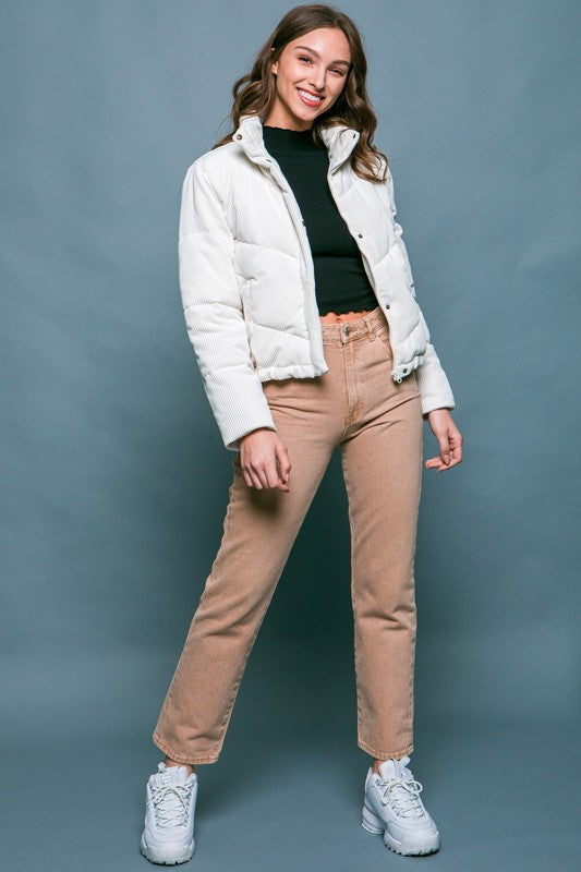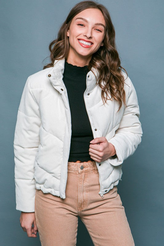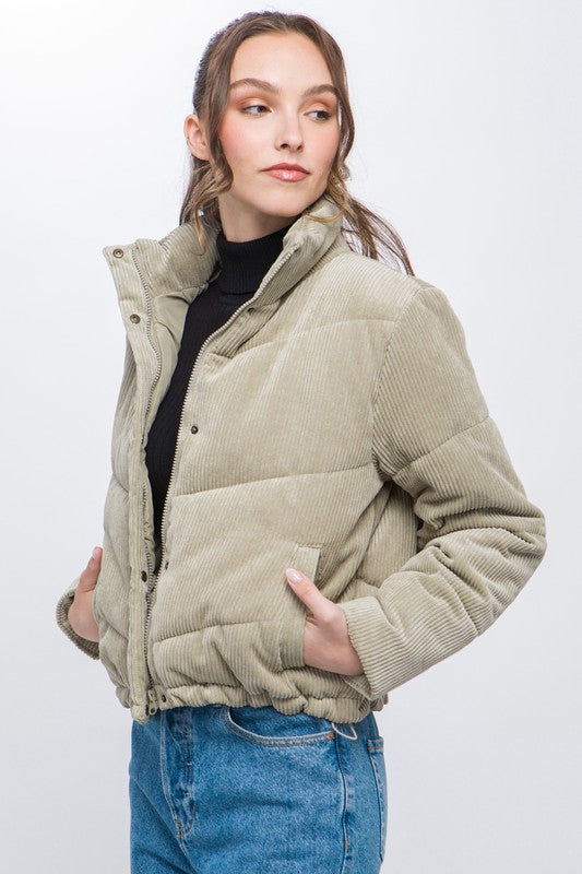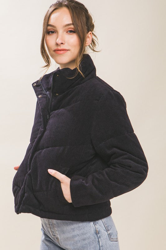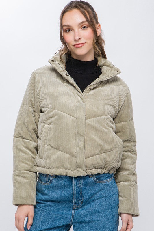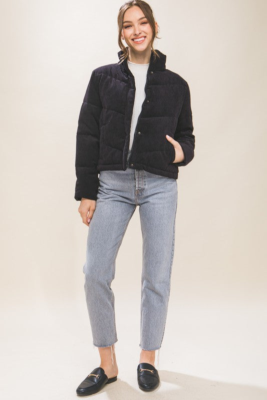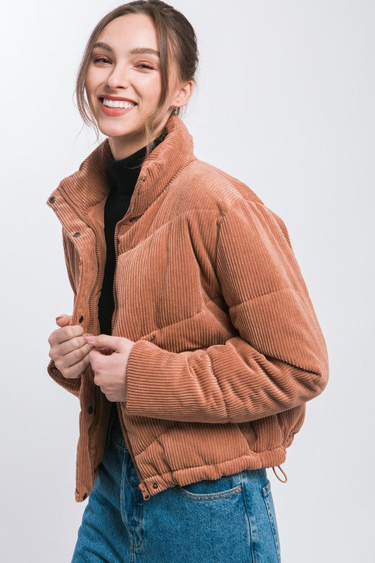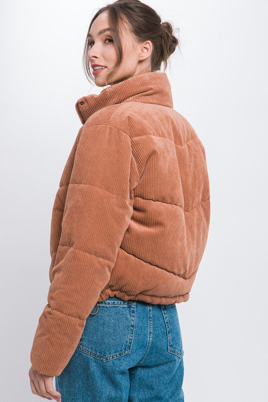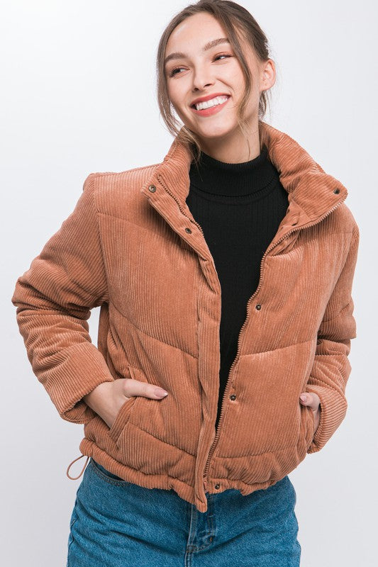 This jacket redefines comfort with its corduroy fabric and puffer design, offering a cozy and stylish addition to your outerwear collection. Crafted with meticulous attention to detail, the toggle detail adds a touch of classic charm while also providing additional insulation against the cold. Whether you're braving chilly weather or seeking a fashionable layer, the Corduroy Puffer Jacket with Toggle Detail effortlessly merges comfort and style.