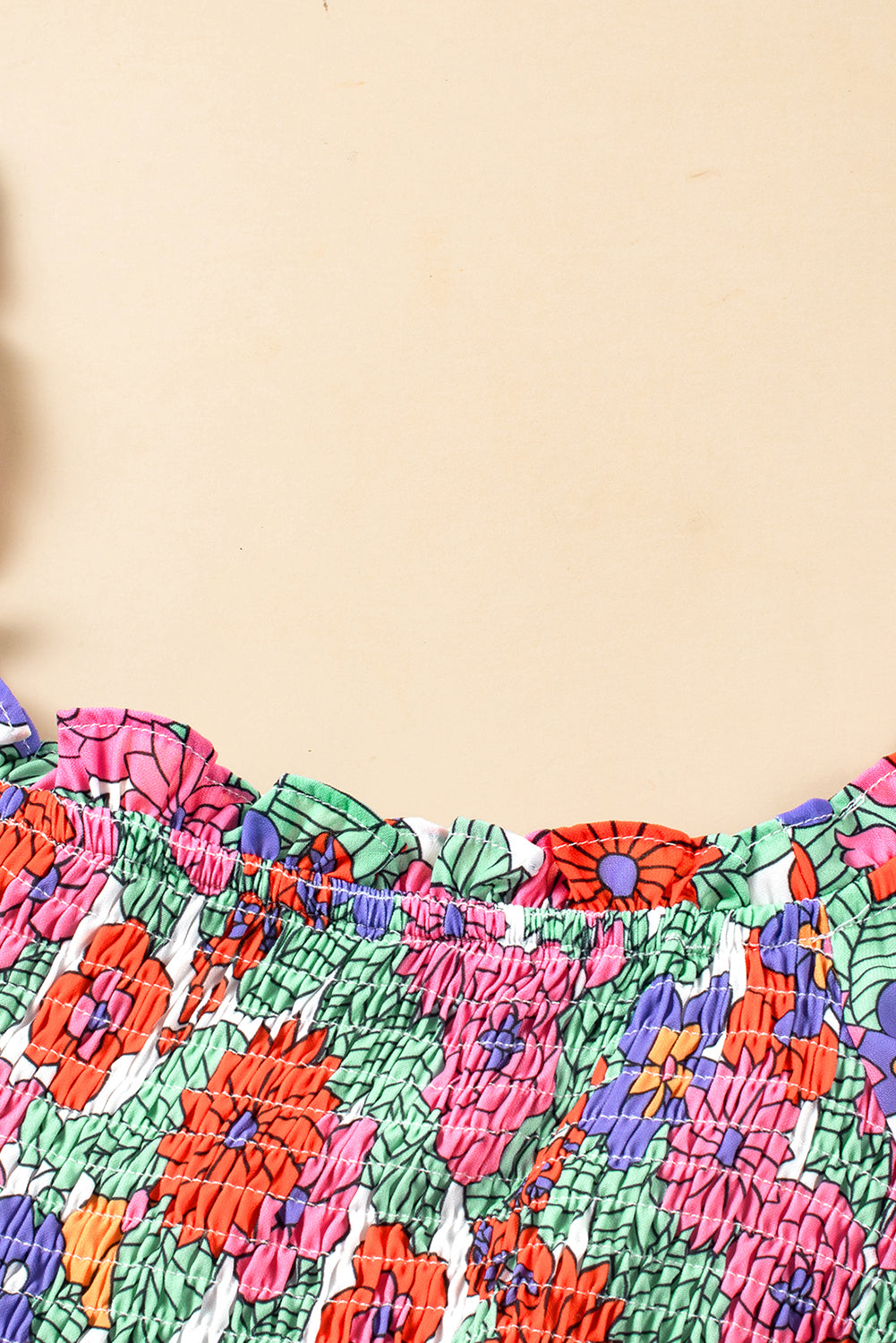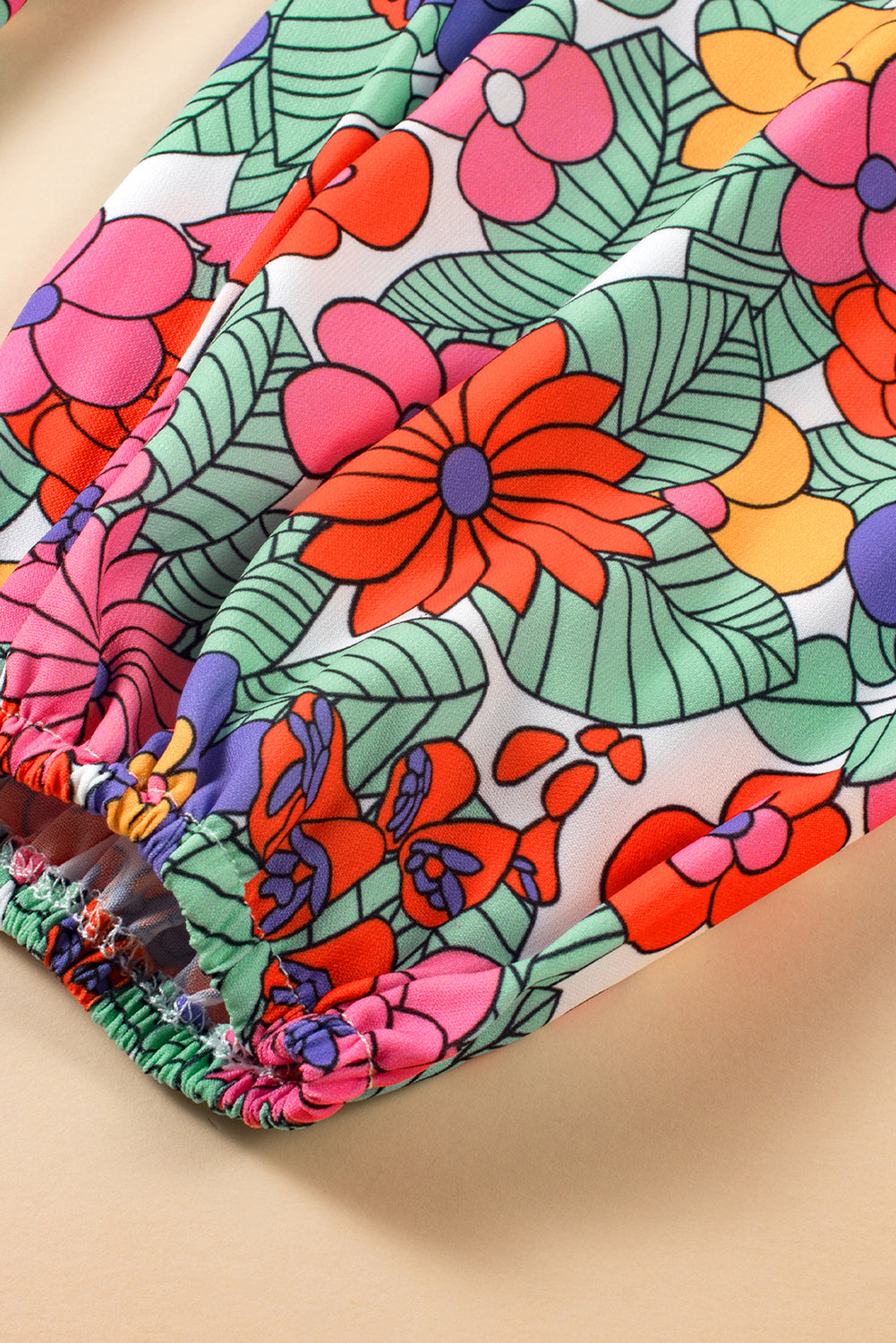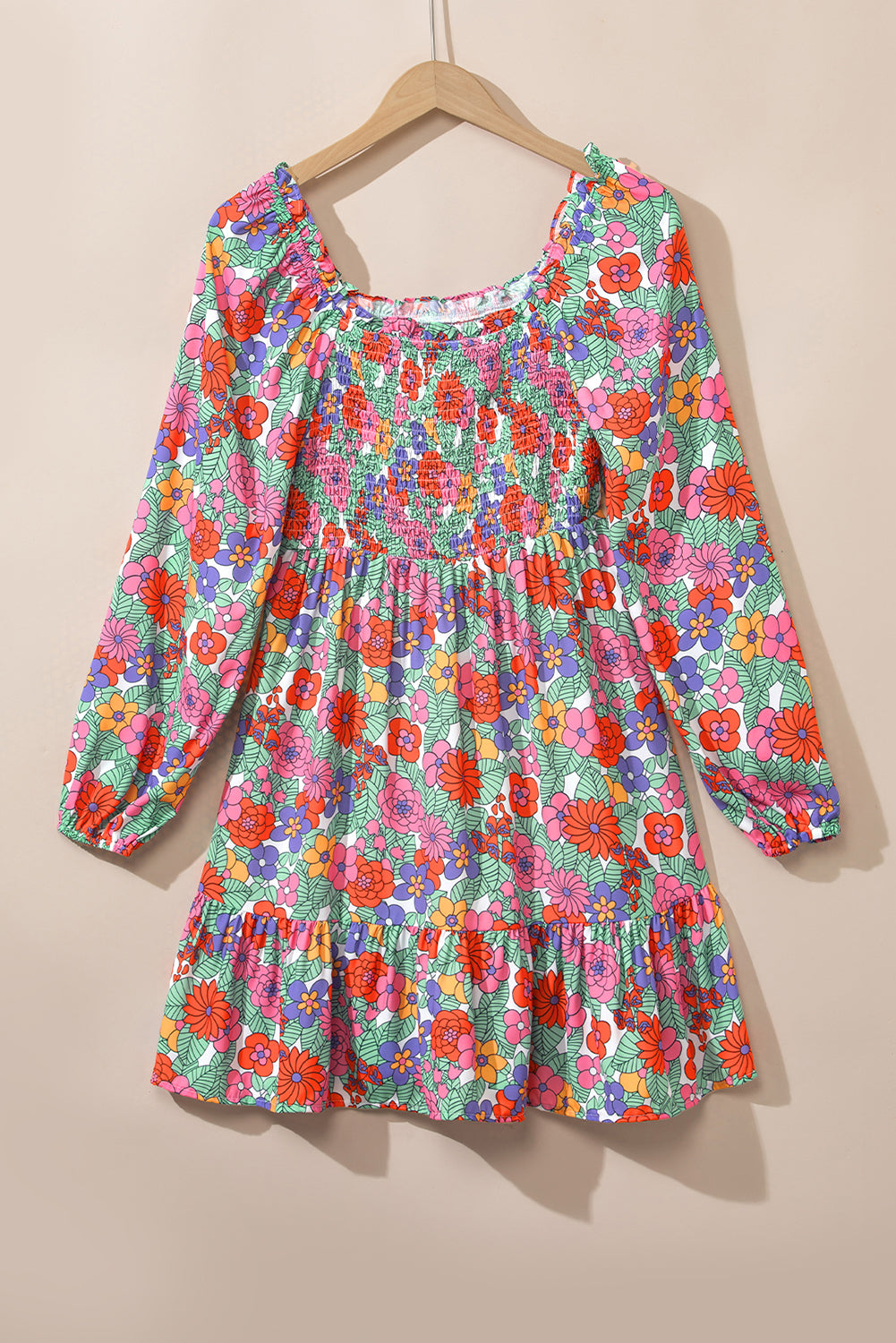 - A square elastic neckline with ruffle detail, smocked bodice, bubble sleeves with elastic cuffs