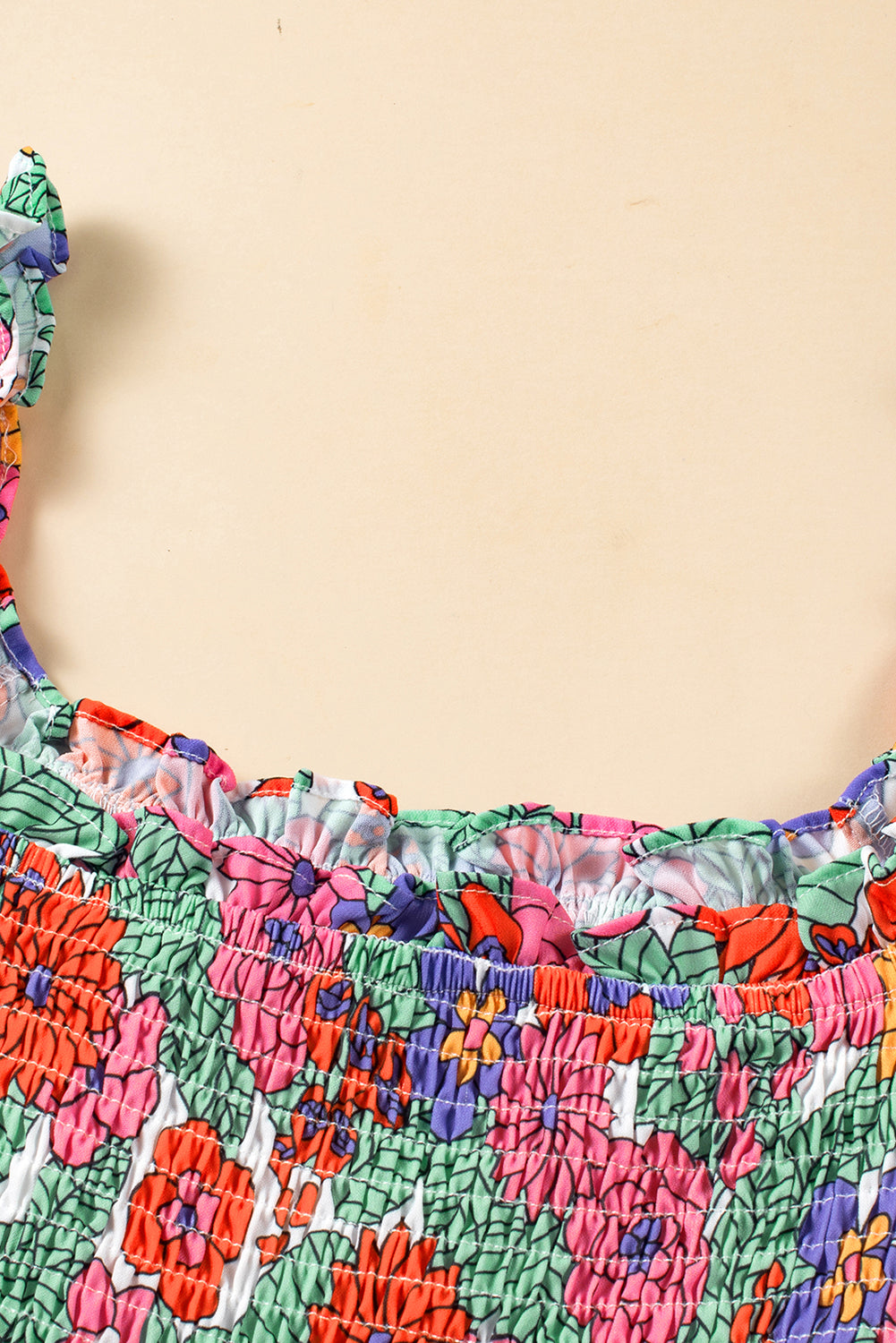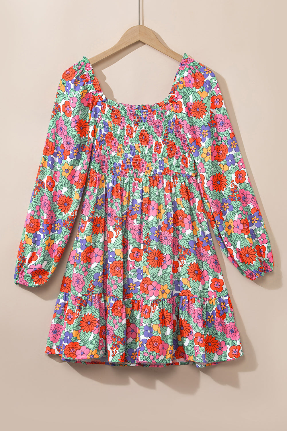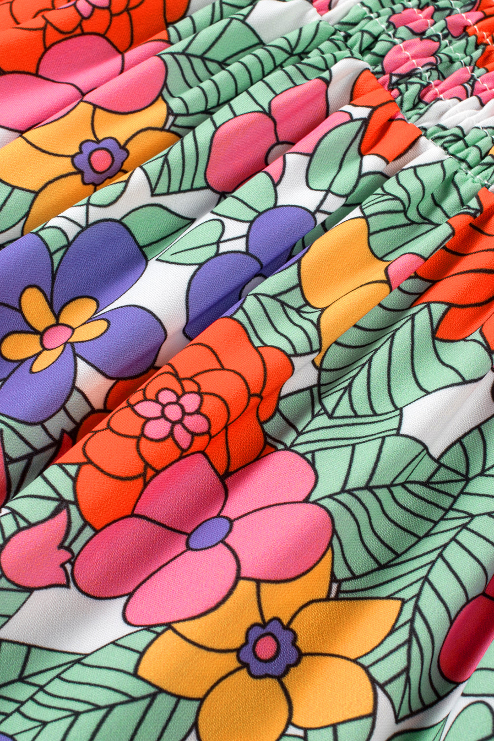 - A square elastic neckline with ruffle detail, smocked bodice, bubble sleeves with elastic cuffs