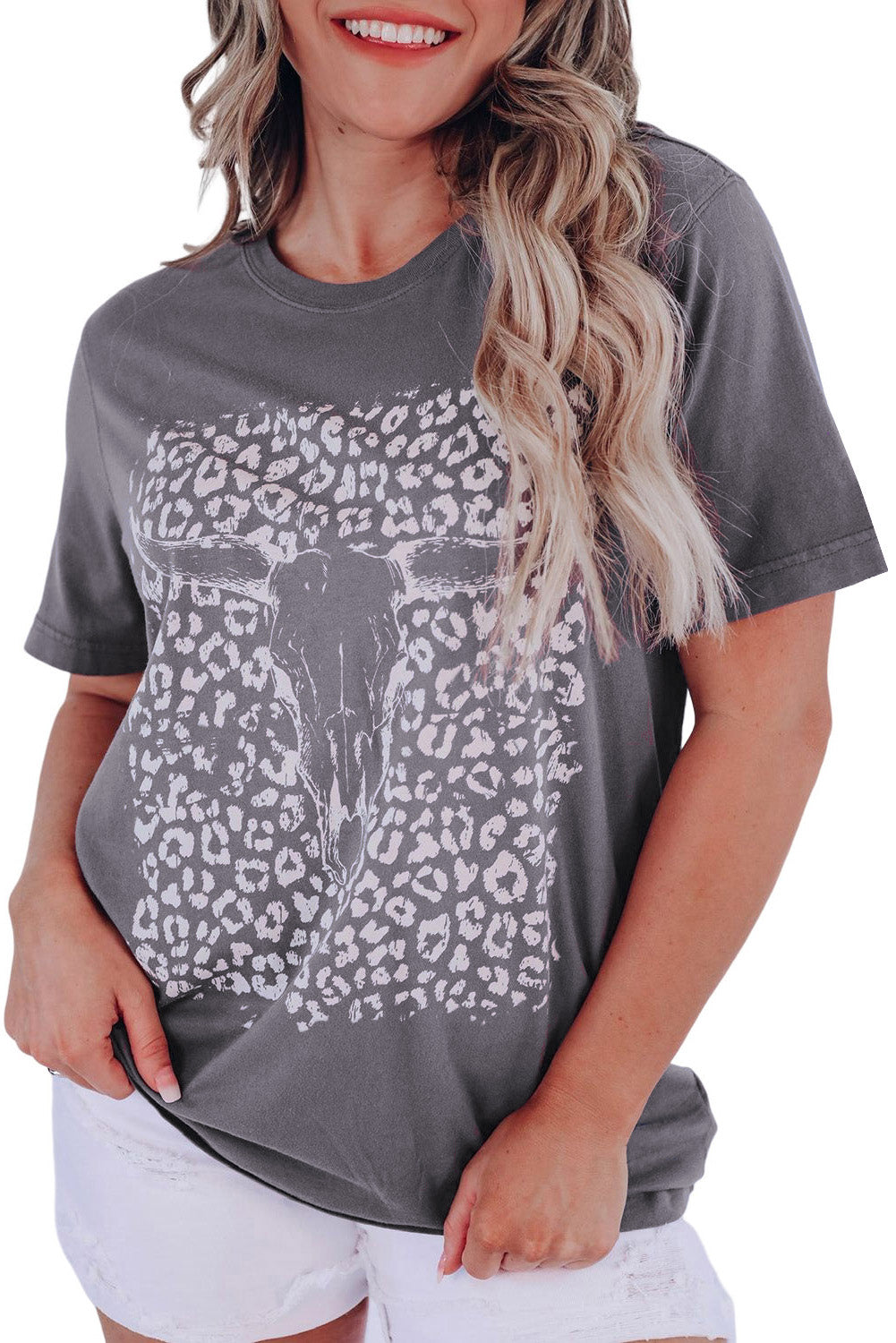 - The Leopard Bull Skull Graphic Tee features a unique design that combines the iconic image of a bull skull with the fierce pattern of a leopard print