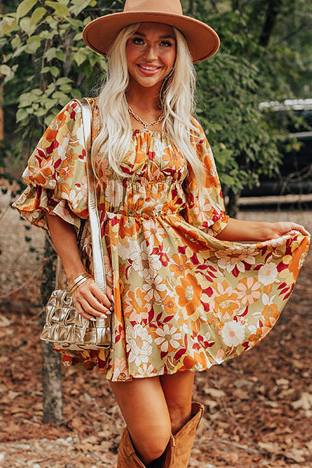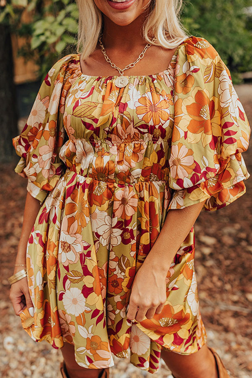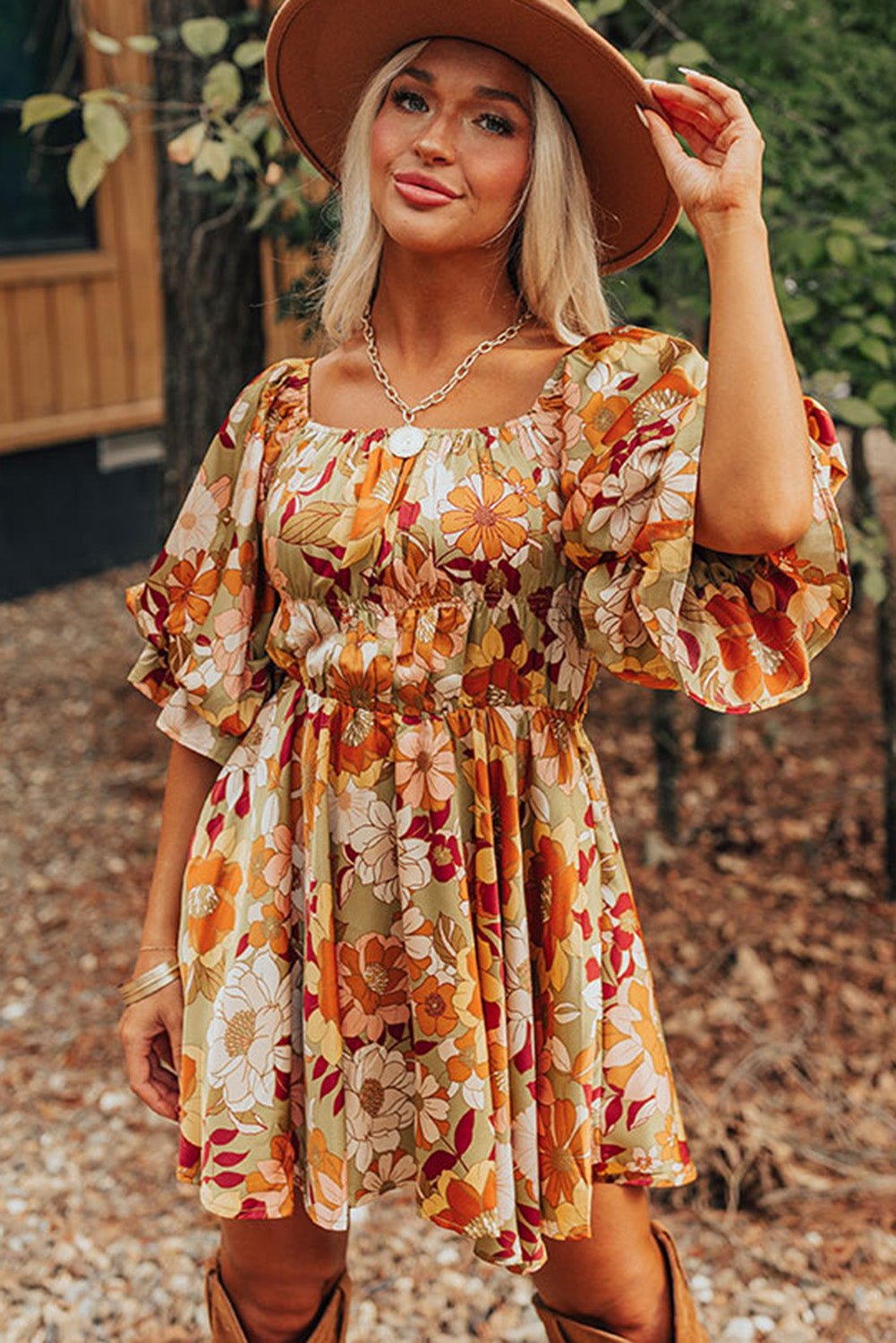 - This floral dress features an elastic scoop neckline that can be worn off-shoulder