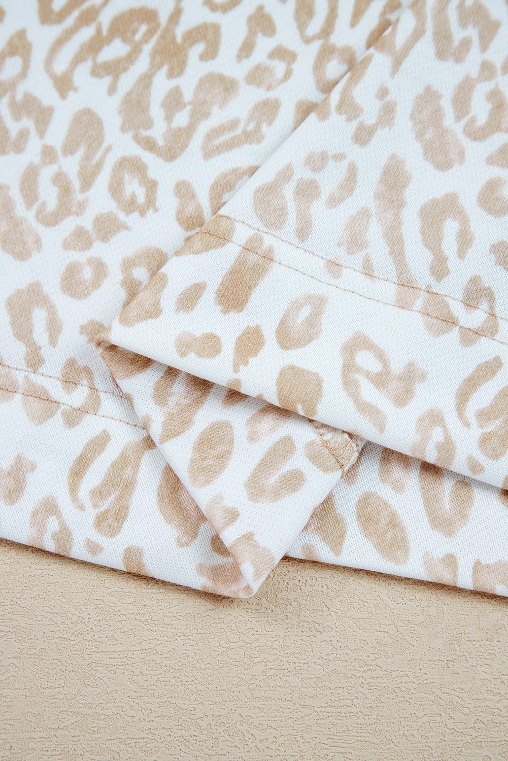 Khaki Leopard Ruffle Detail Ribbed Trim Round Neck Sweatshirt