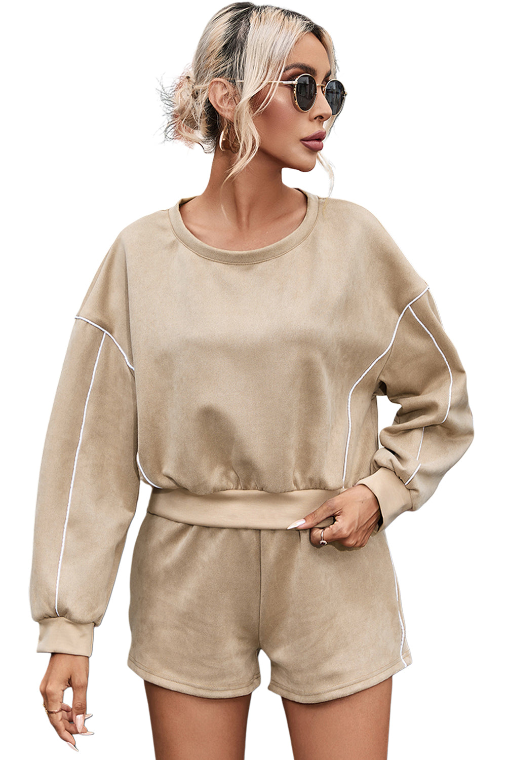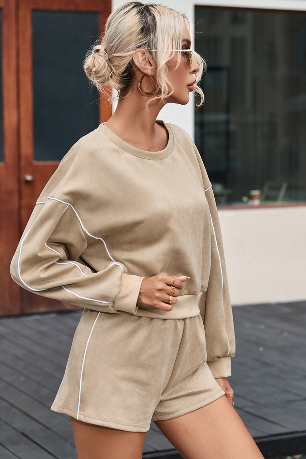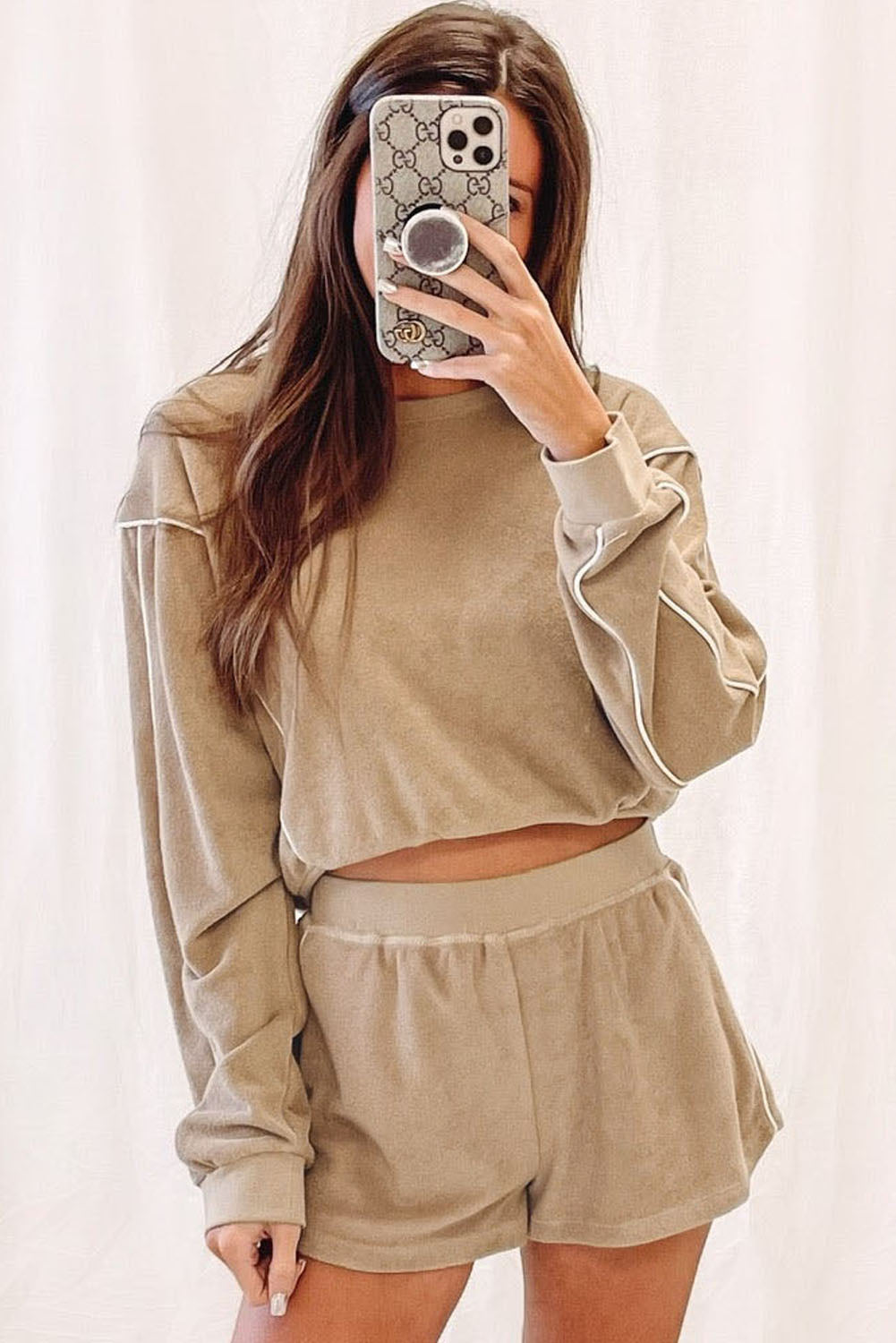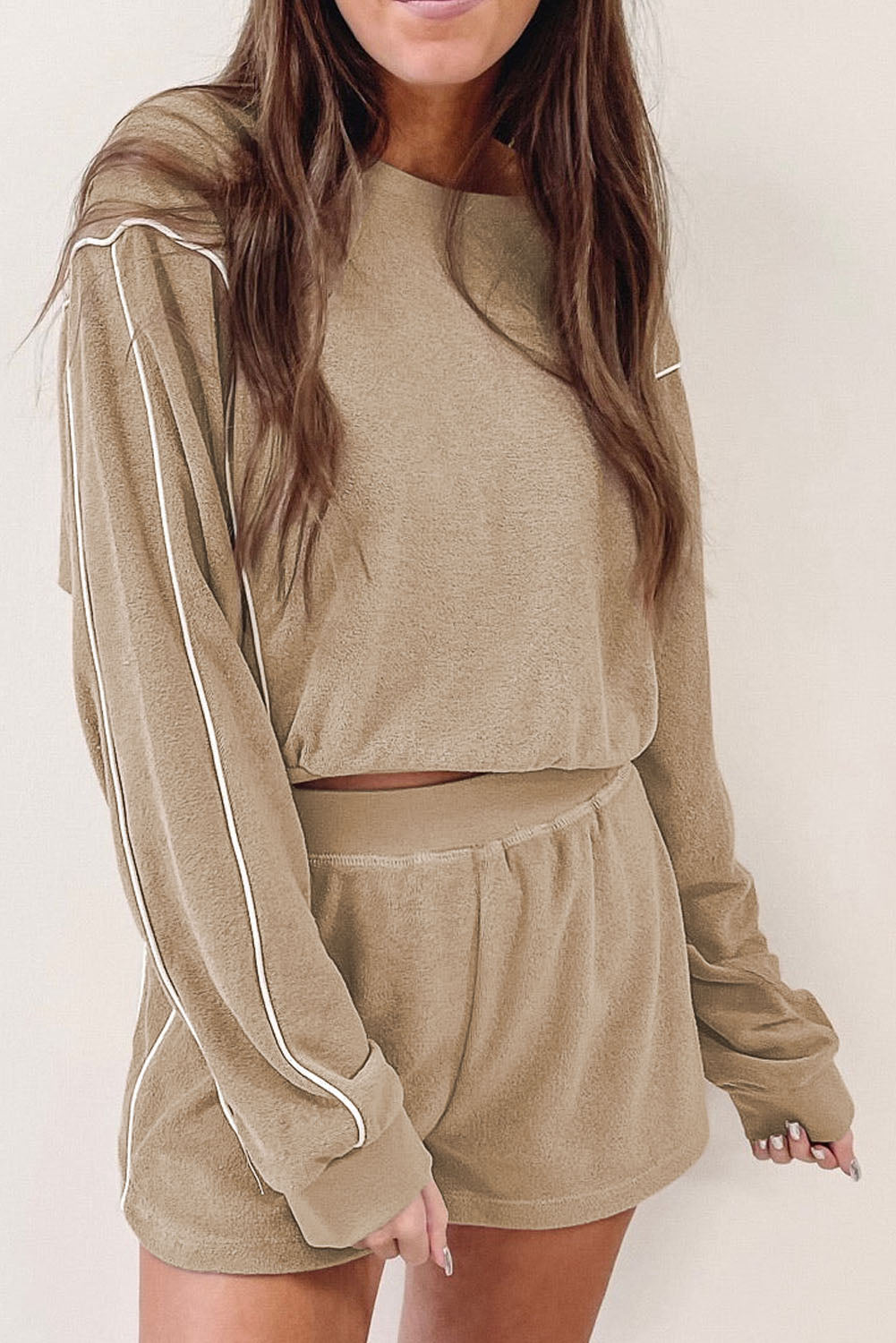 Khaki Piping Trim Long Sleeve Terry Shorts Set