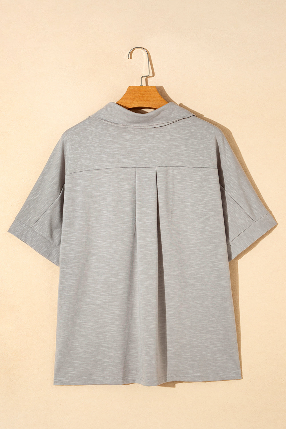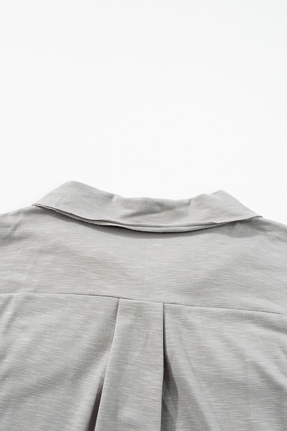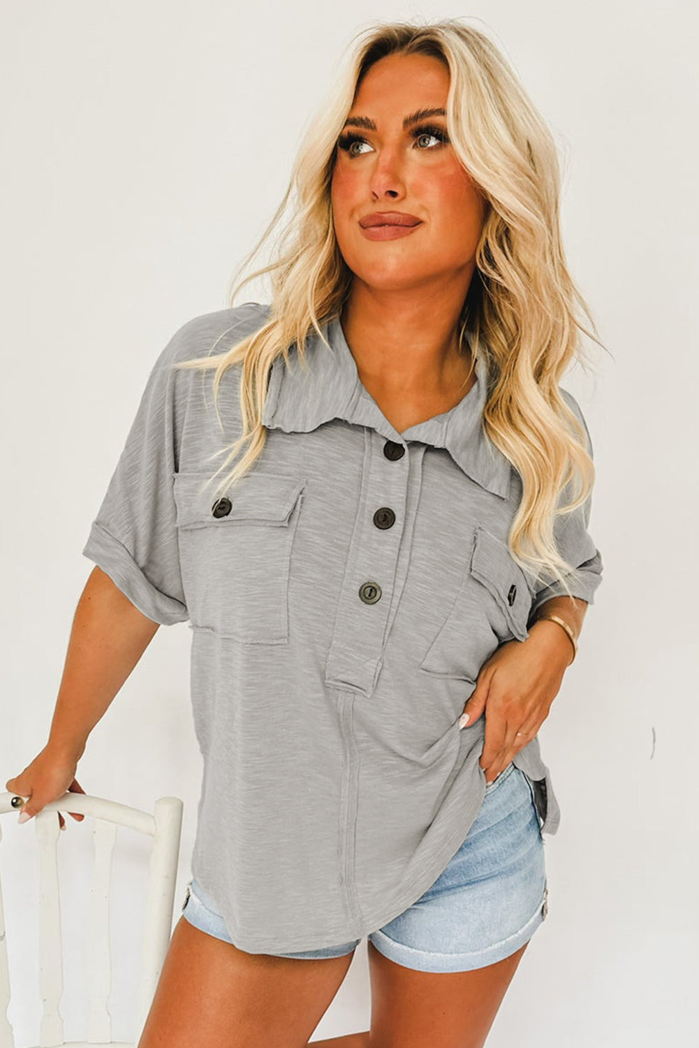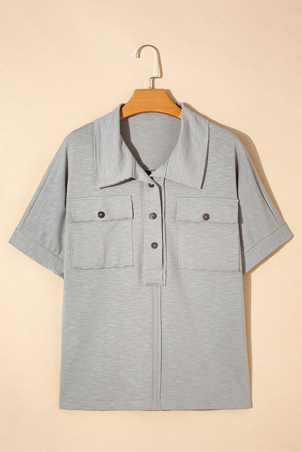 Light Grey Chest Pockets Half Buttoned Collared Blouse