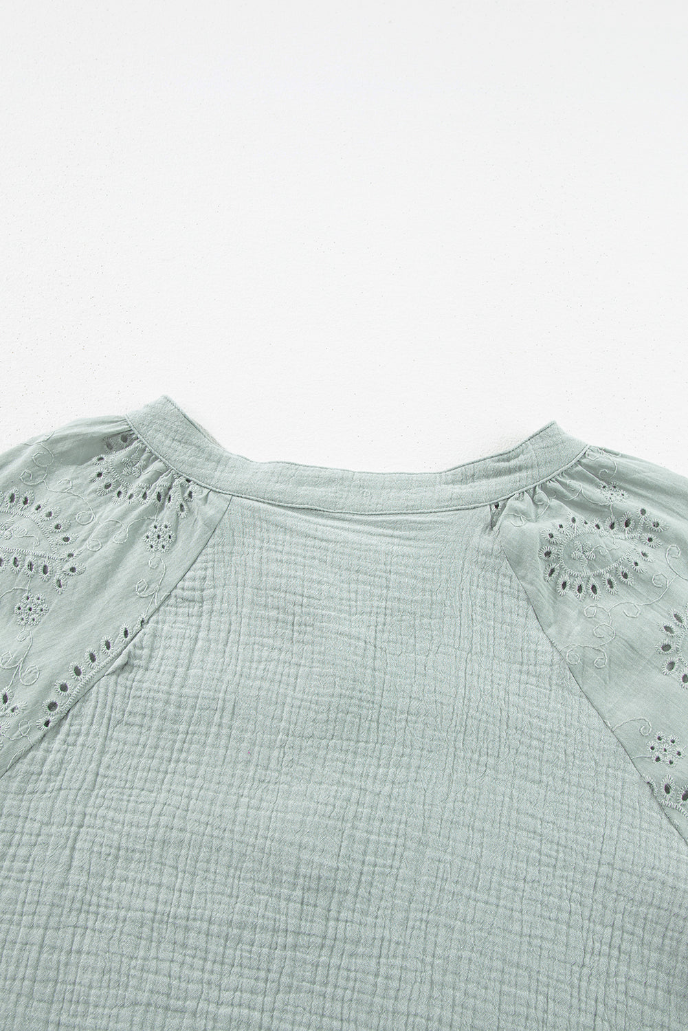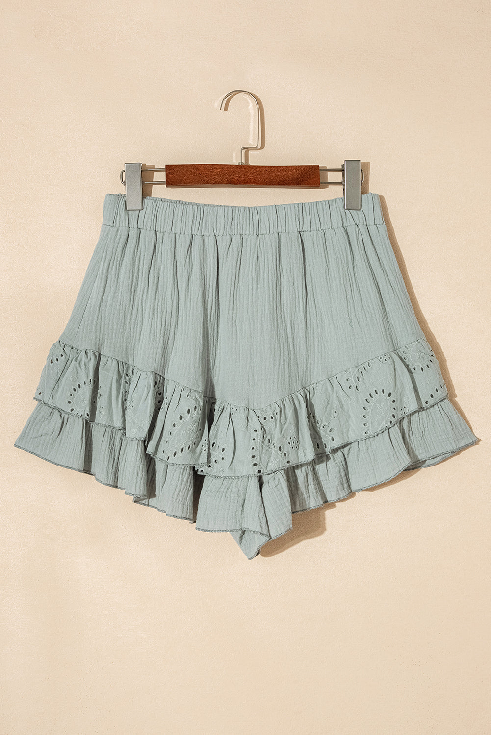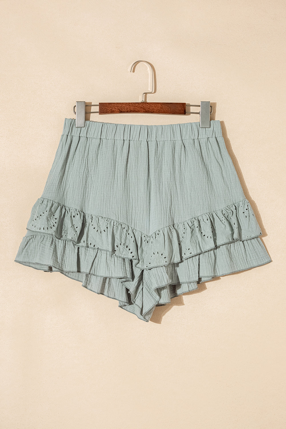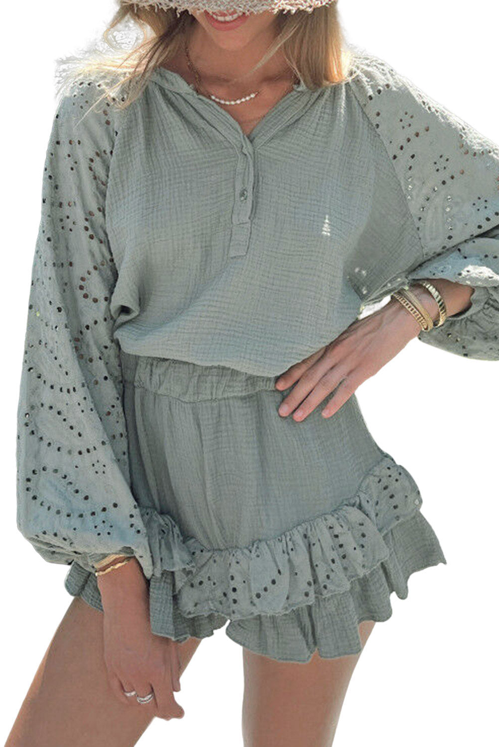 Mist Green Crinkled Eyelet Raglan Sleeve Top Ruffled Shorts Set