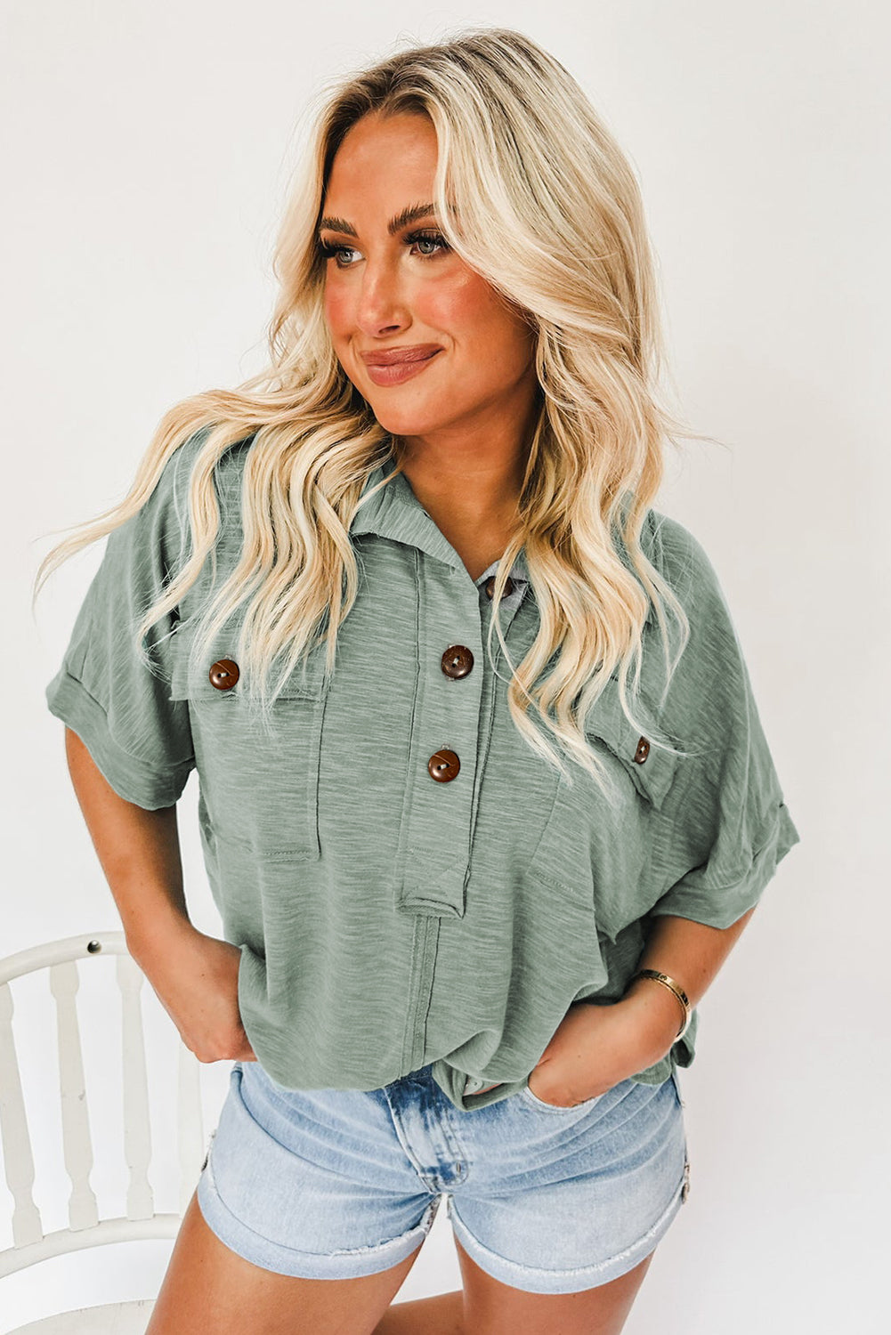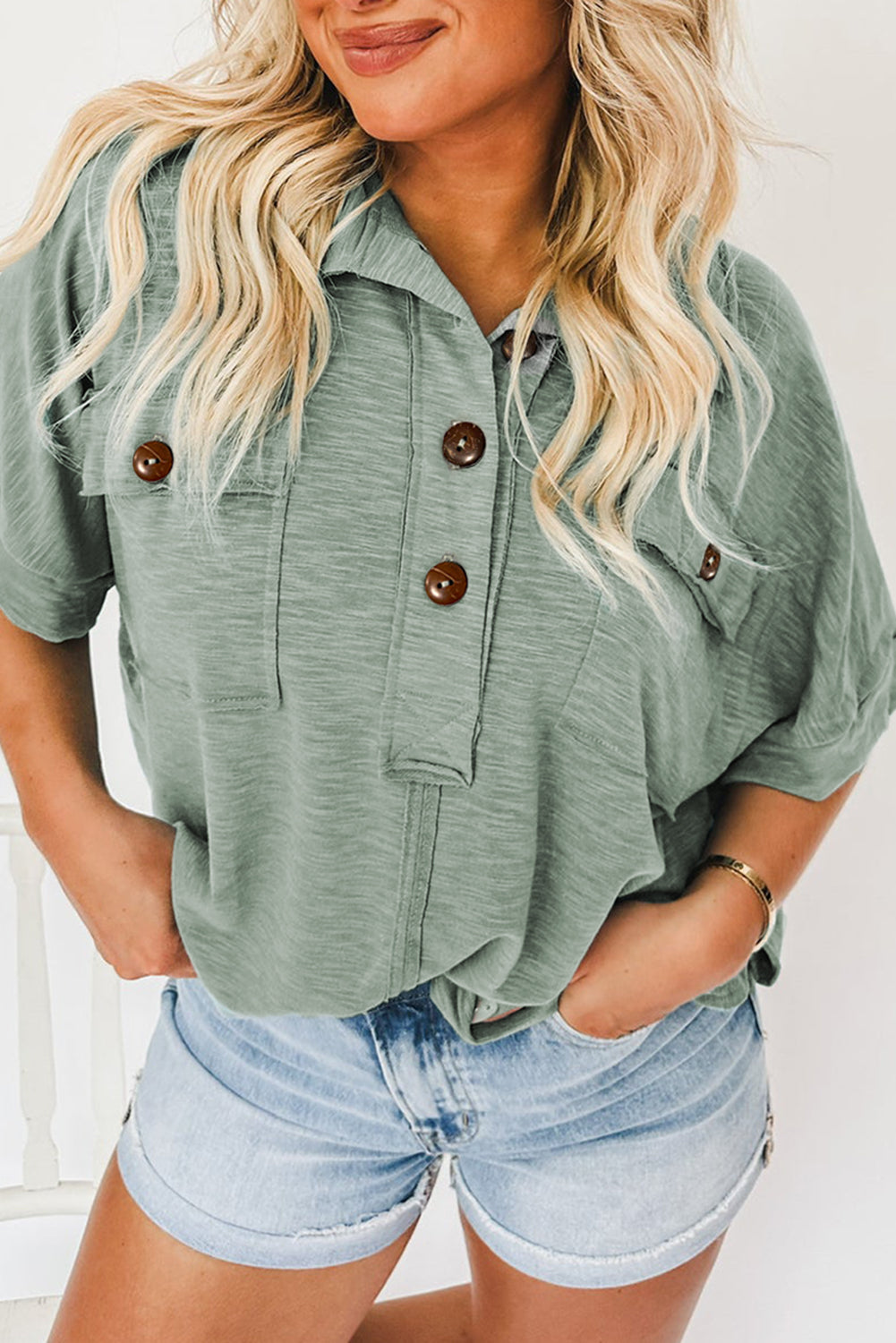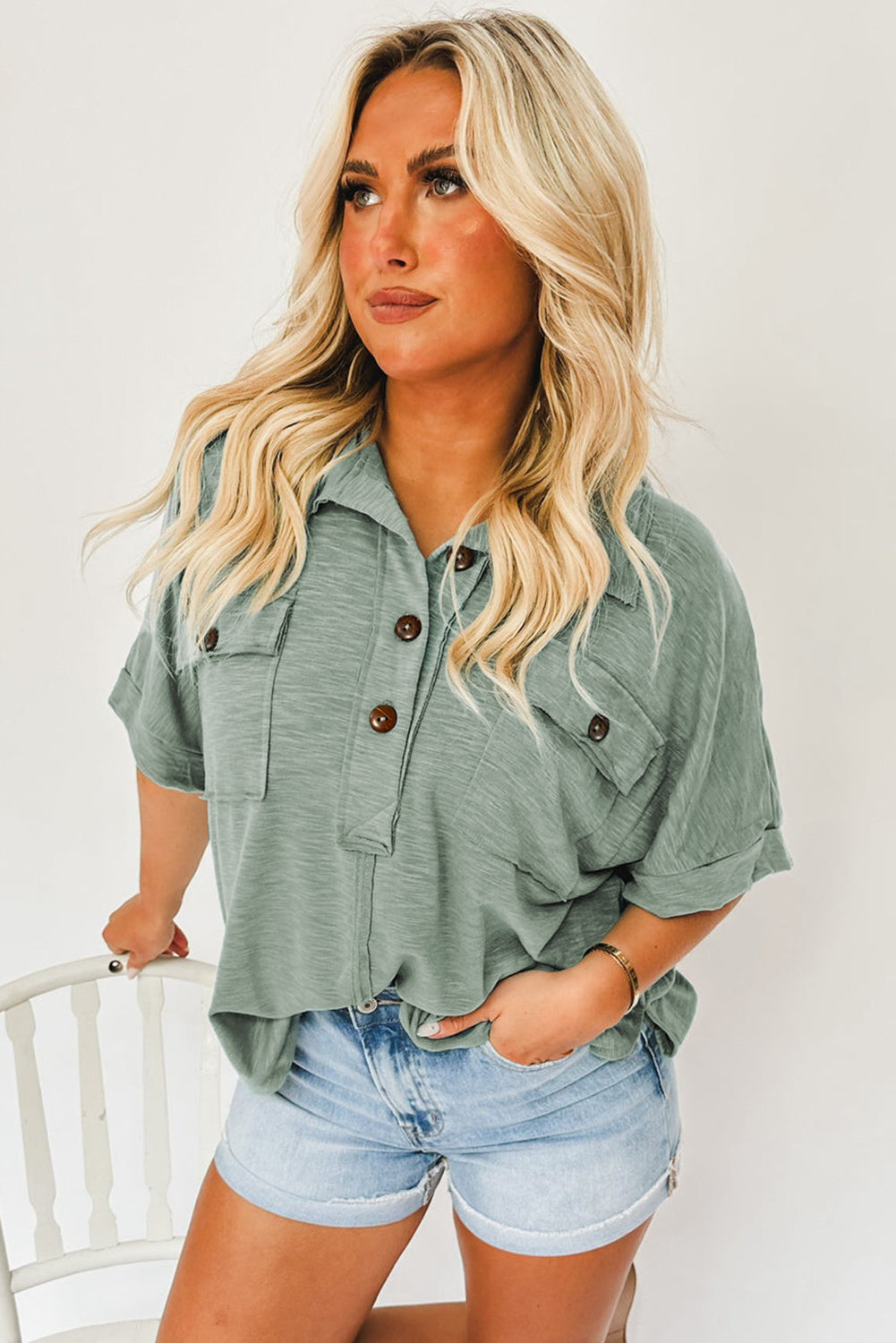 Moonlight Jade Chest Pockets Half Buttoned Collared Blouse