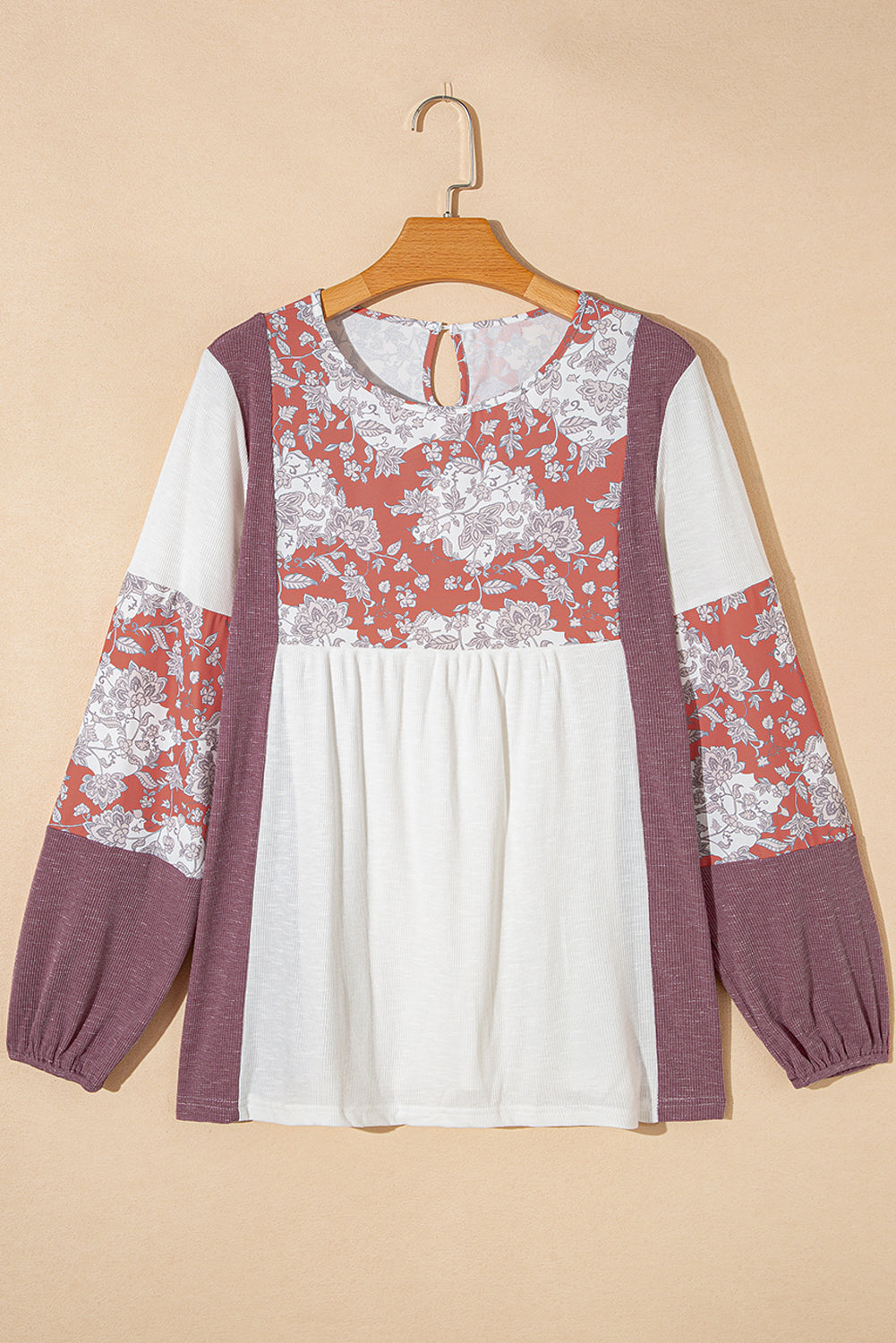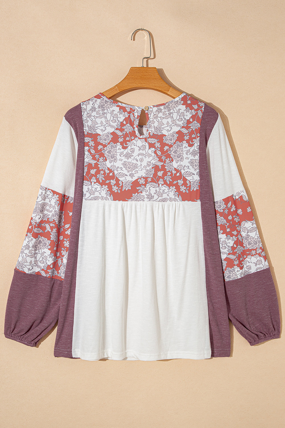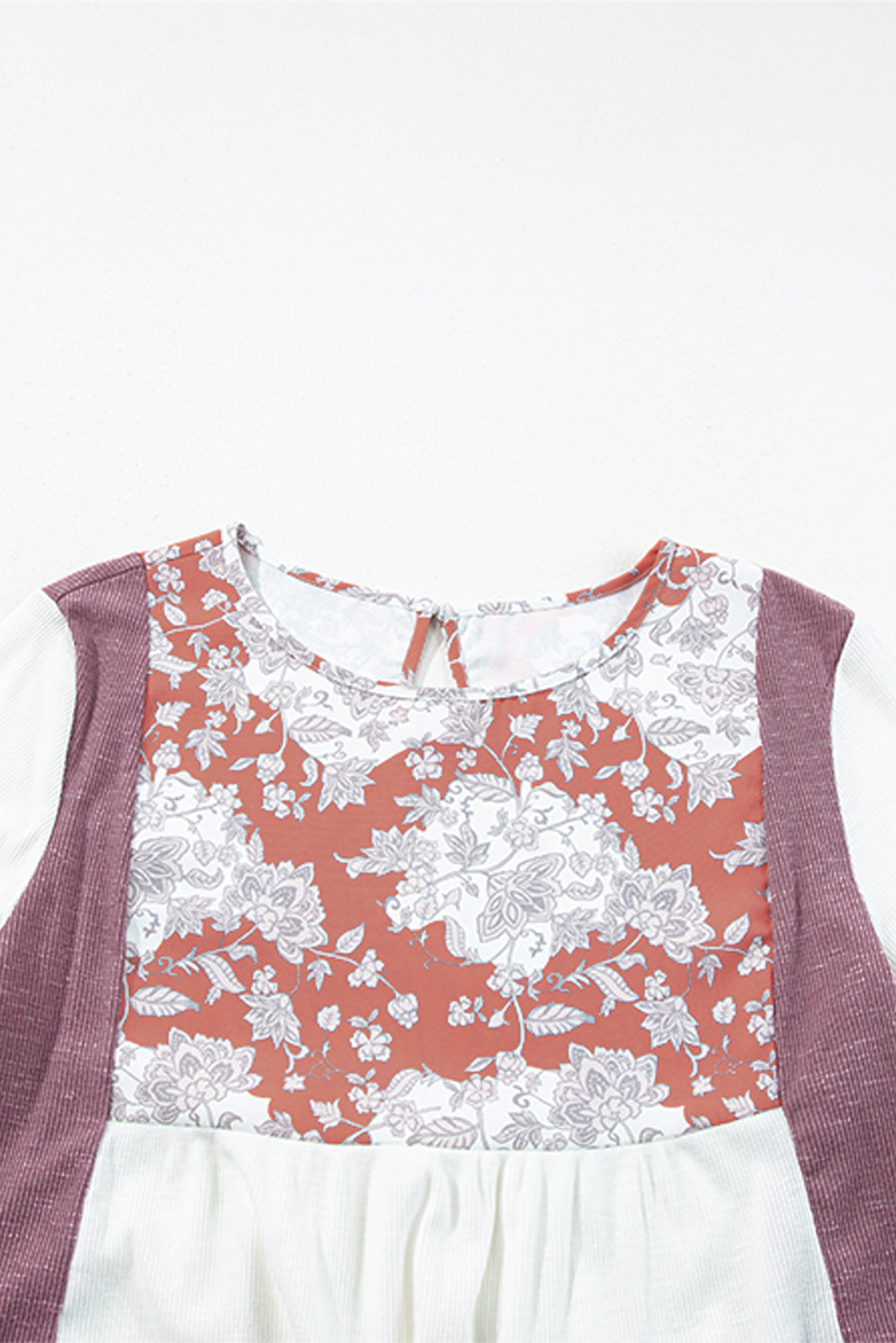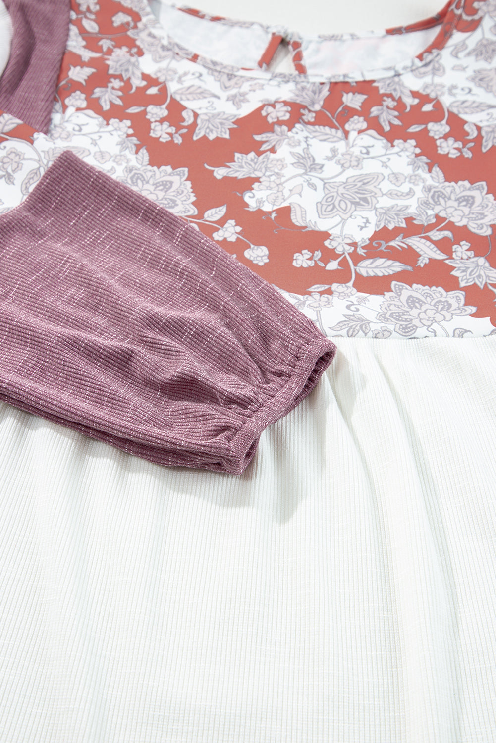 Multicolor Floral Colorblock Bubble Sleeve Ribbed Knit Top