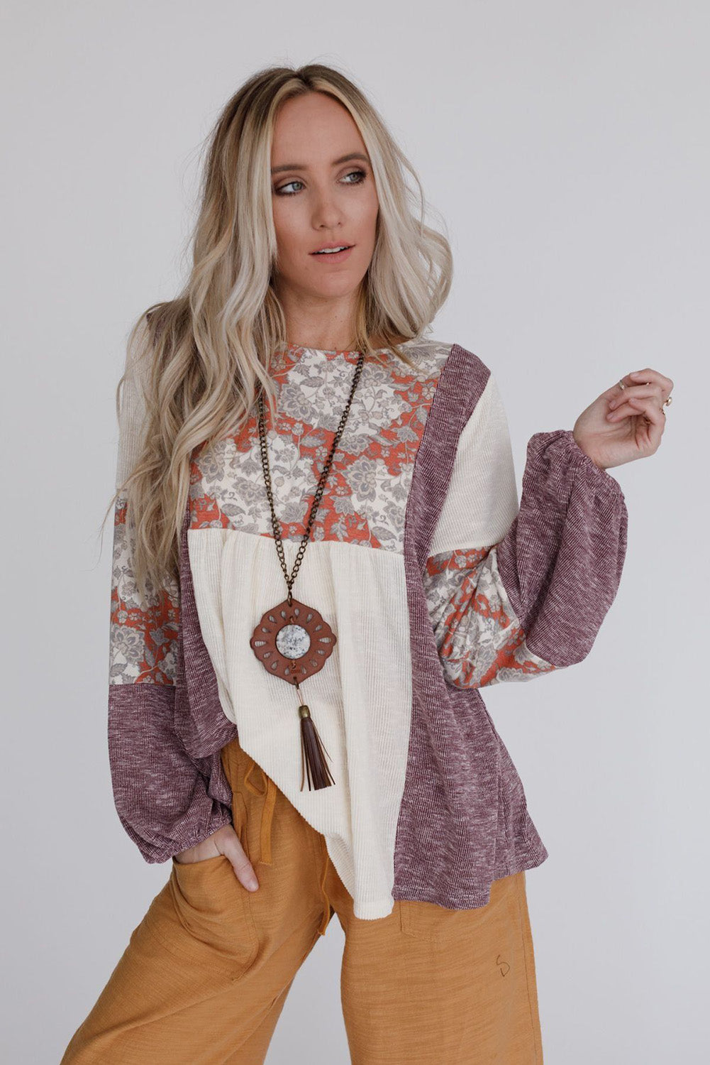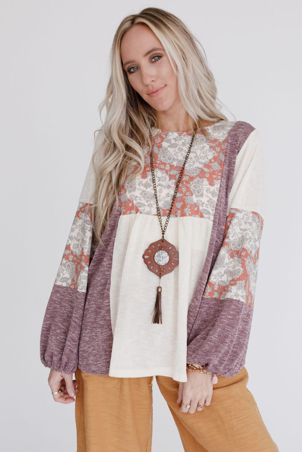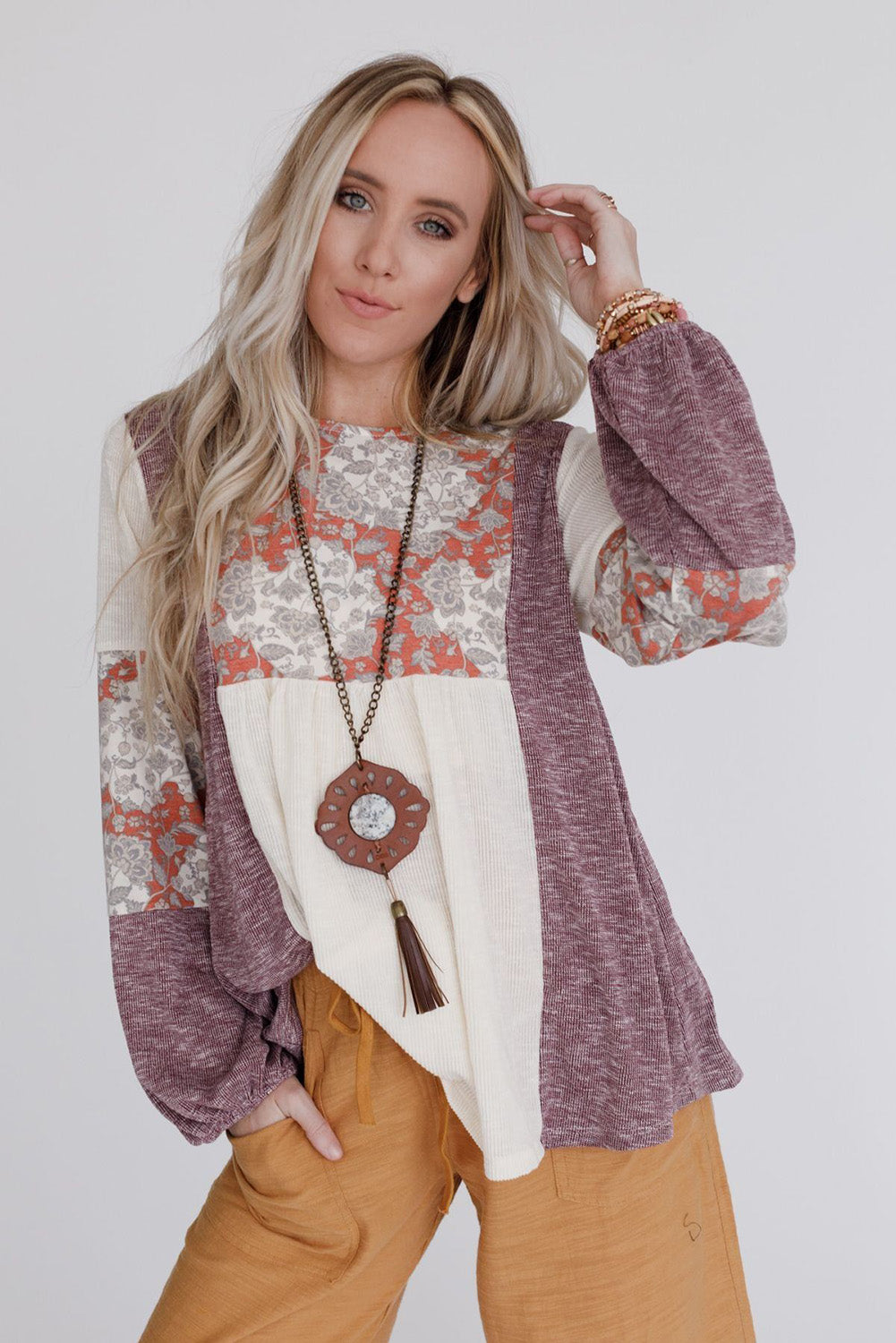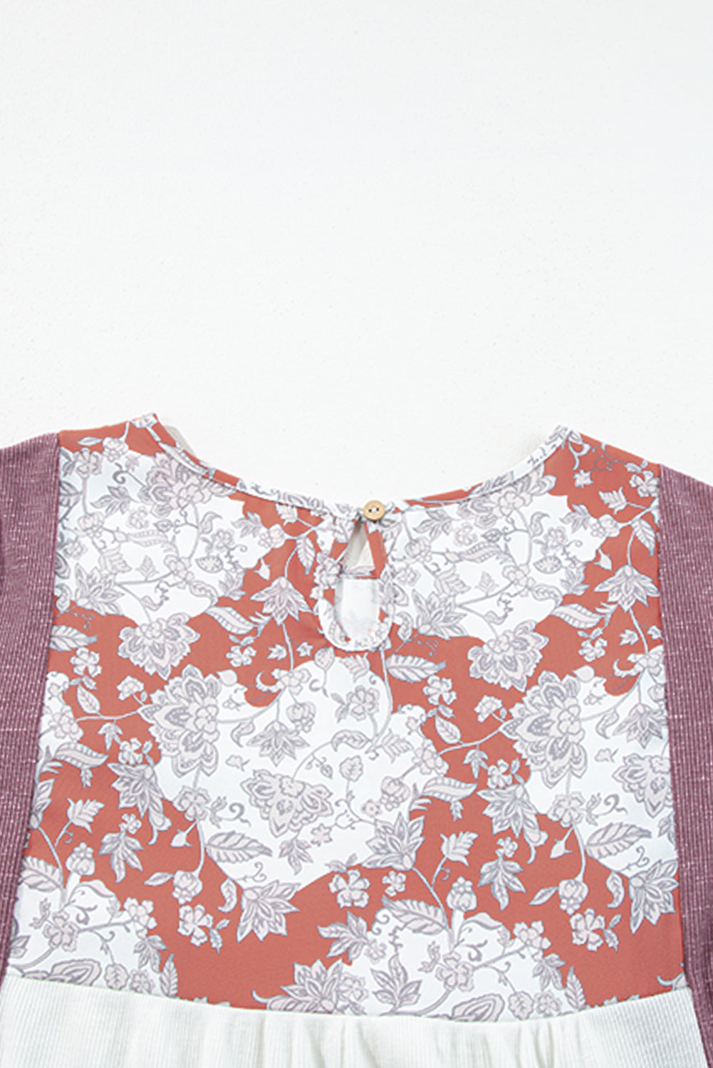 Multicolor Floral Colorblock Bubble Sleeve Ribbed Knit Top
