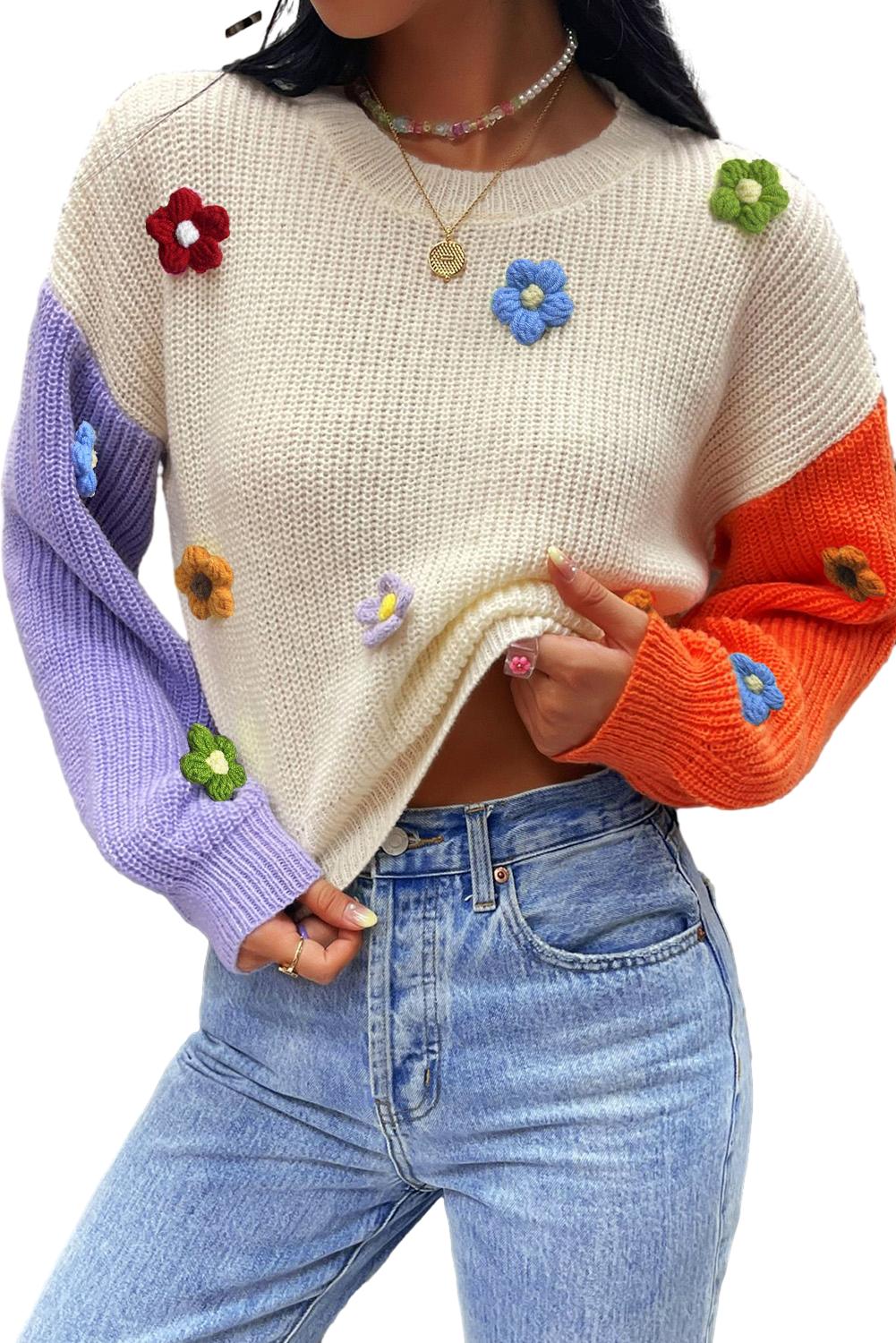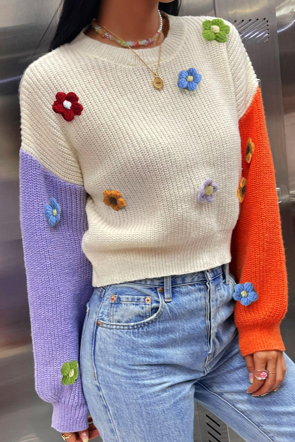 Multicolour Flower Applique Colorblock Drop Shoulder Sweater