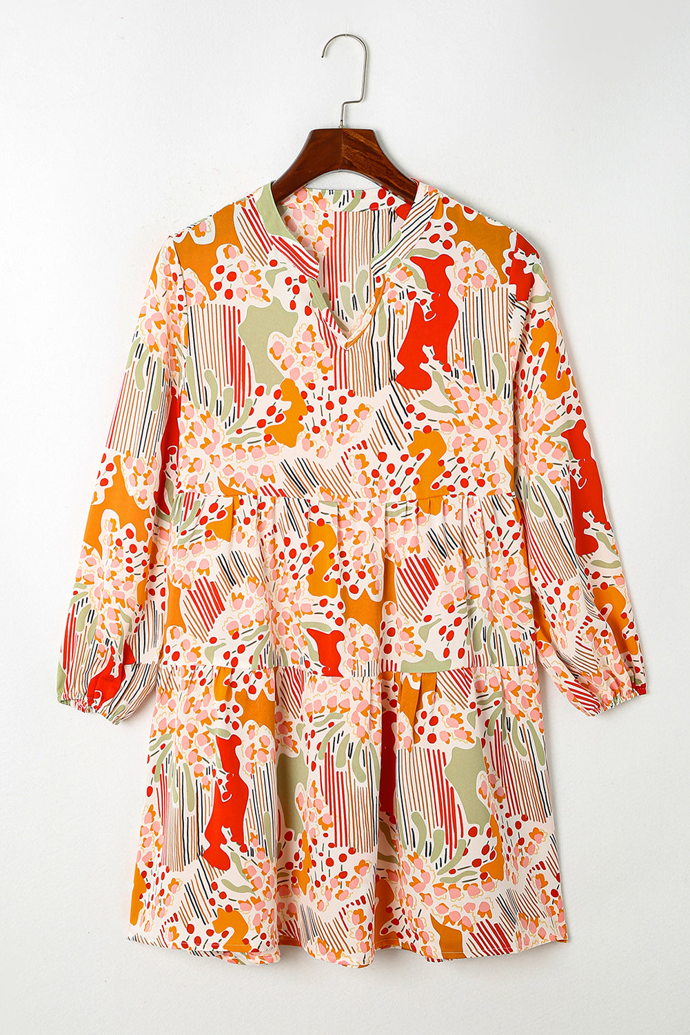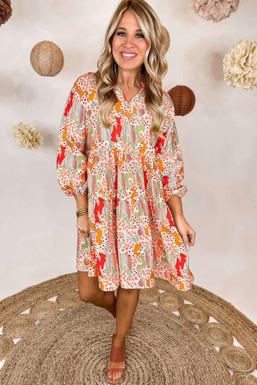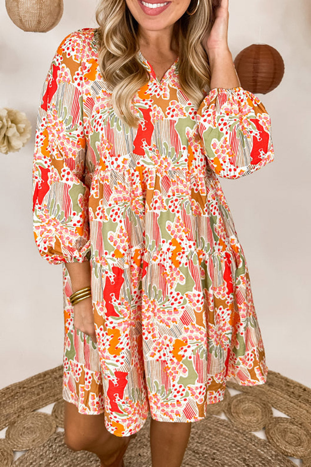 Multicolour Split Neck Puff Sleeve Flowy Printed Dress