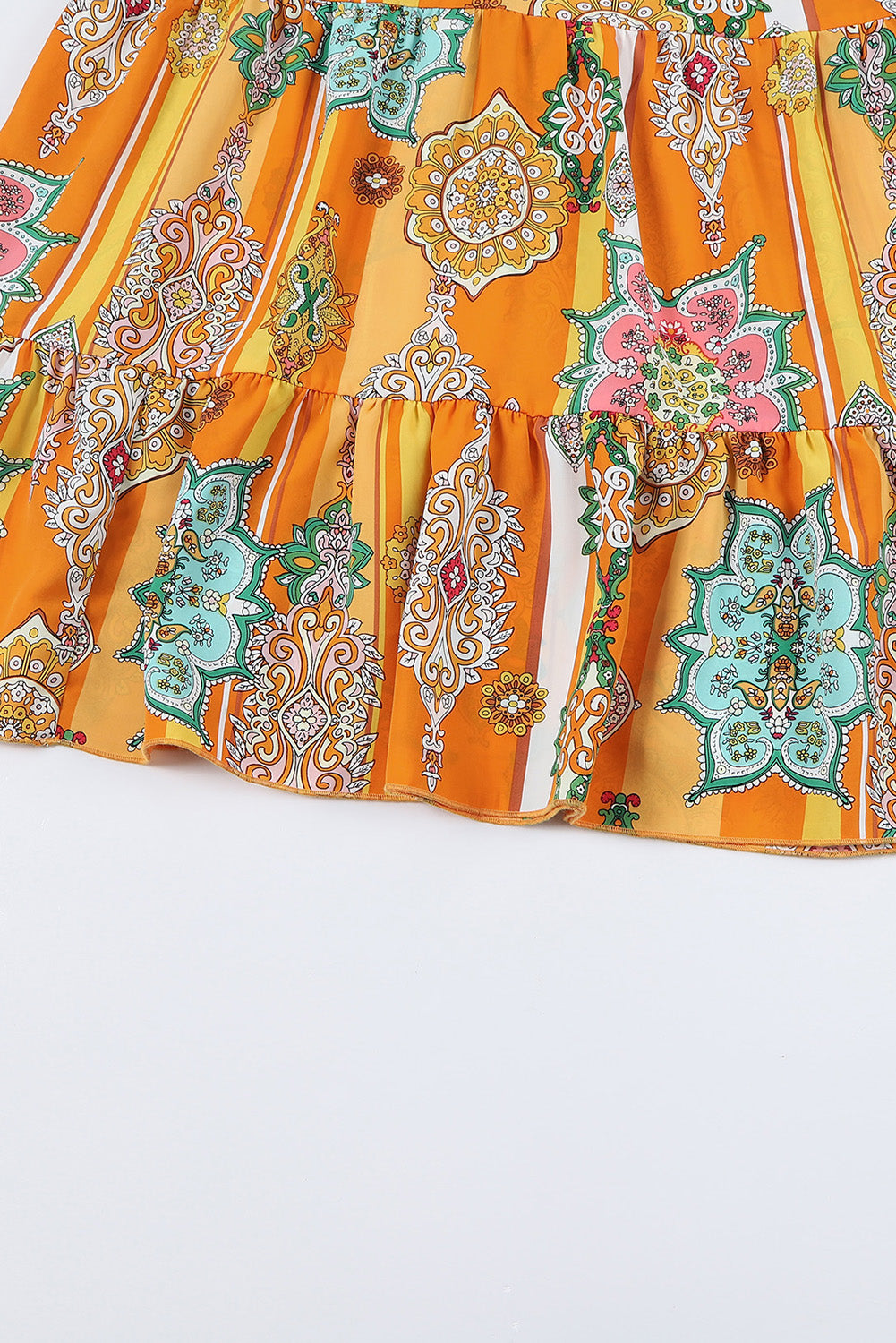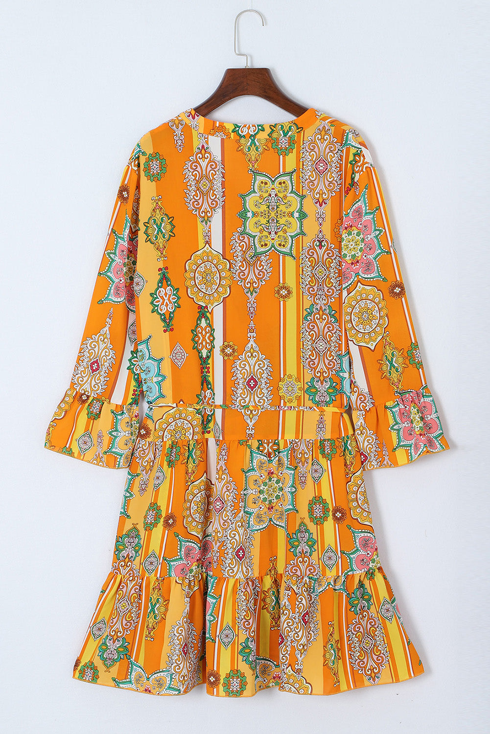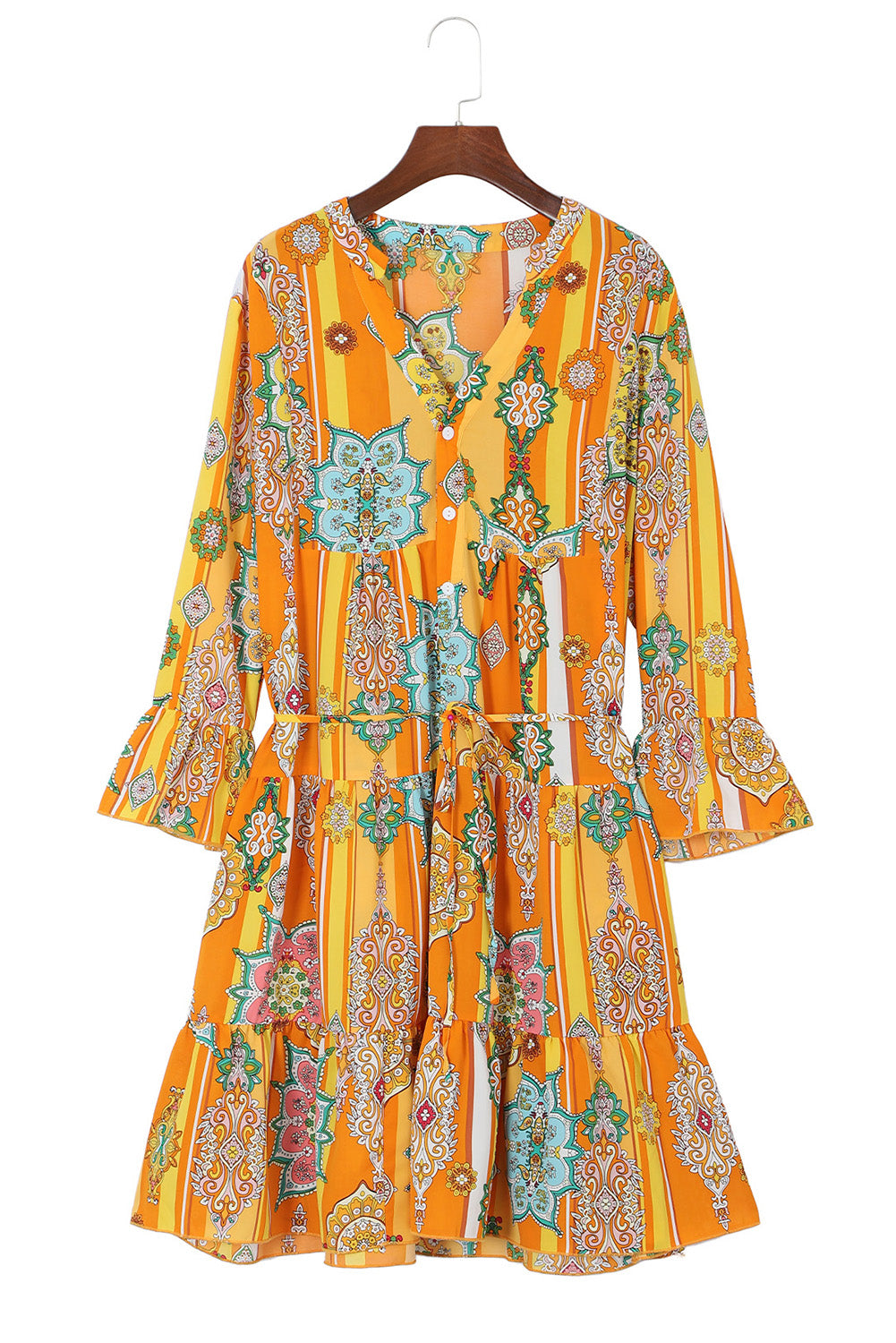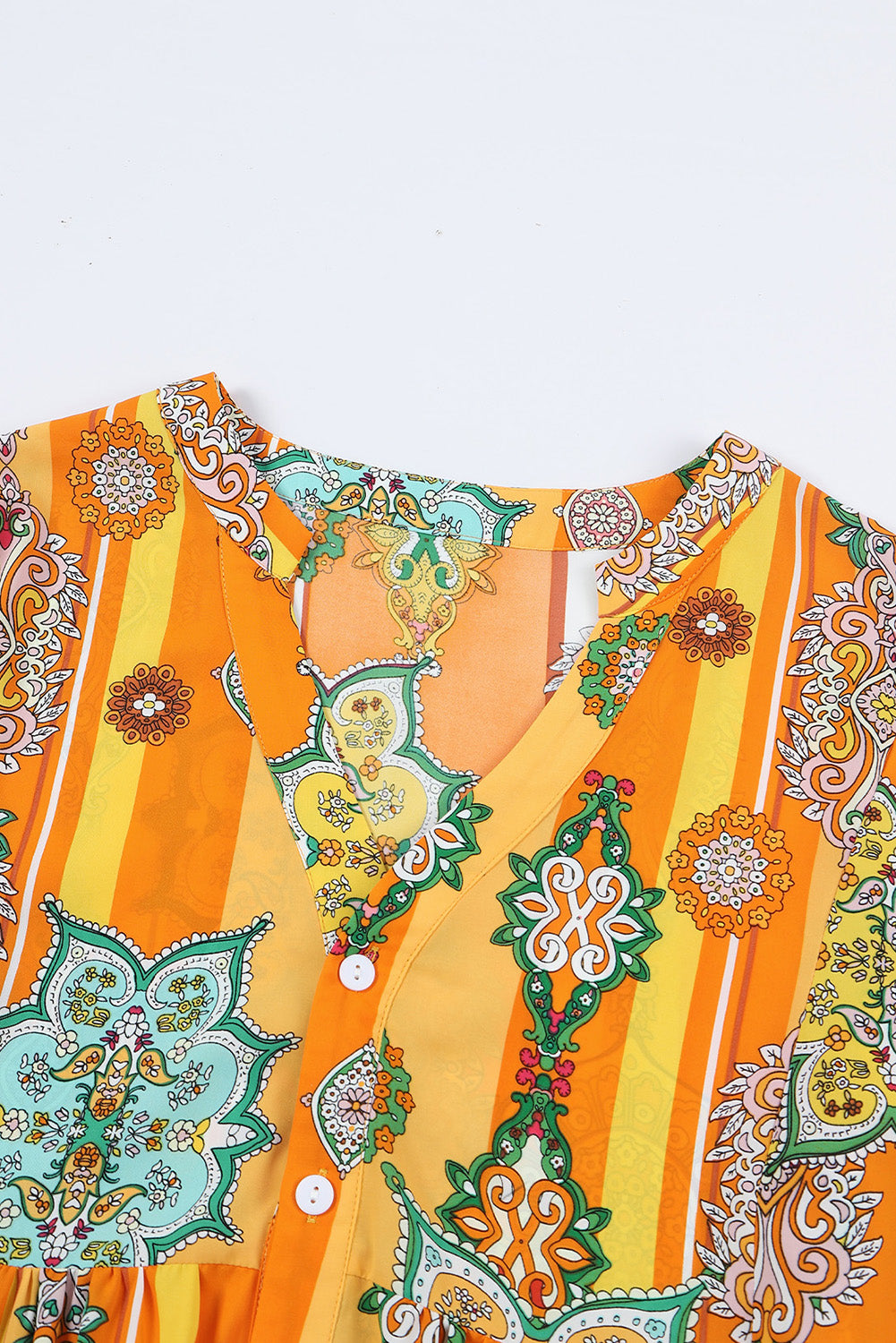 Orange Boho Geometric Print Buttoned V Neck Mini Dress
