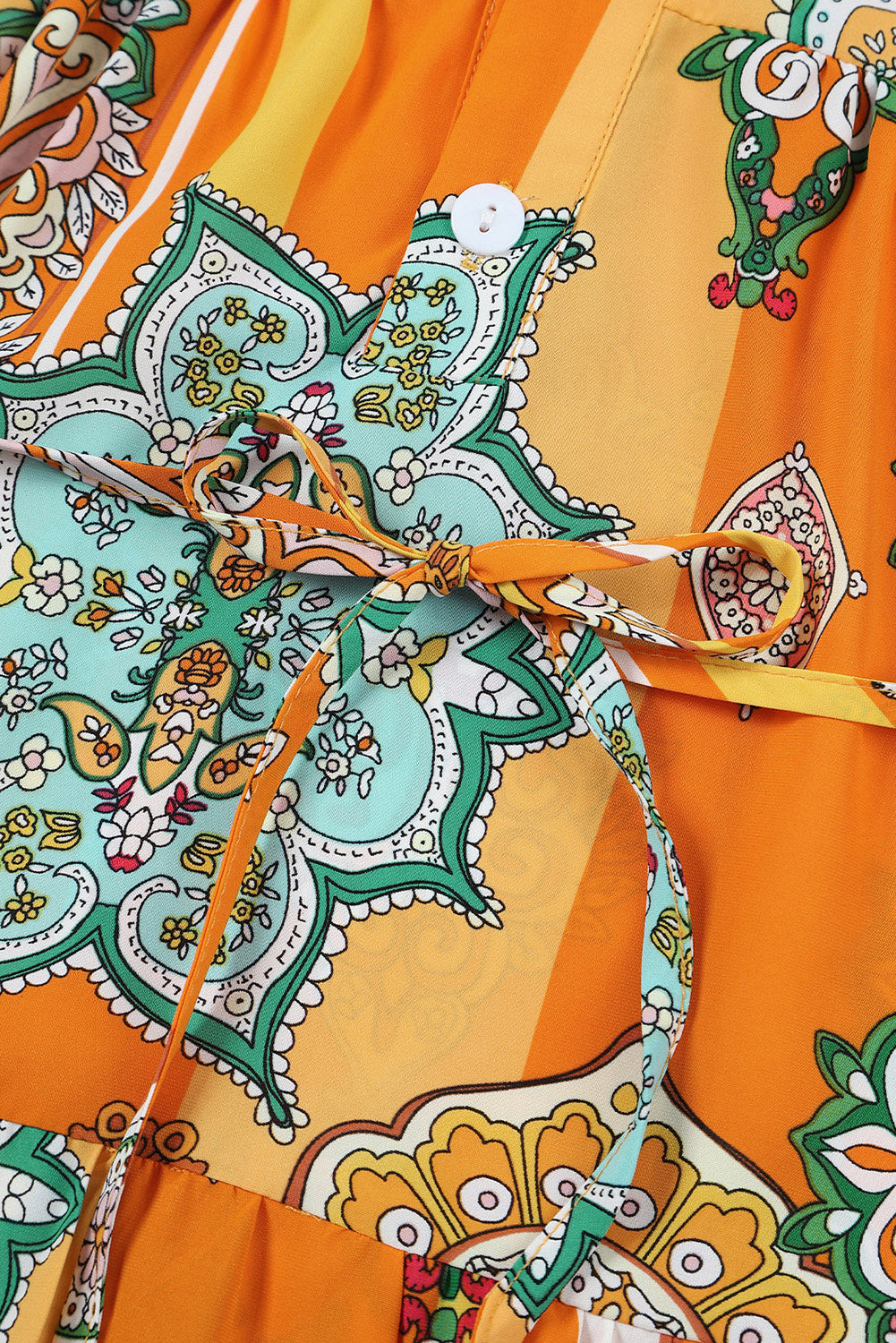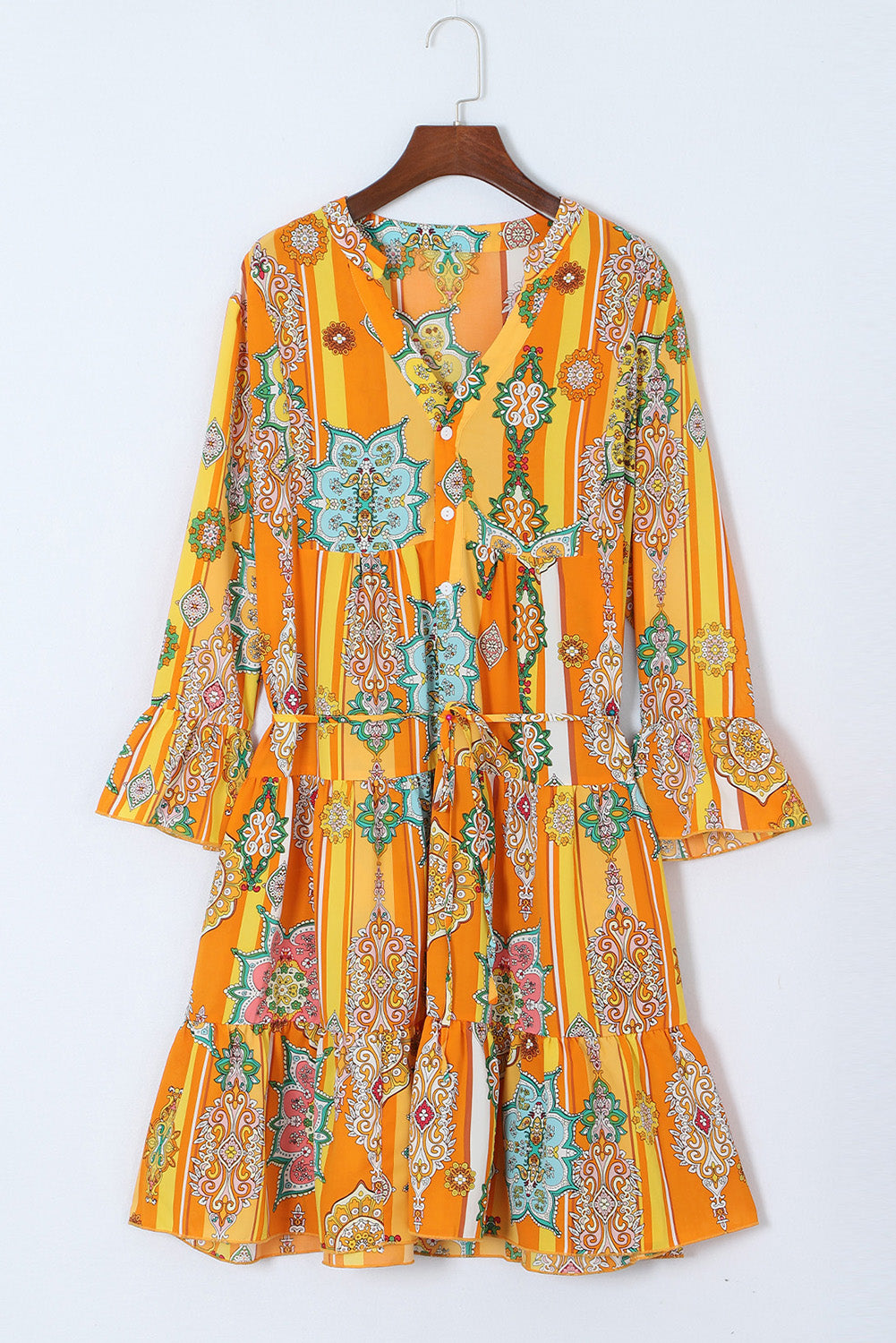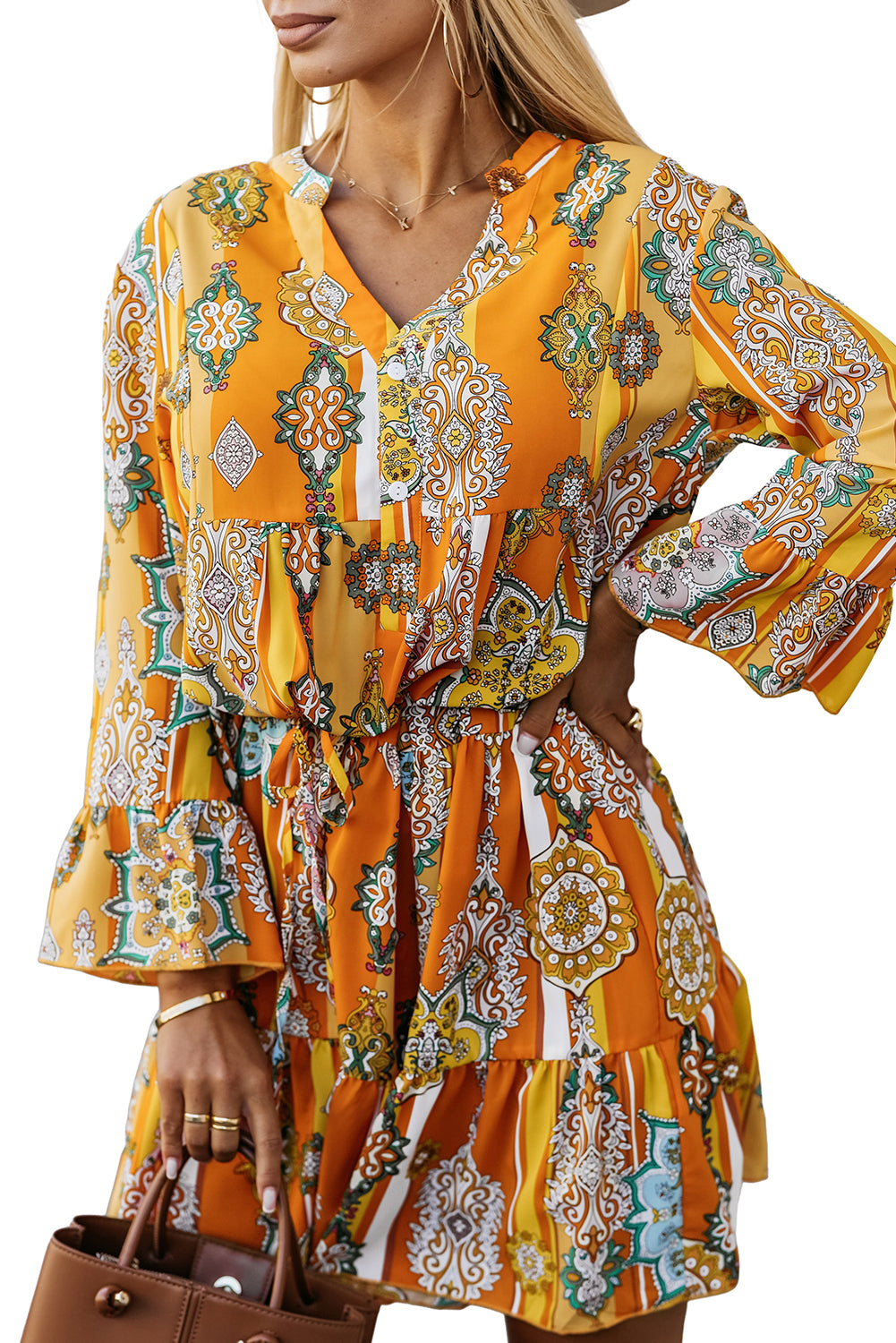 Orange Boho Geometric Print Buttoned V Neck Mini Dress