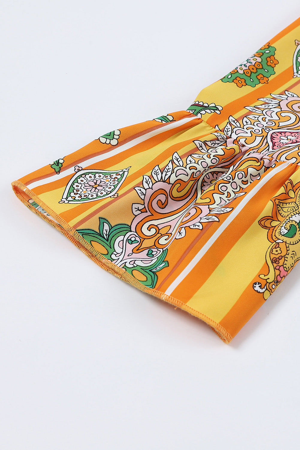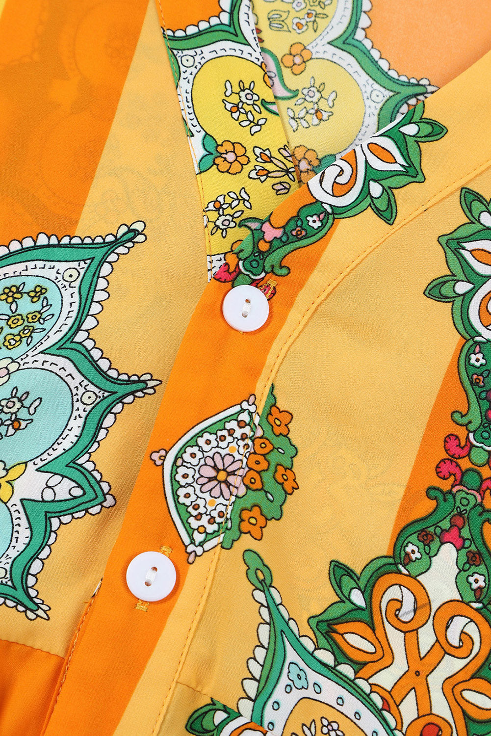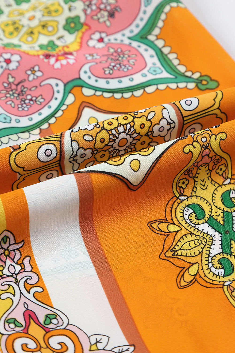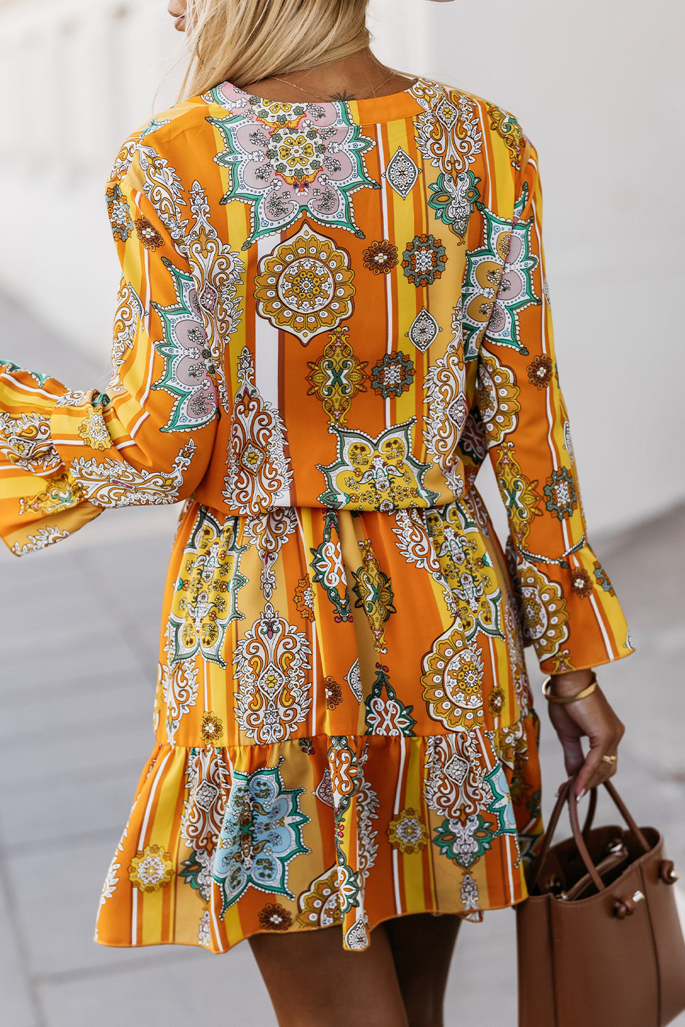 Orange Boho Geometric Print Buttoned V Neck Mini Dress