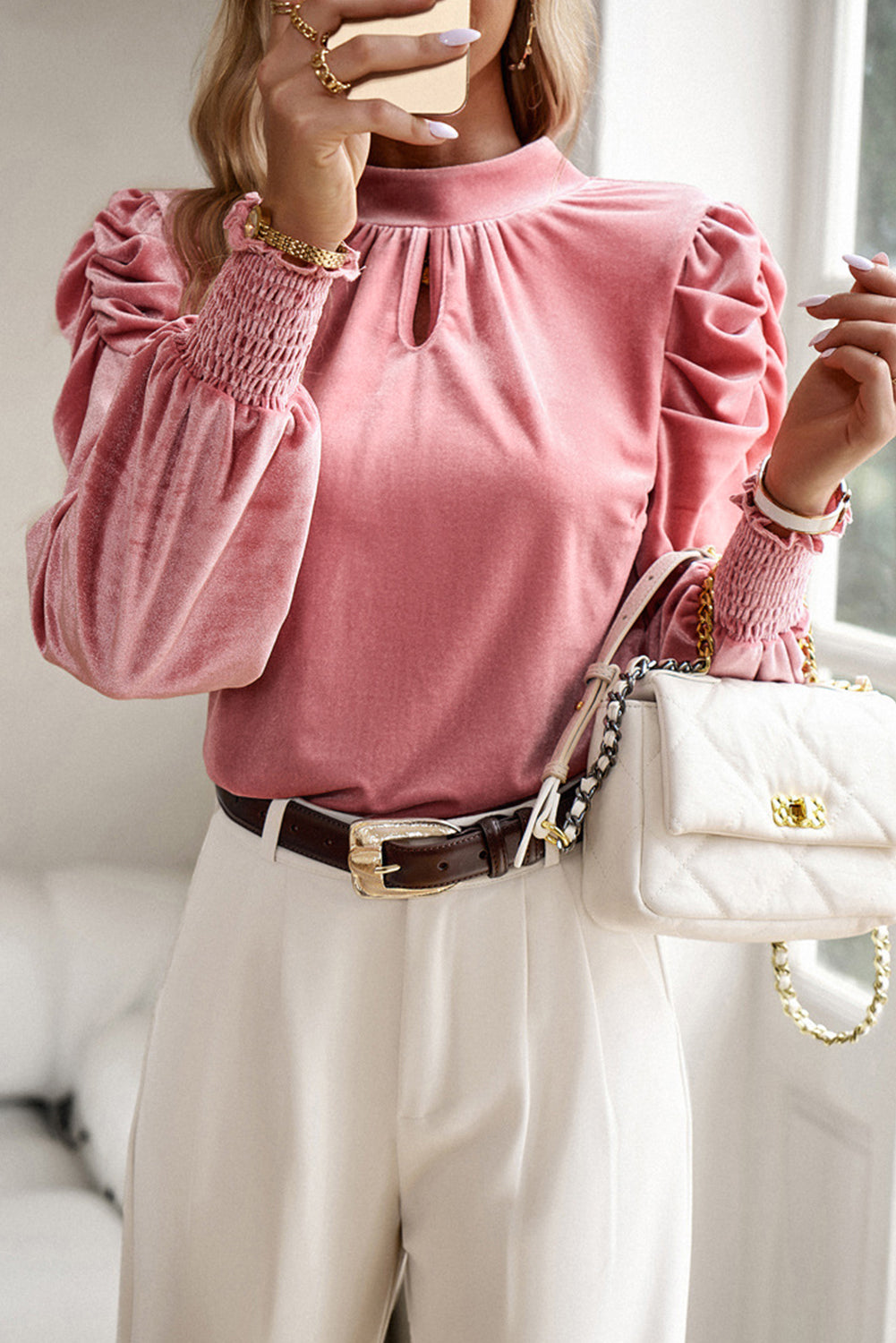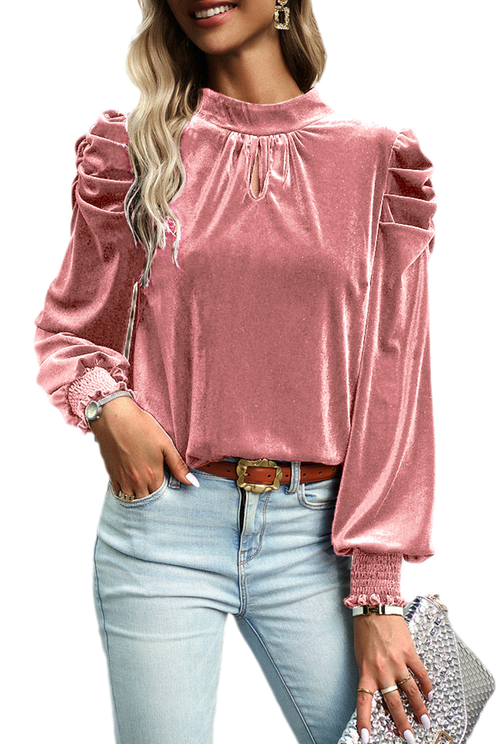 Peach Blossom Fiery Mock Neck Puff Sleeve Velvet Blouse