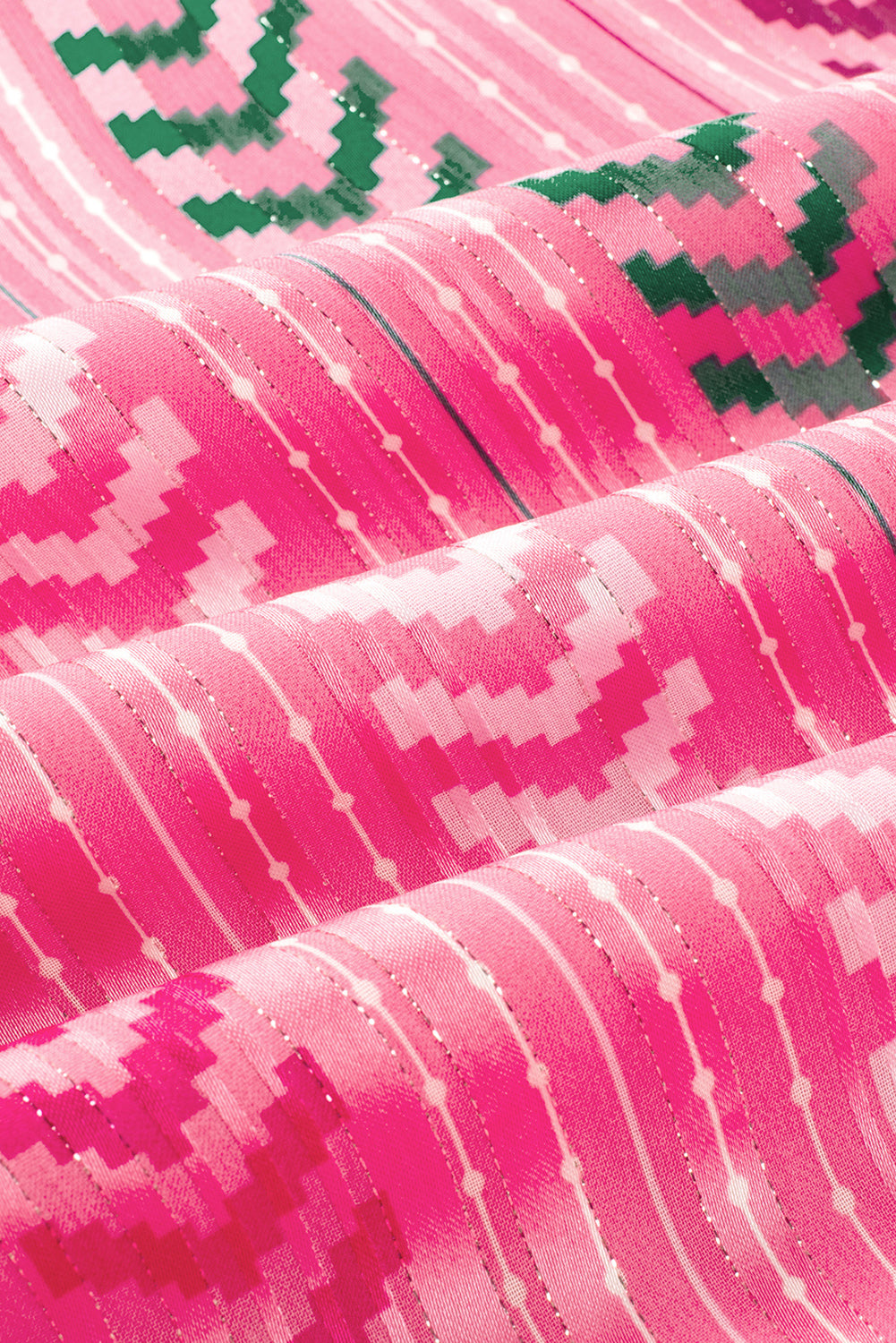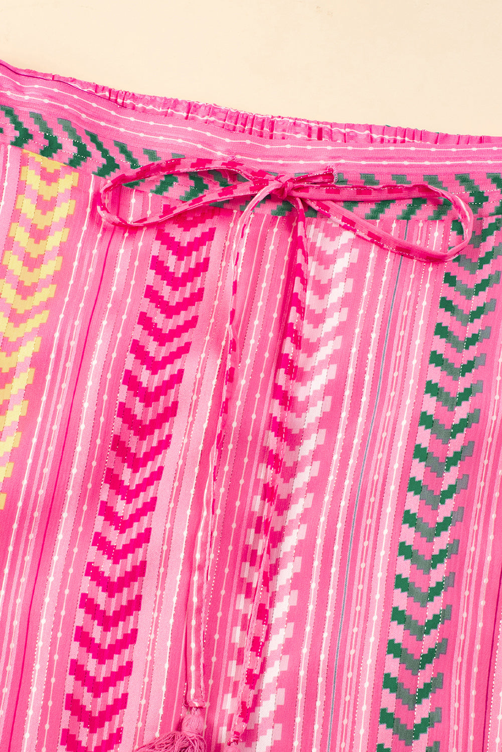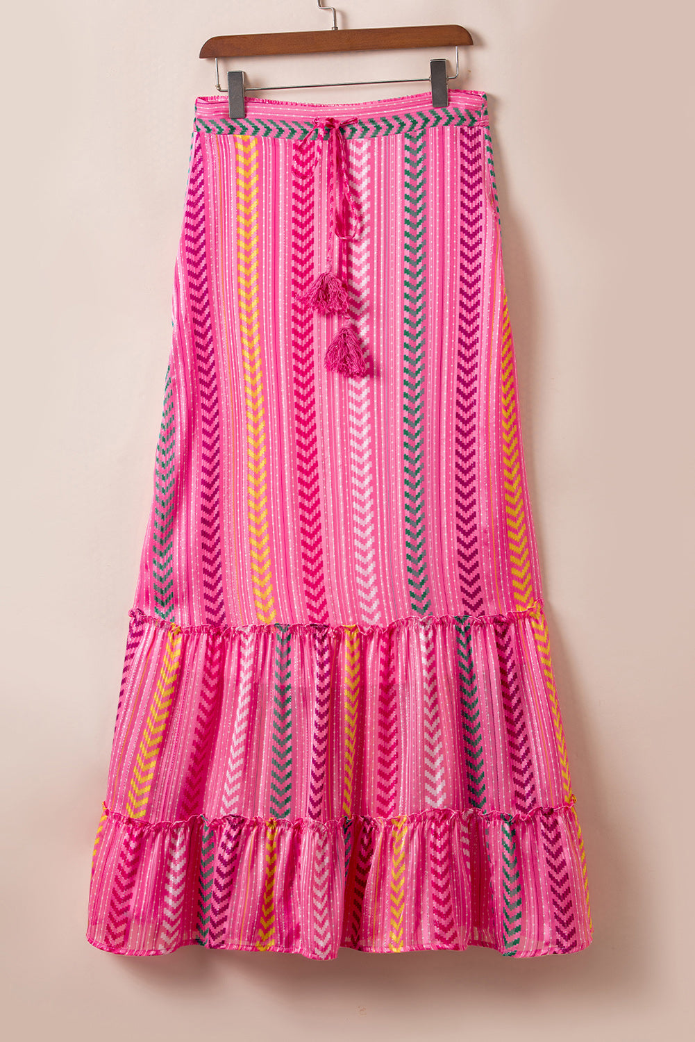 Pink Boho Printed Tasseled Drawstring Ruffled Maxi Skirt