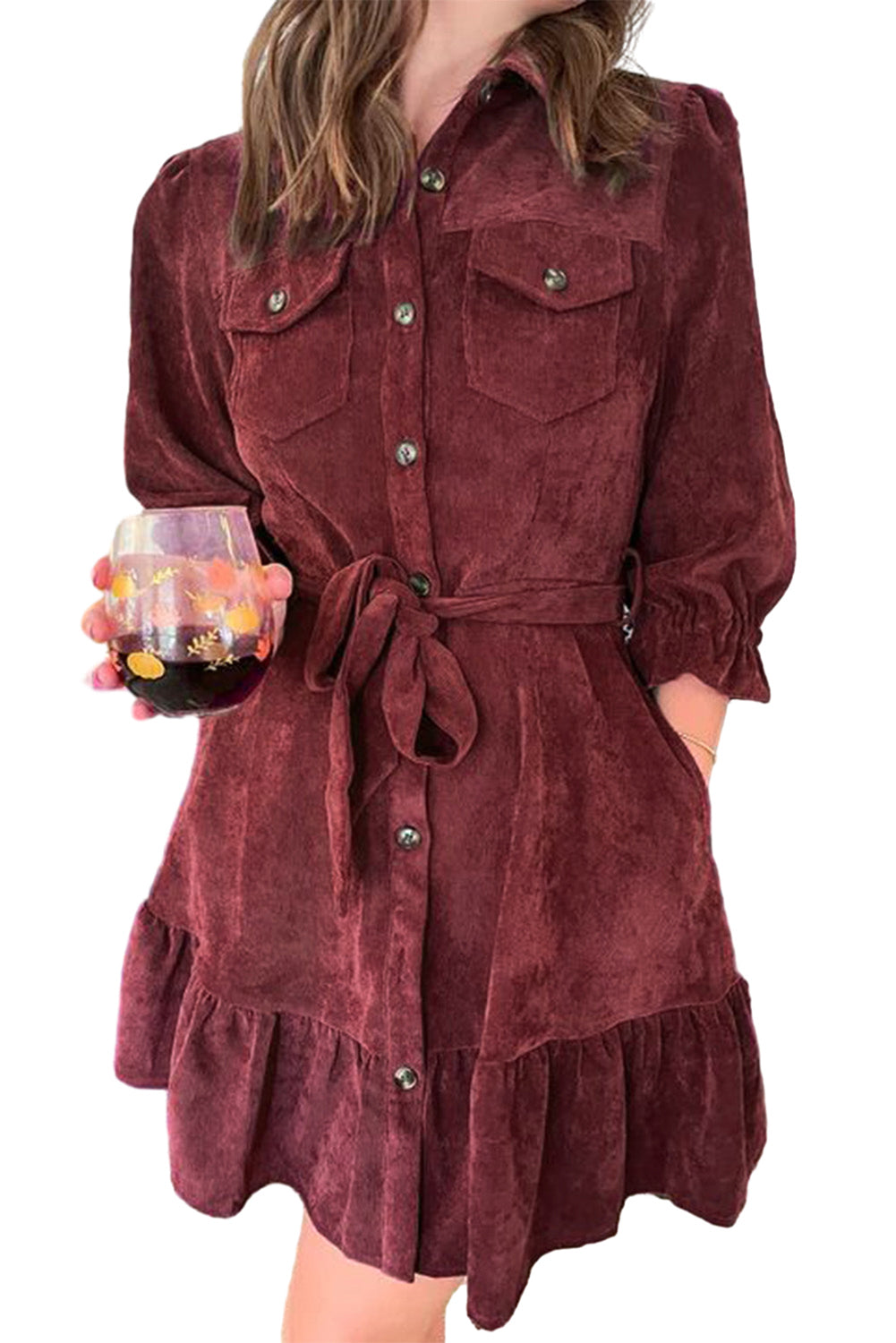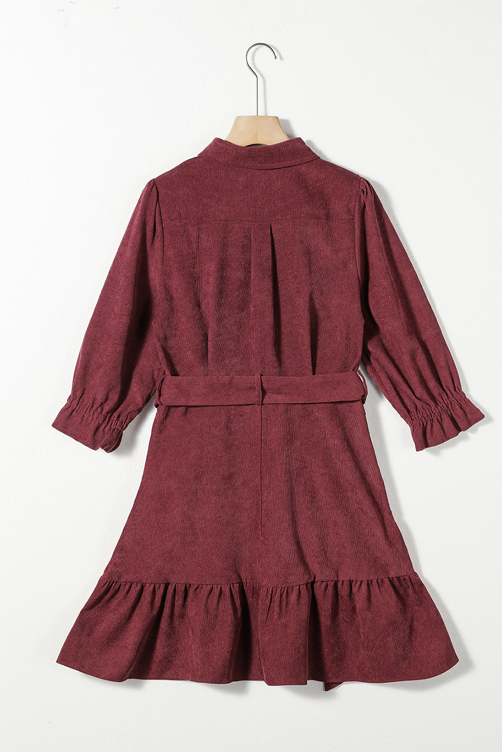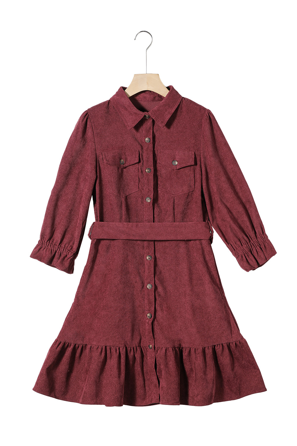 Red Dahlia Collared Buttons Front Ruffled Hem Shirt Corduroy Dress