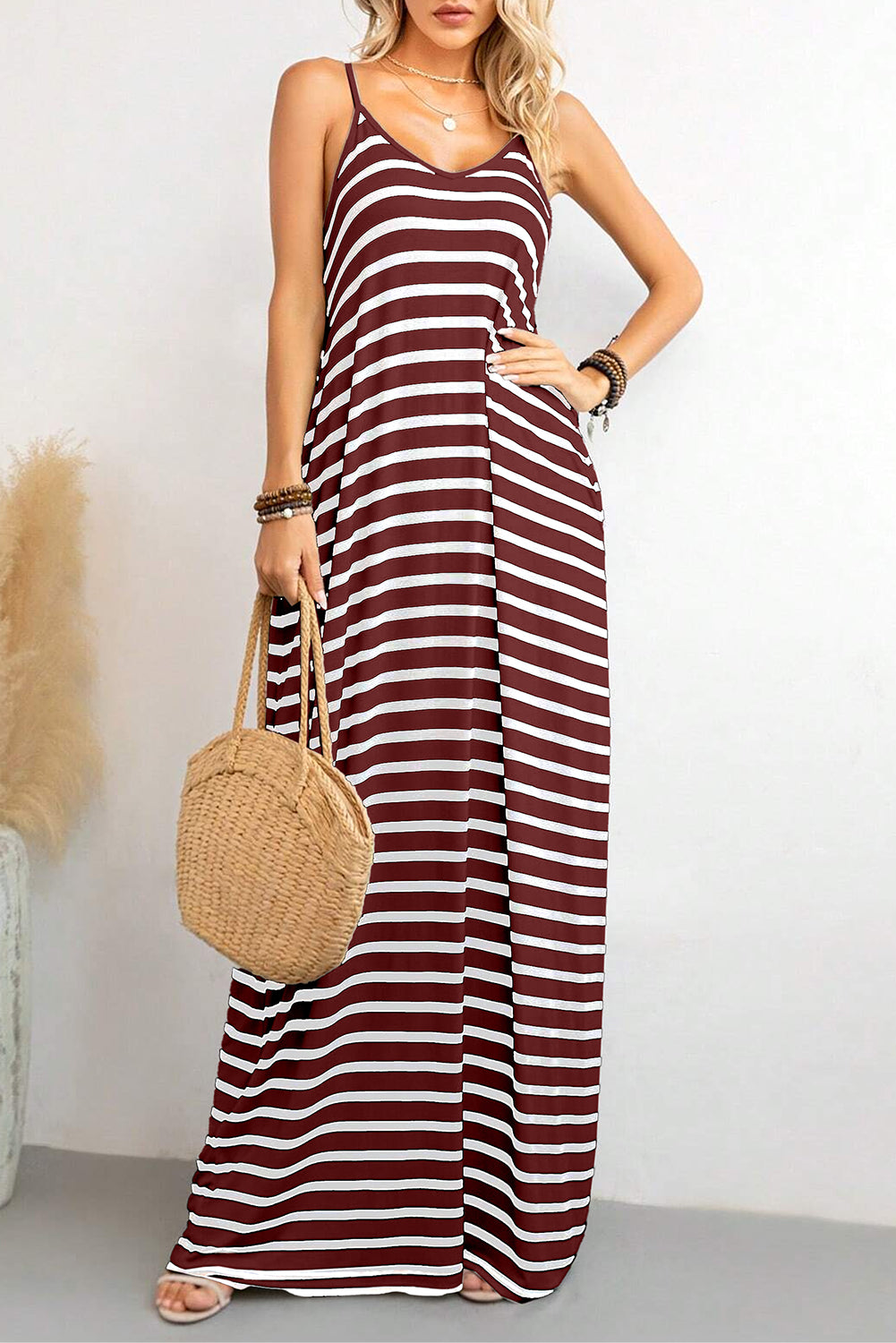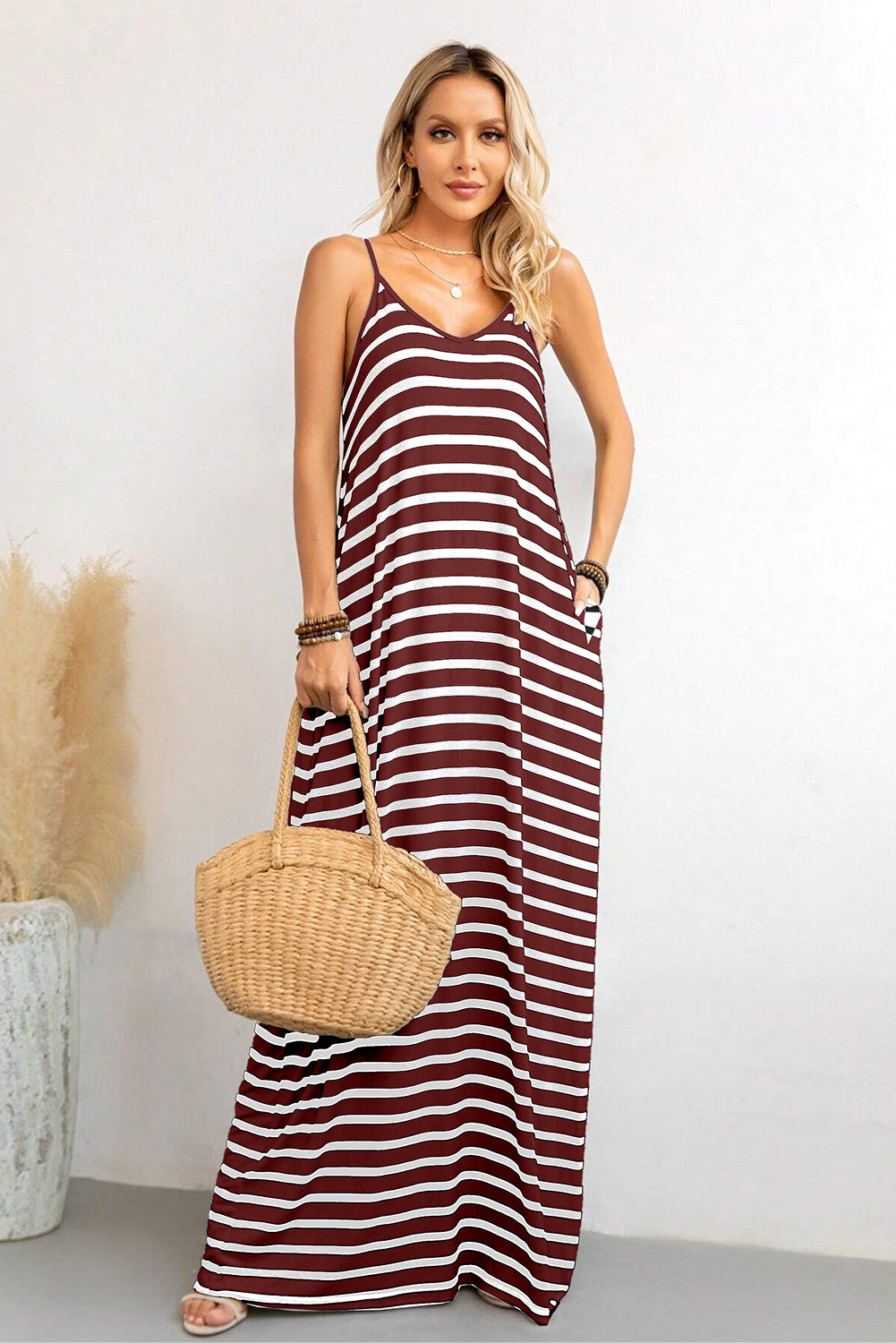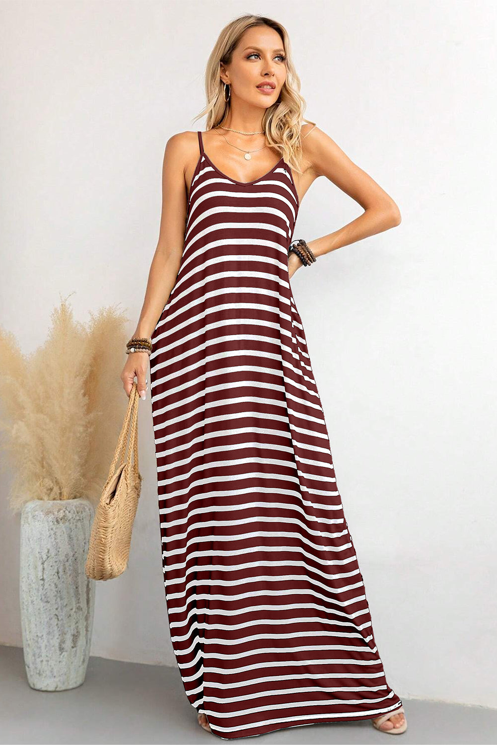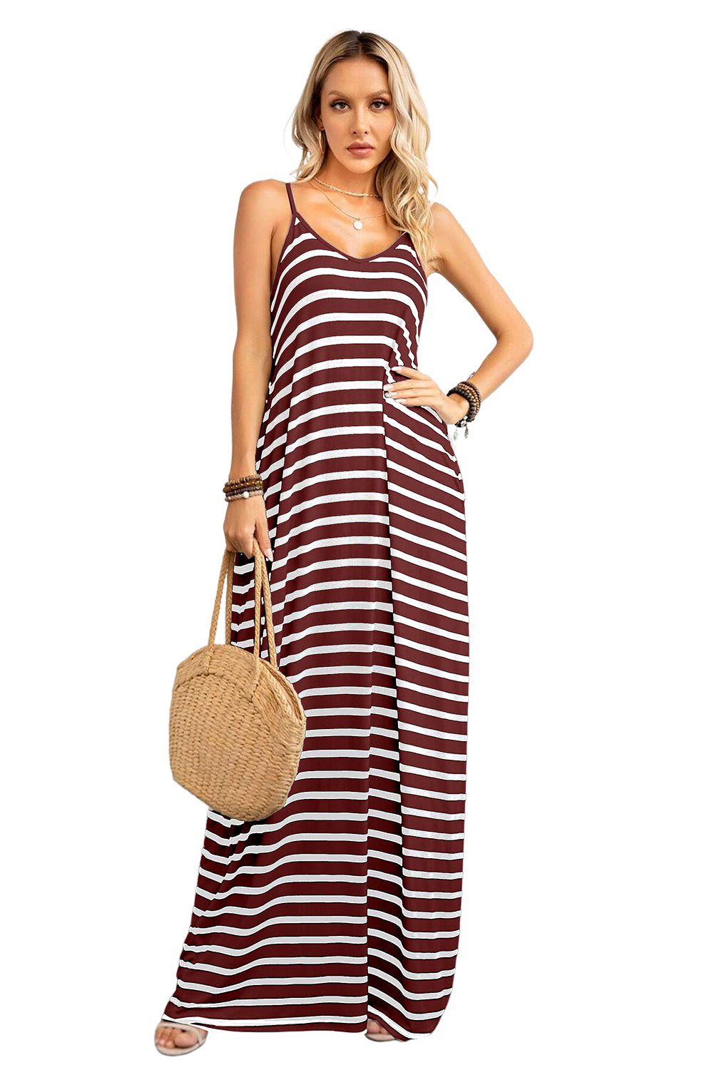 Red Stripe Side Pockets Spaghetti Straps Maxi Dress