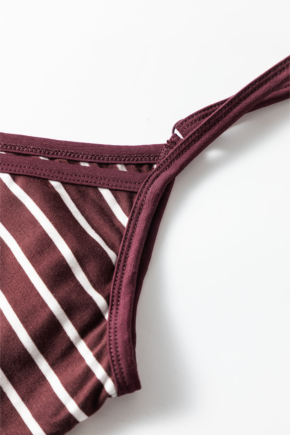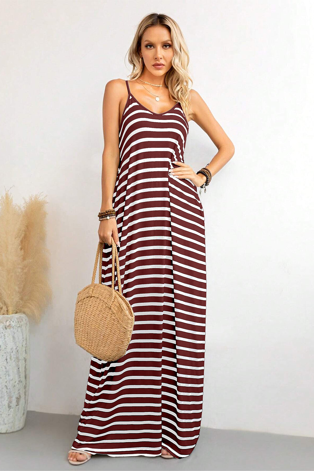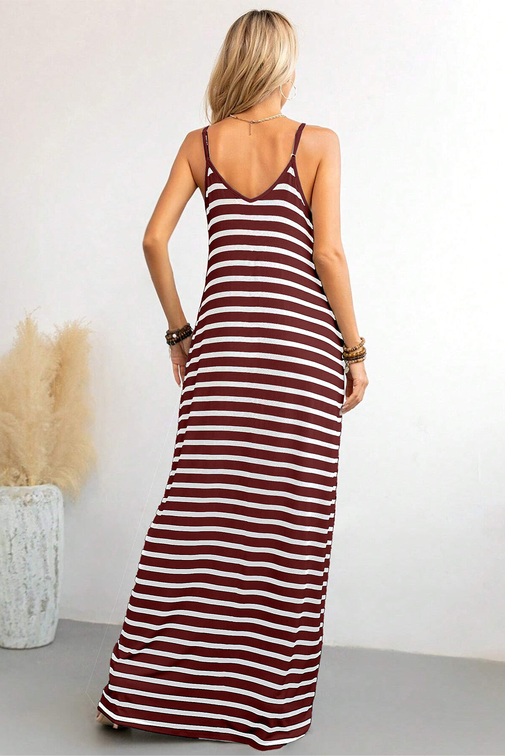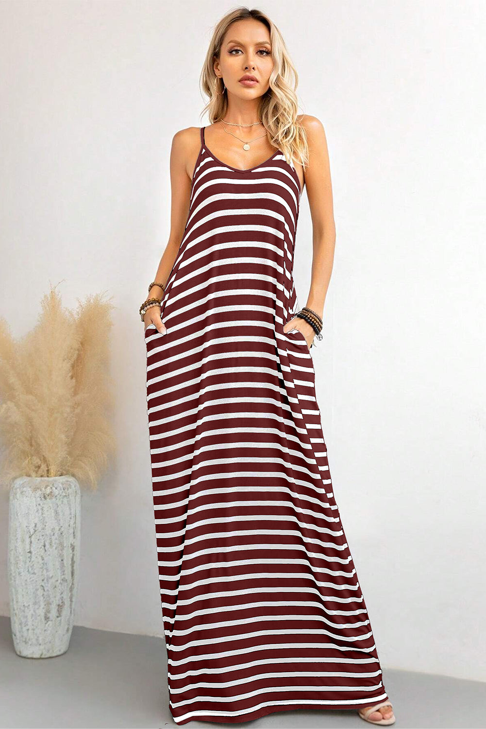 Red Stripe Side Pockets Spaghetti Straps Maxi Dress