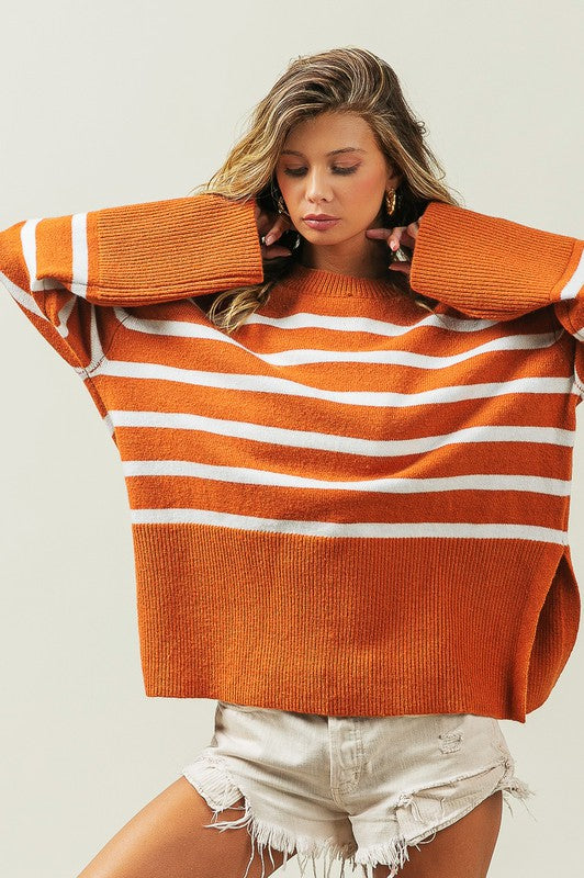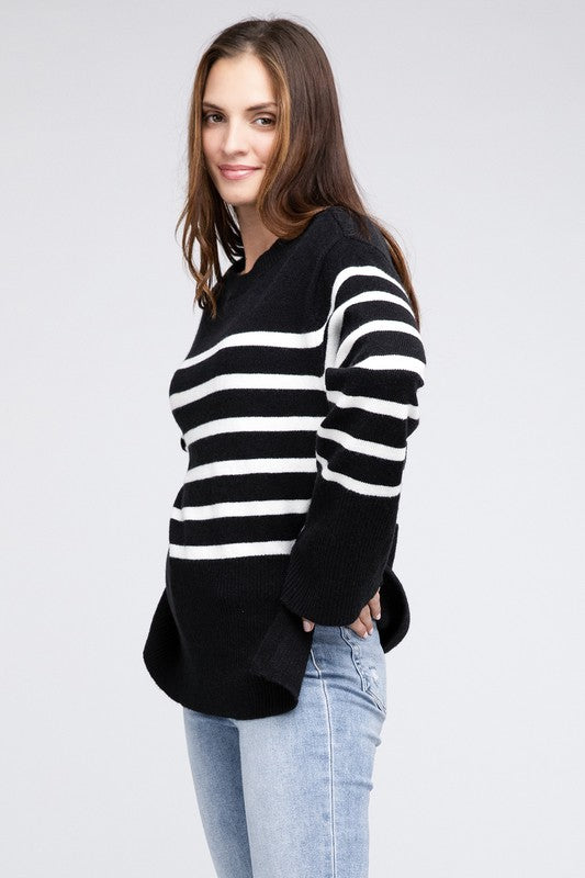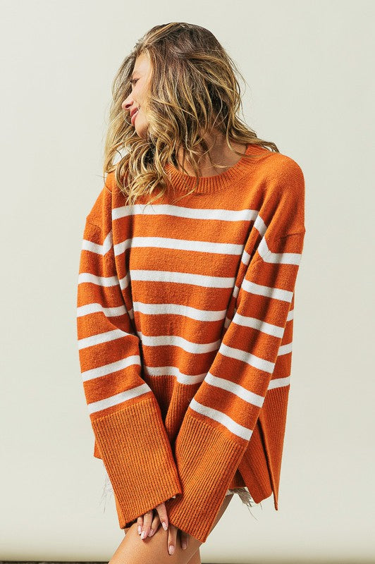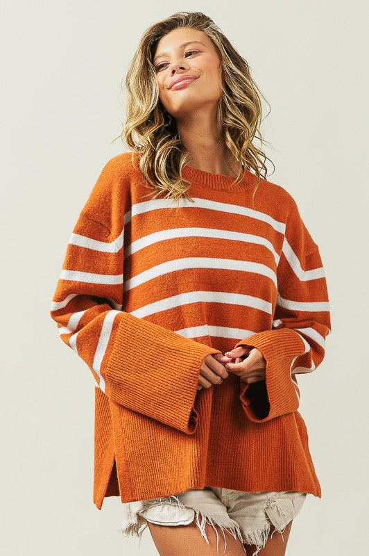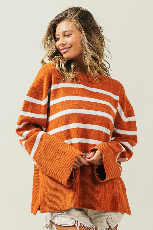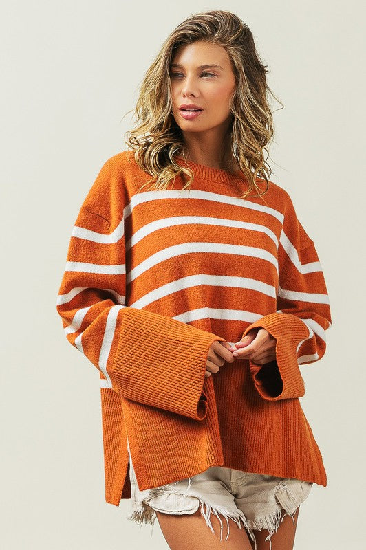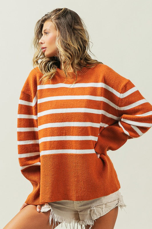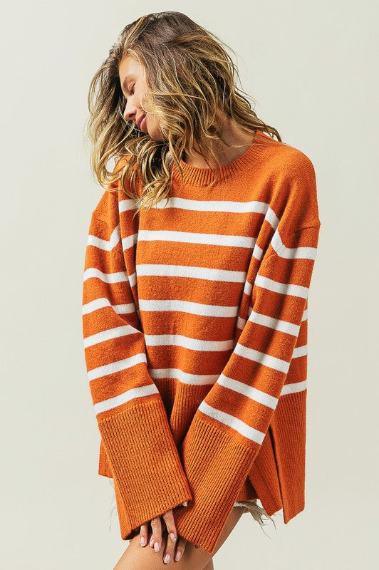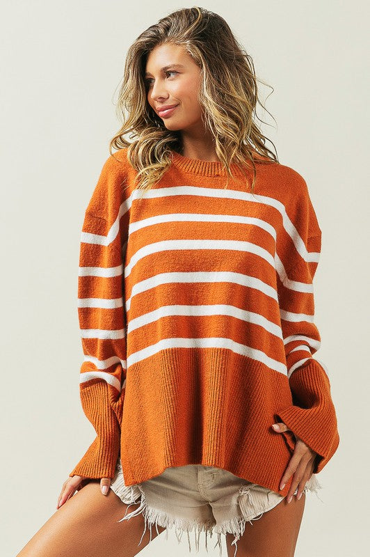 Introducing our Ribbed Hem Stripe Sweater, a modern twist on classic comfort. This sweater combines timeless style with contemporary flair, featuring a sleek ribbed hem design and subtle stripes for a sophisticated look. Crafted with attention to detail and made from cozy fabric, this sweater strikes the perfect balance between fashion and comfort.
