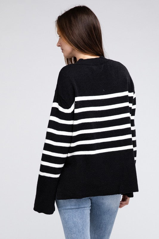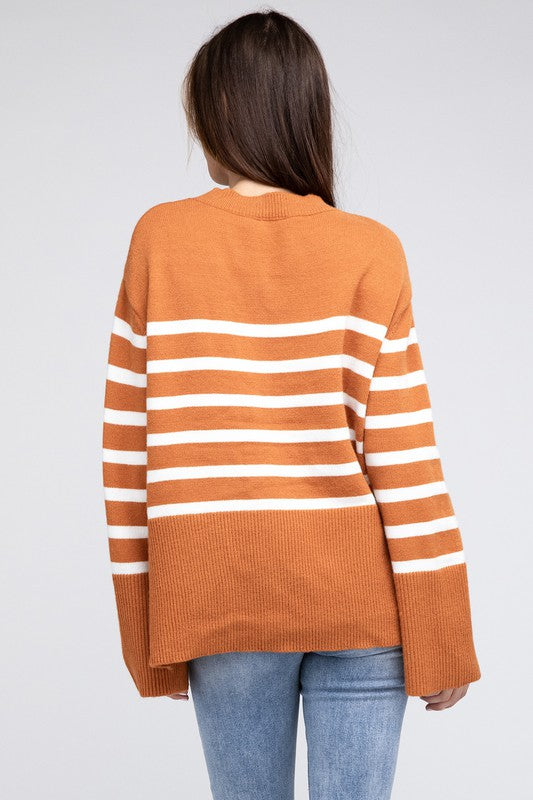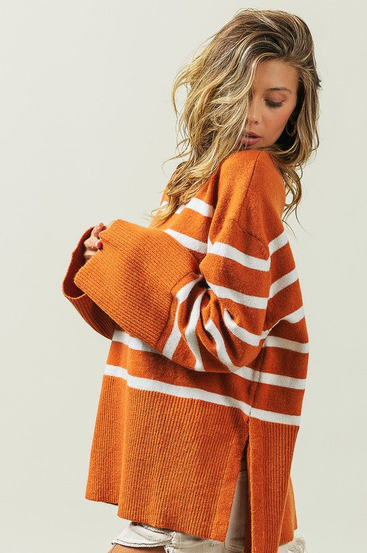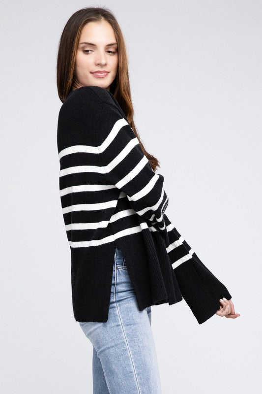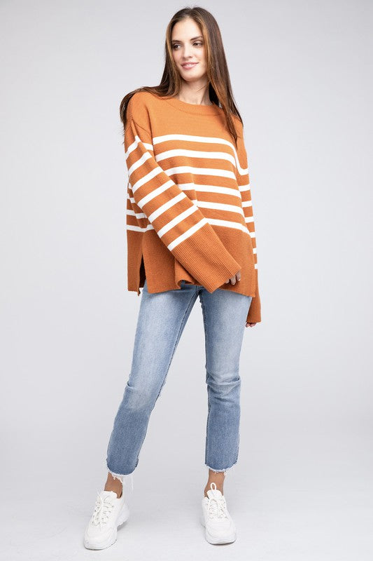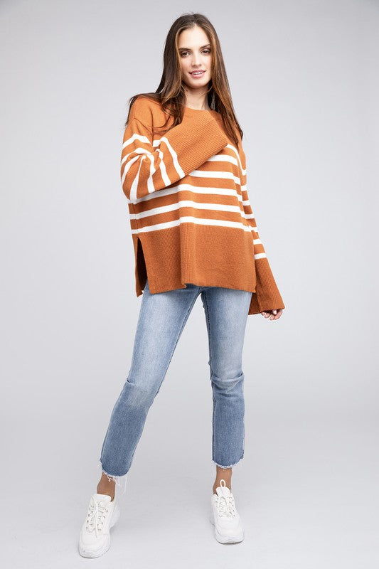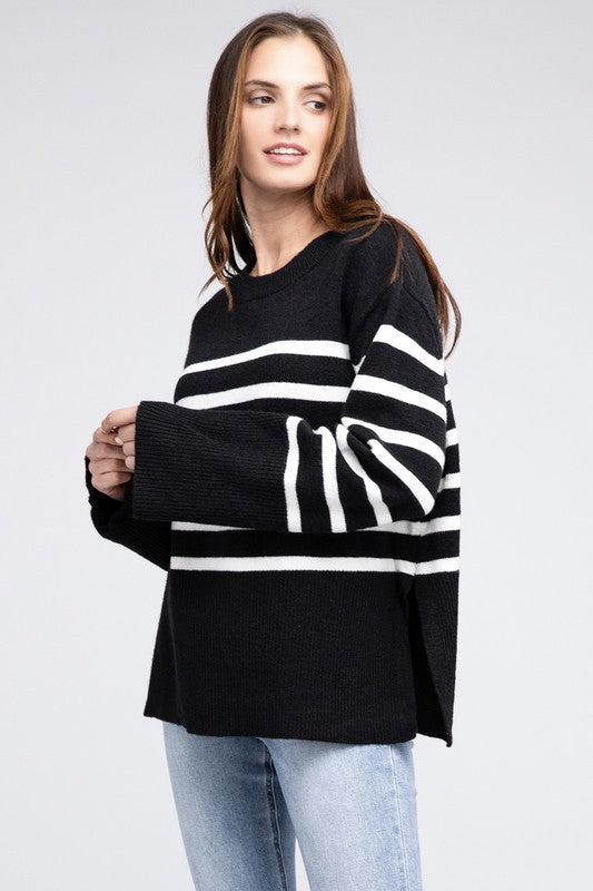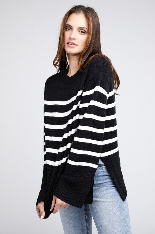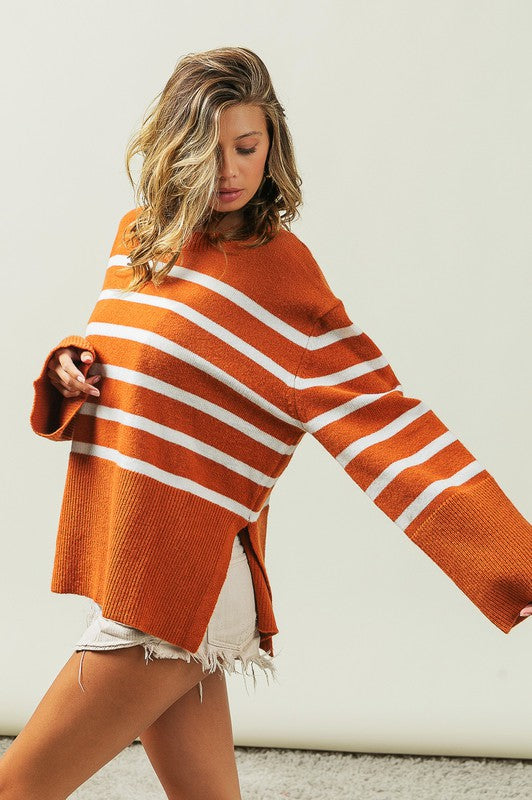 Introducing our Ribbed Hem Stripe Sweater, a modern twist on classic comfort. This sweater combines timeless style with contemporary flair, featuring a sleek ribbed hem design and subtle stripes for a sophisticated look. Crafted with attention to detail and made from cozy fabric, this sweater strikes the perfect balance between fashion and comfort.