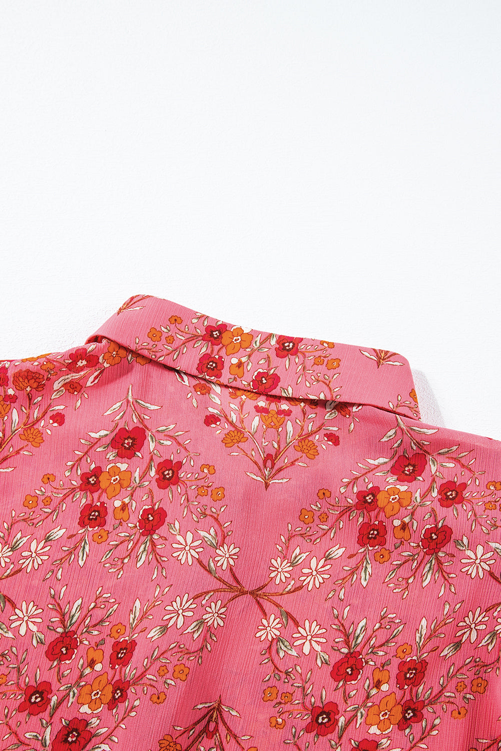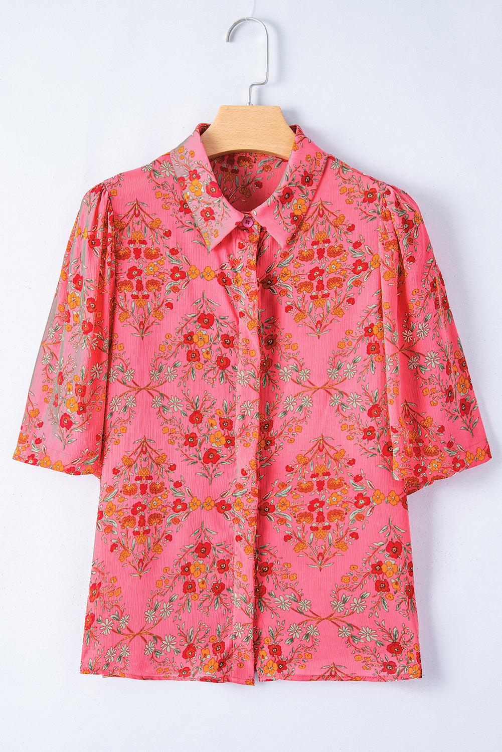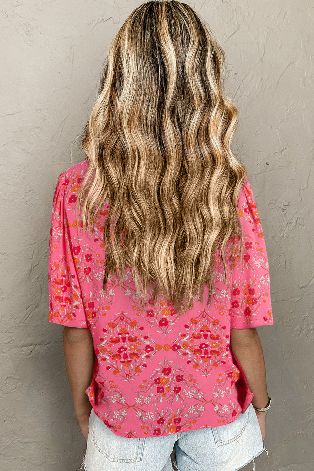 Rose Red Floral Print Wide Short Sleeve Loose Shirt