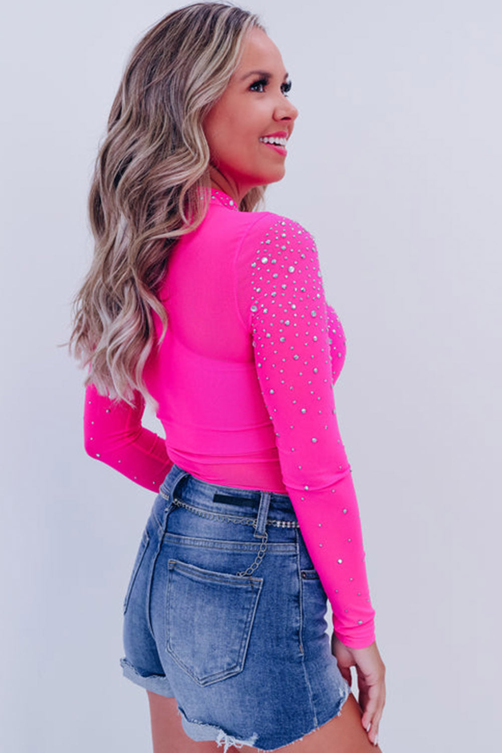 Rose Rhinestone Mesh Long Sleeve Bodysuit