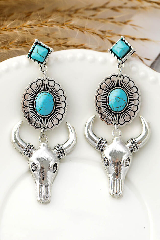 Silver Turquoise Gem Stone Flower Steer Head Boho Earrings