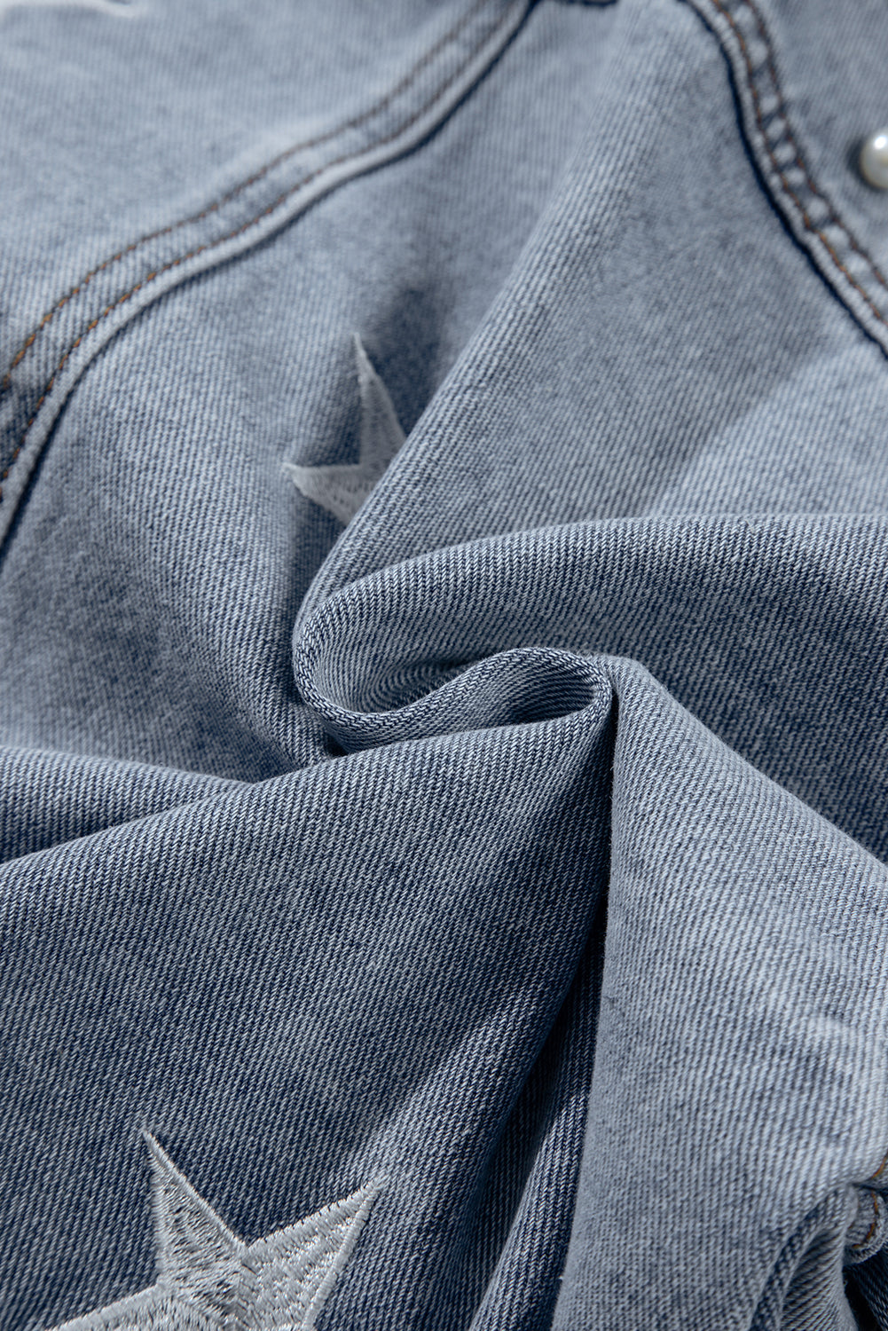 Sky Blue Distressed Pearls Star Cropped Denim Jacket